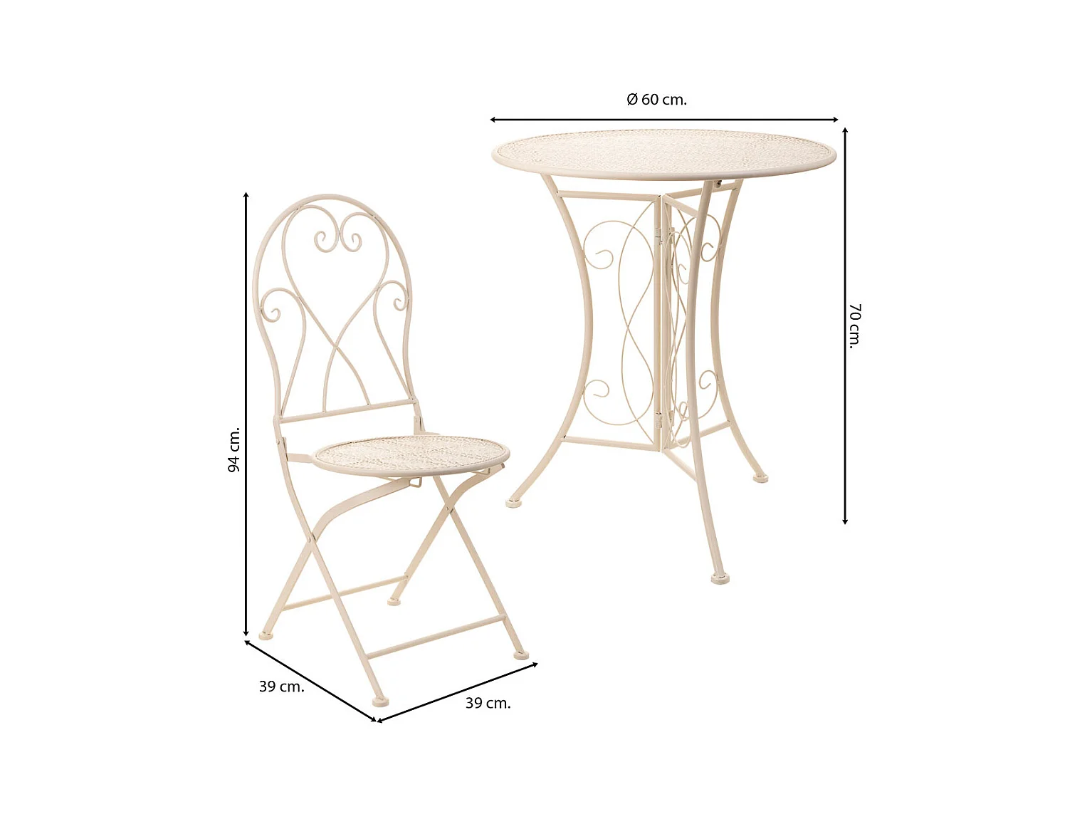 Ensemble table et deux chaises en fer forgé blanc Table D60x70 - chaise 39x39x94