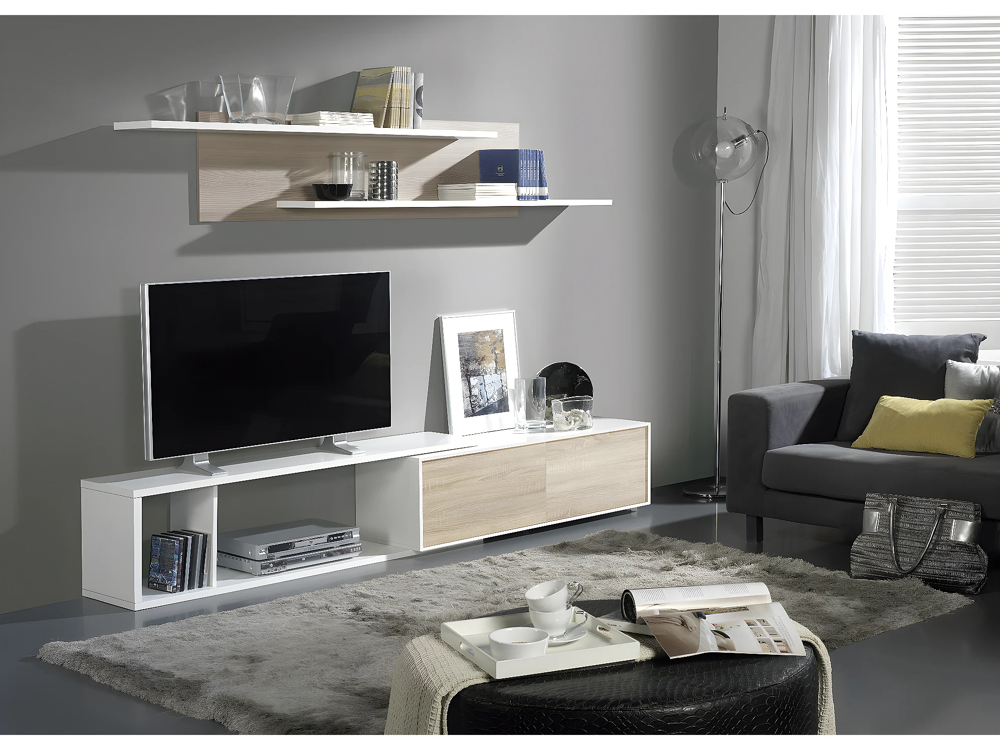Ensemble TV extensible coloris Blanc / Chêne Cambrian - longueur 155-240 x profondeur 35 cm