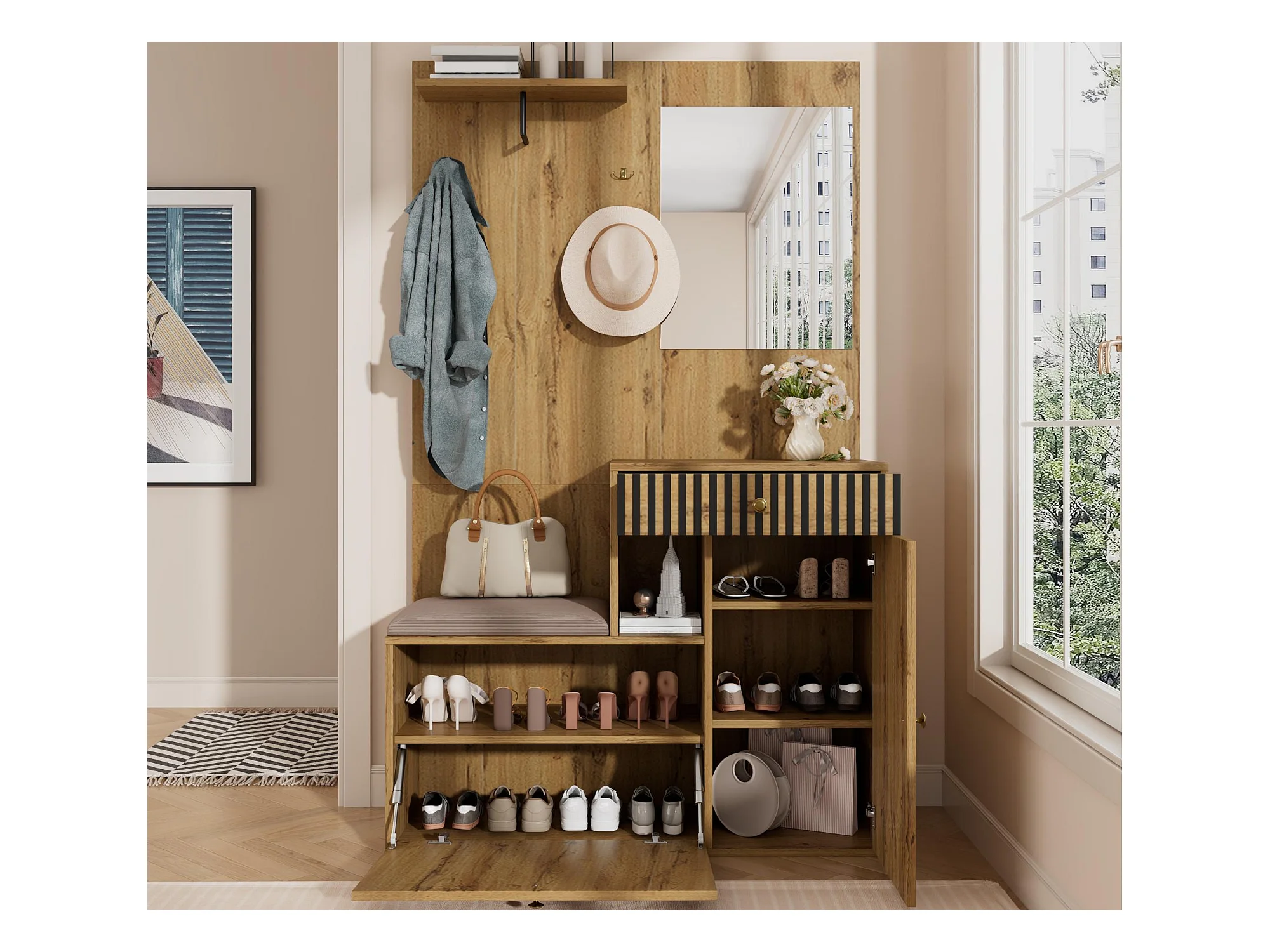 Ensemble vestiaire d'entrée 110x37x185,5 cm - avec miroir et crochets - Meuble à chaussures et banc à chaussures - Naturel