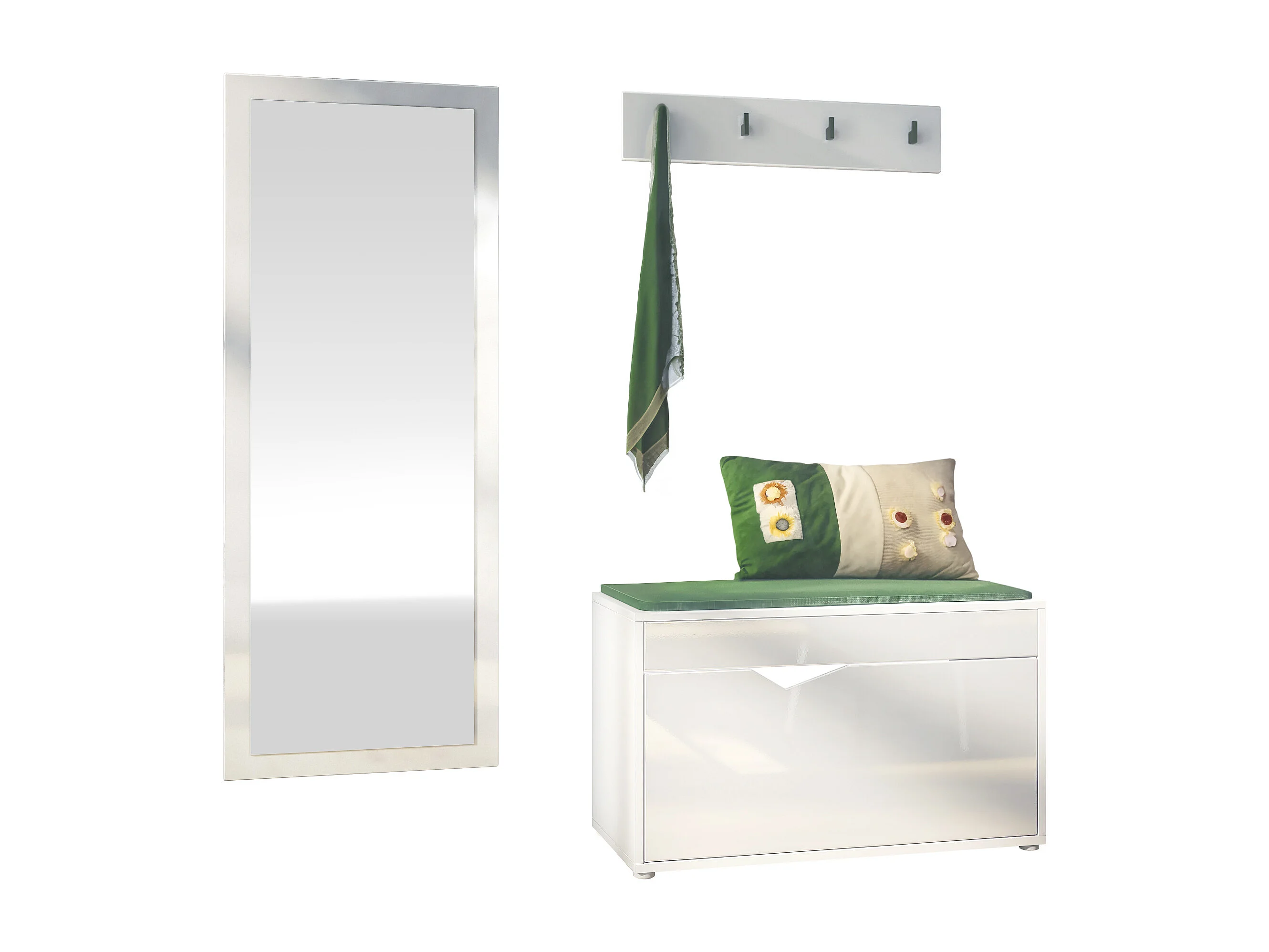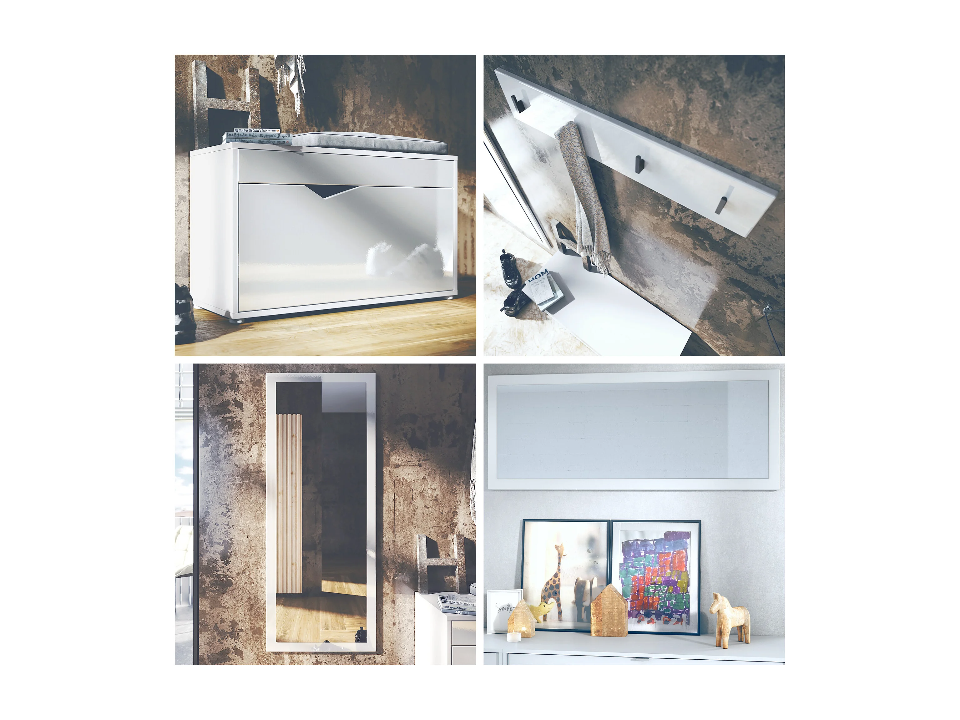 Ensemble Vestiaire Hanko : Comprend 1 Banc à Chaussures, 1 Porte-Manteau et 1 Miroir Murale, blanc mat/blanc haute brillance