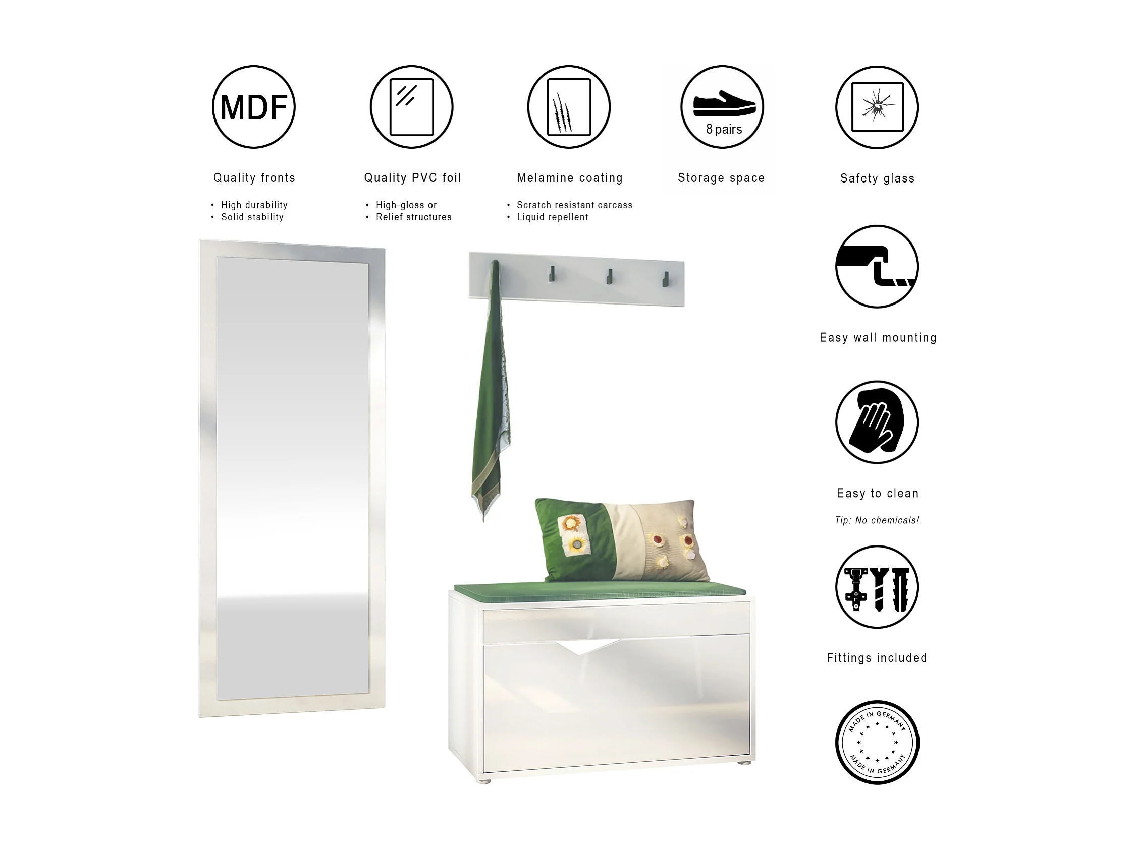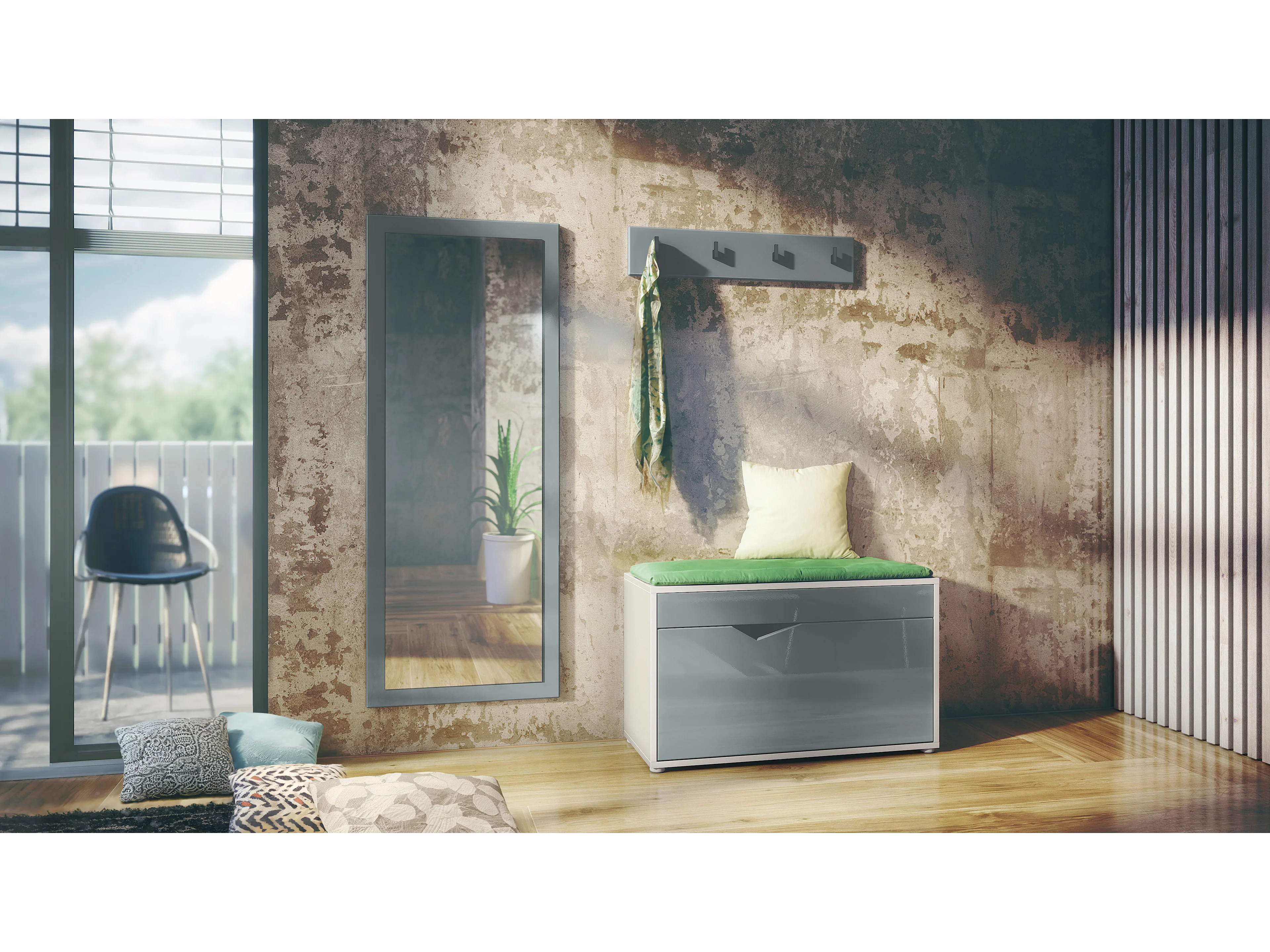 Ensemble Vestiaire Hanko : Comprend 1 Banc à Chaussures, 1 Porte-Manteau et 1 Miroir Murale, blanc mat/gris haute brillance