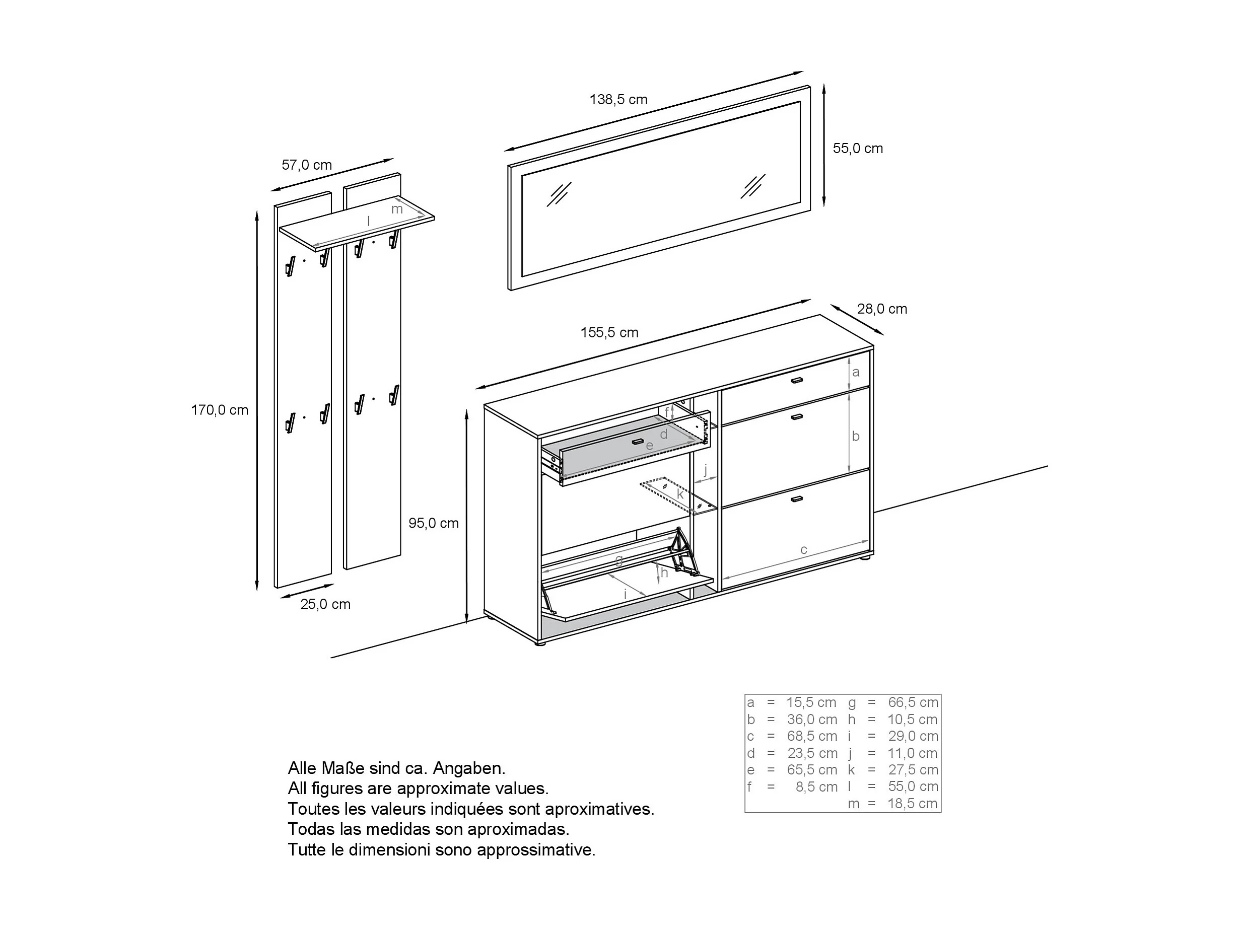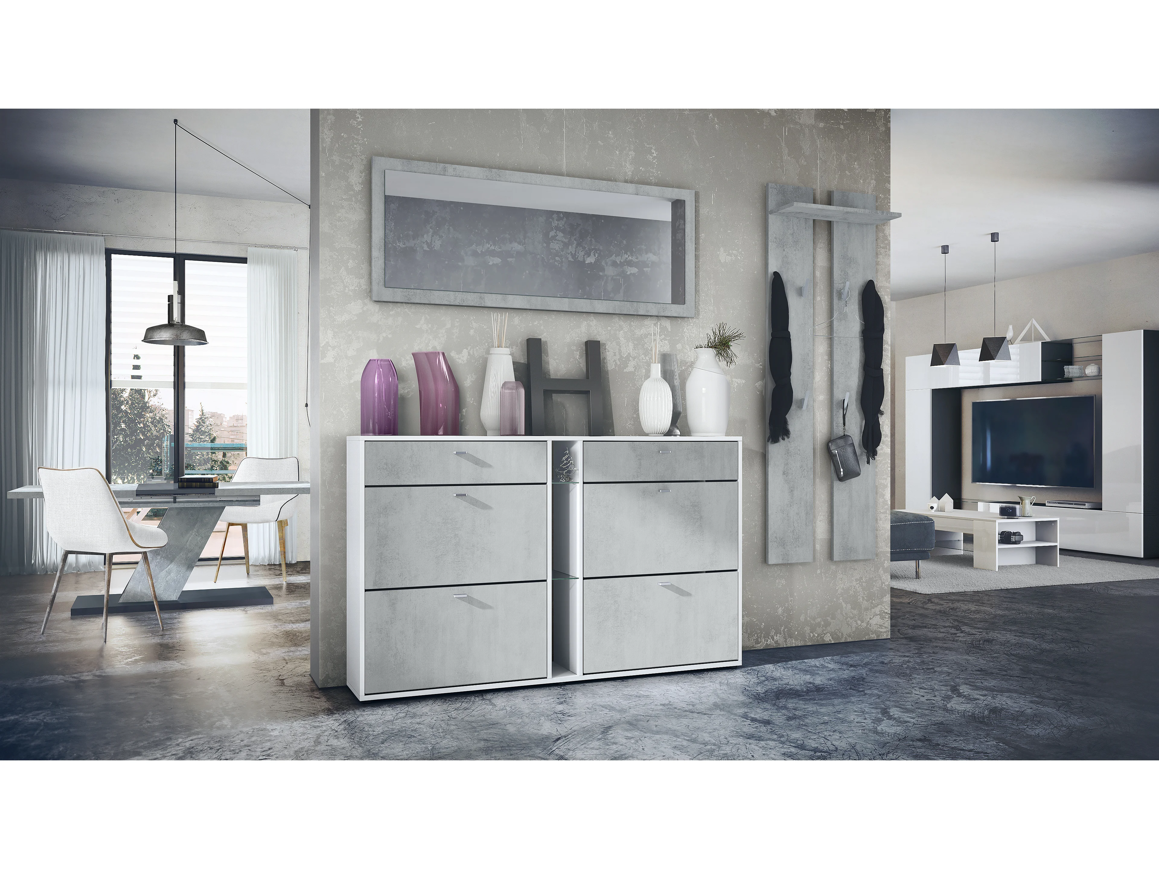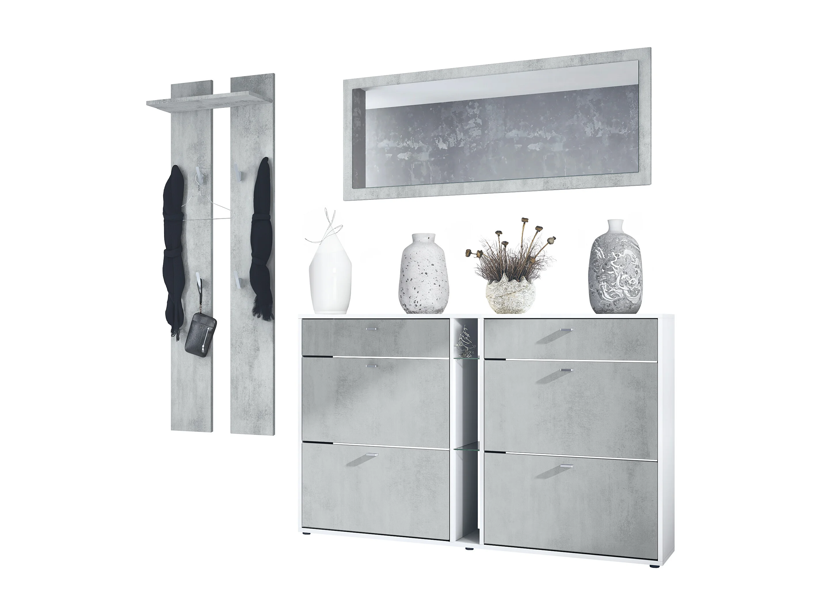 Ensemble vestiaire Orlando avec armoire à chaussures, panneau mural et miroir mural, blanc mat/aspect béton oxyde