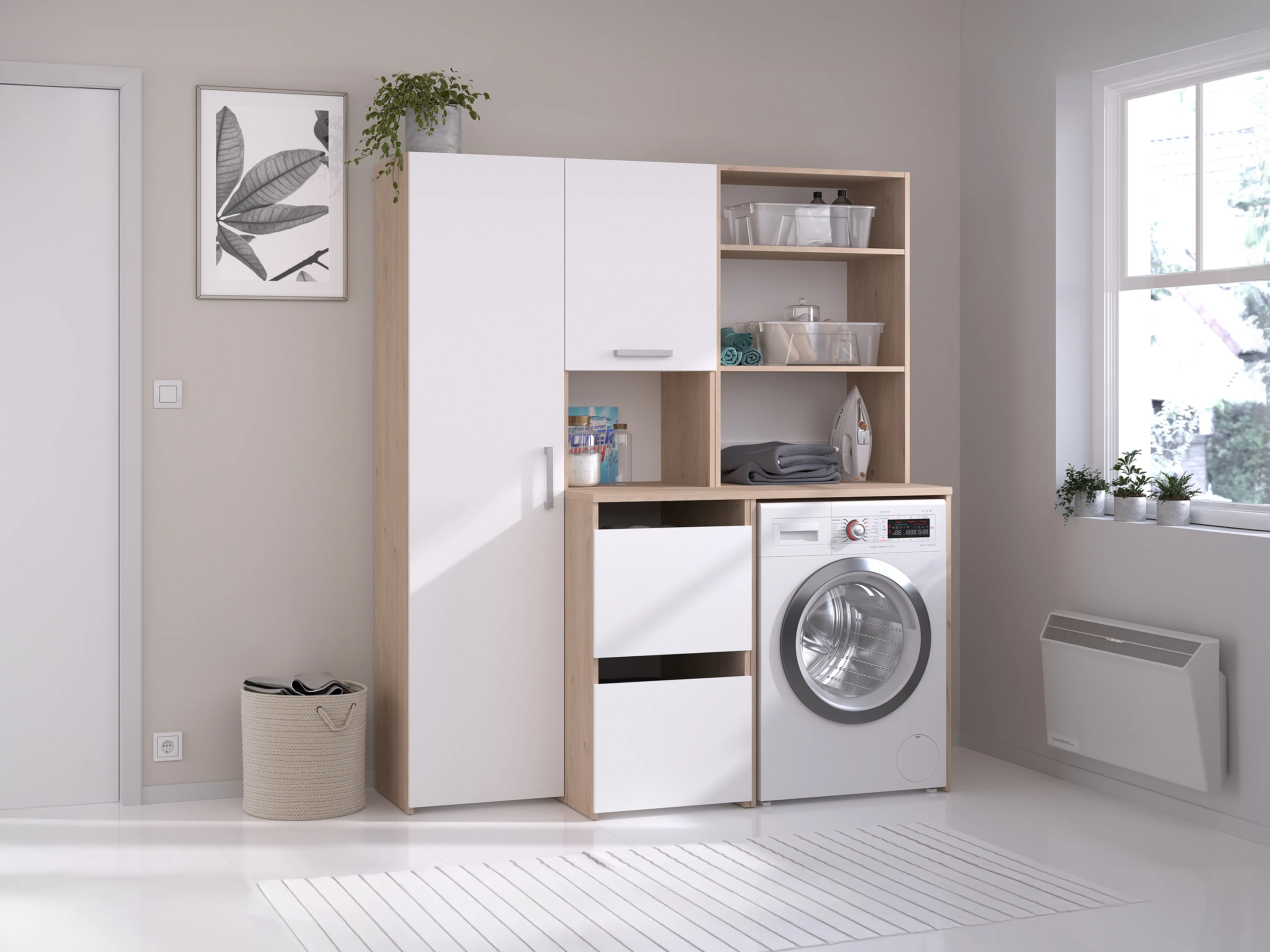 Meuble pour machine à laver avec étagères, placards et colonne de rangement - Naturel clair et blanc - L156 x H184 cm - ERKANO