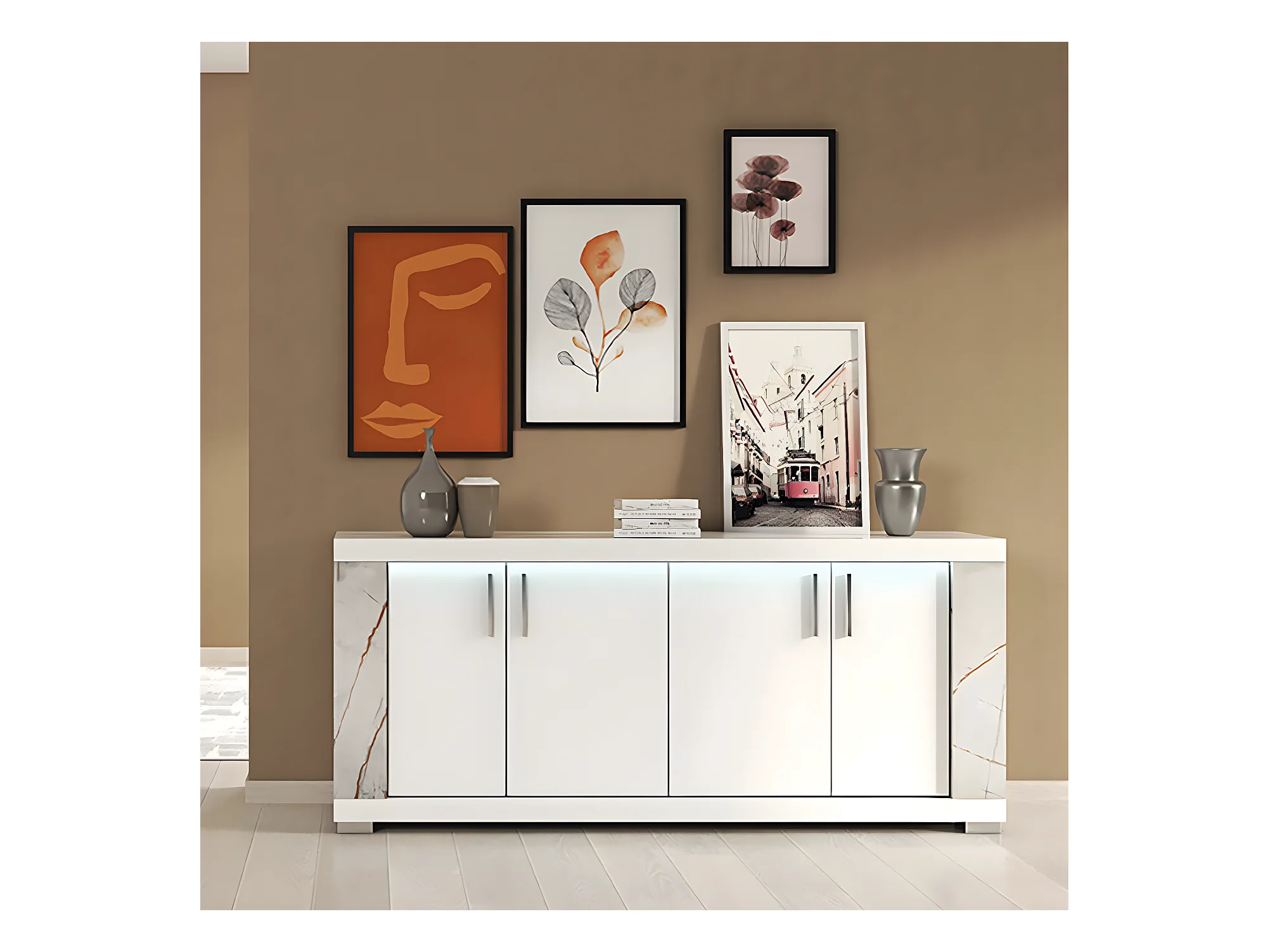 EROS - Buffet 4 Portes Blanc Eclairage Led intégré avec Décor Latéral Aspect Marbre