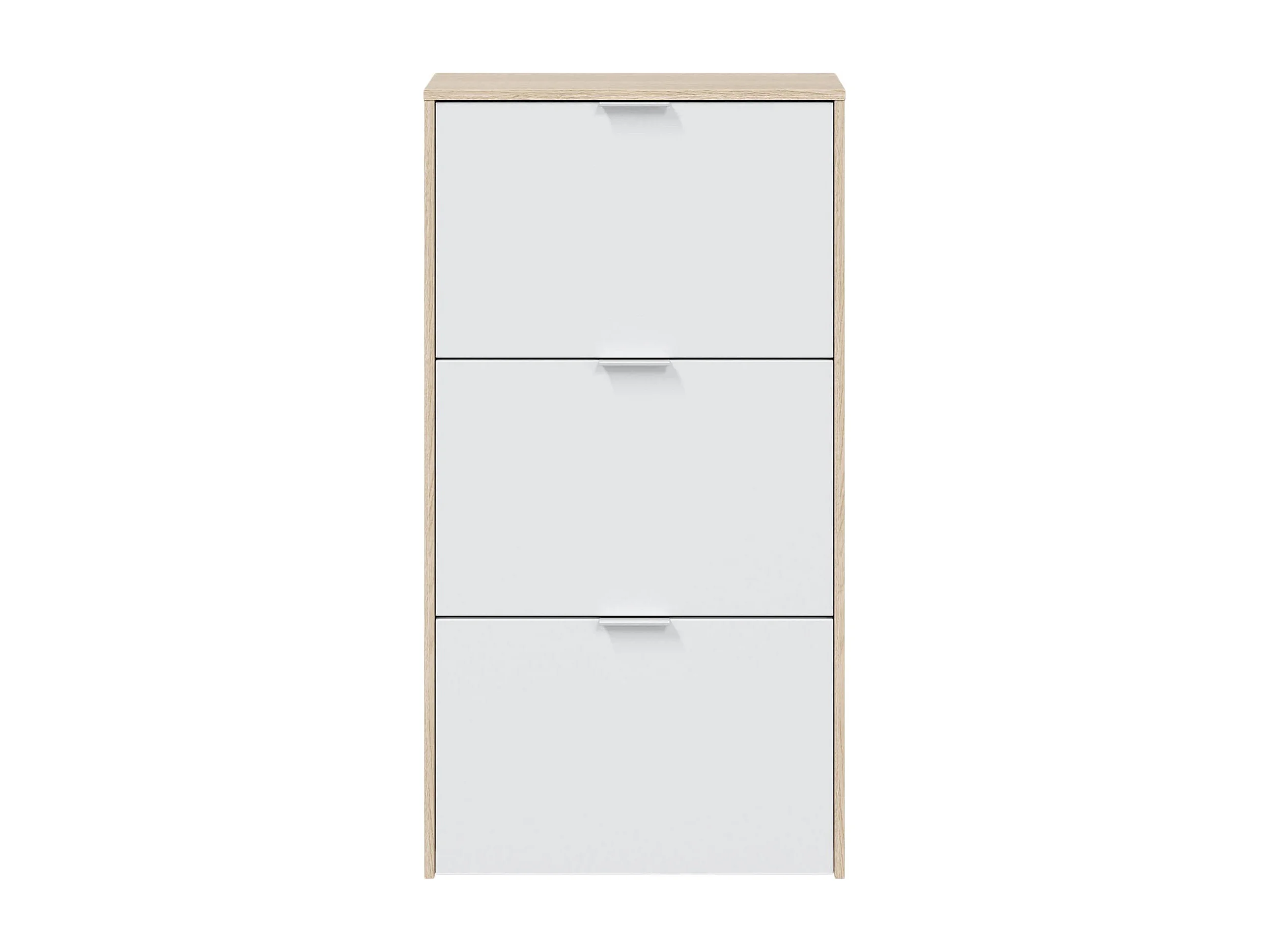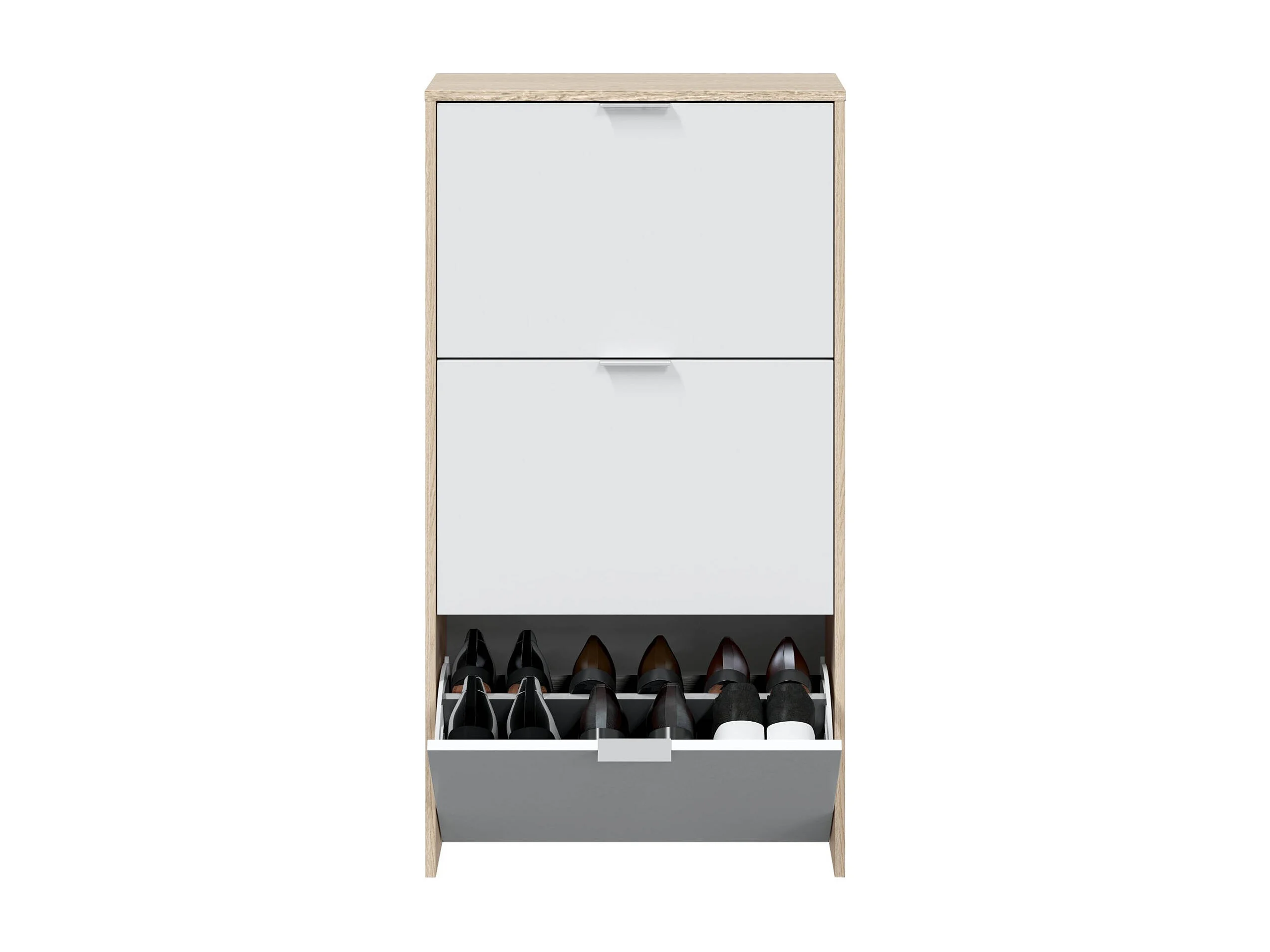 Sapateira Escondido, guarda-roupa com 3 portas sanfonadas, armário de dupla capacidade para até 18 pares de sapatos, 60x22h113 cm, carvalho e branco brilhante