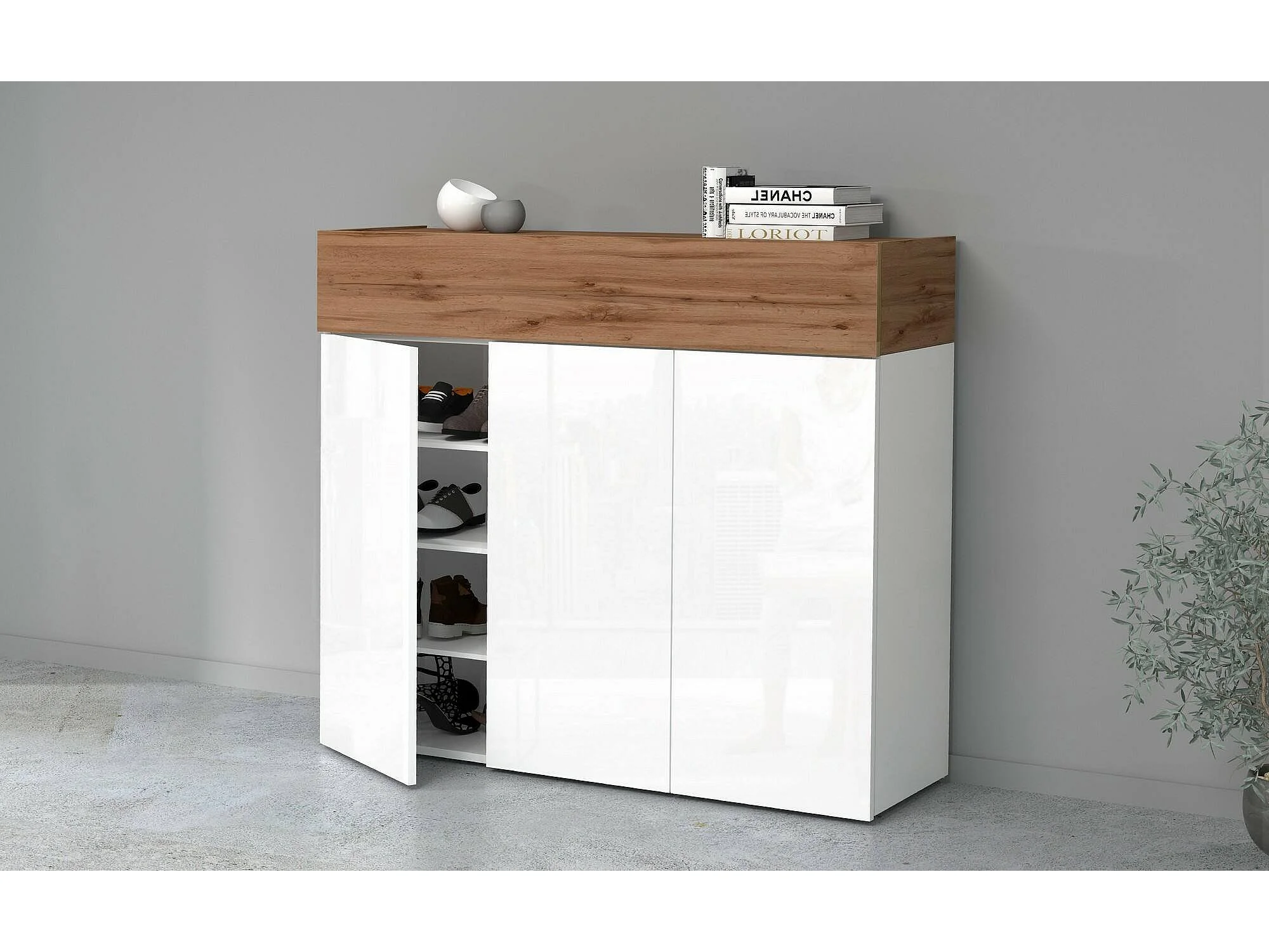 Étagère à chaussures Nick, étagère à chaussures peu encombrante à 4 portes, armoire d'entrée multifonctionnelle, 114x38h100 cm, blanc et chêne