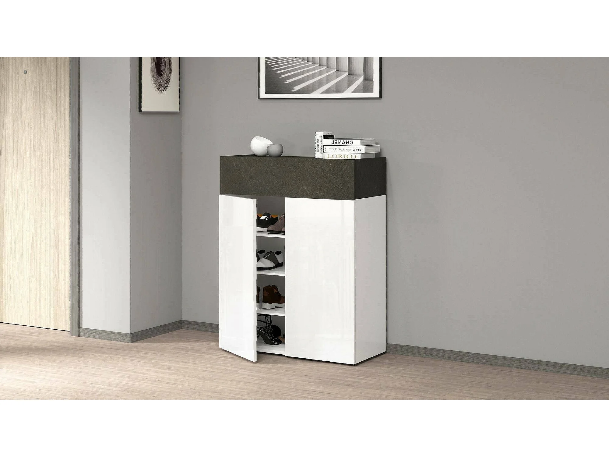 Étagère à chaussures Oliviero, étagère à chaussures peu encombrante à 3 portes, armoire d'entrée multifonctionnelle, 76x38h100 cm, Blanc et Ardoise