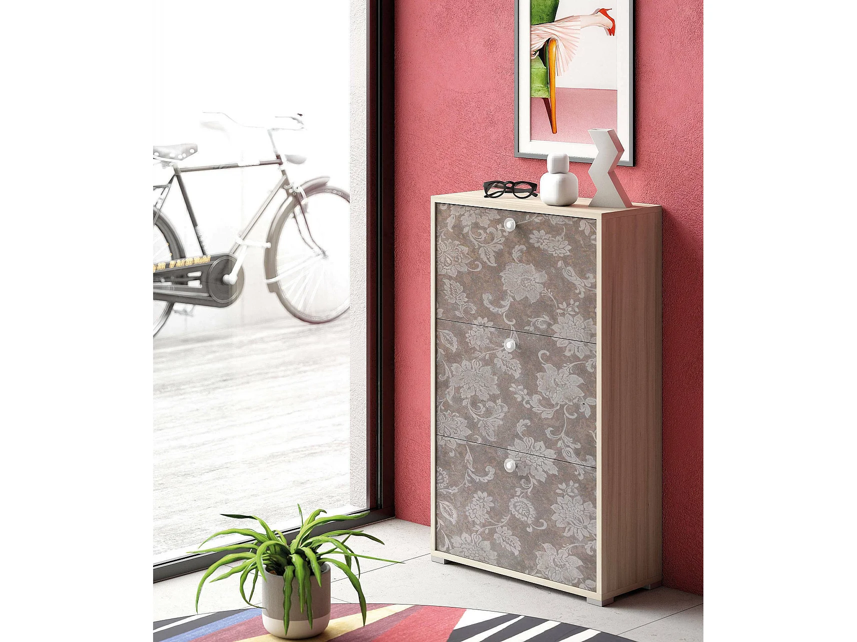 Scarpiera Peonia, Mobile multiuso da ingresso con 3 ante a ribalta, Armadietto portascarpe a doppia profondit, 100% Made in Italy, 67x28h112 cm, Olmo e fantasia