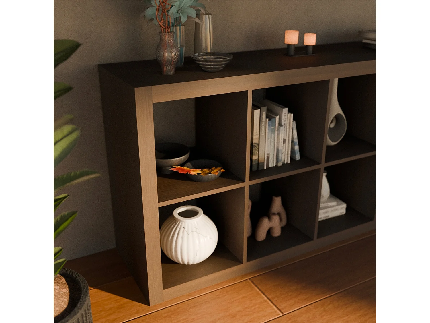 Etagère bibliothèque 2 niveaux 6 compartiments. casiers. effet bois de noyer. L 111.2 x P 39 x H 76cm