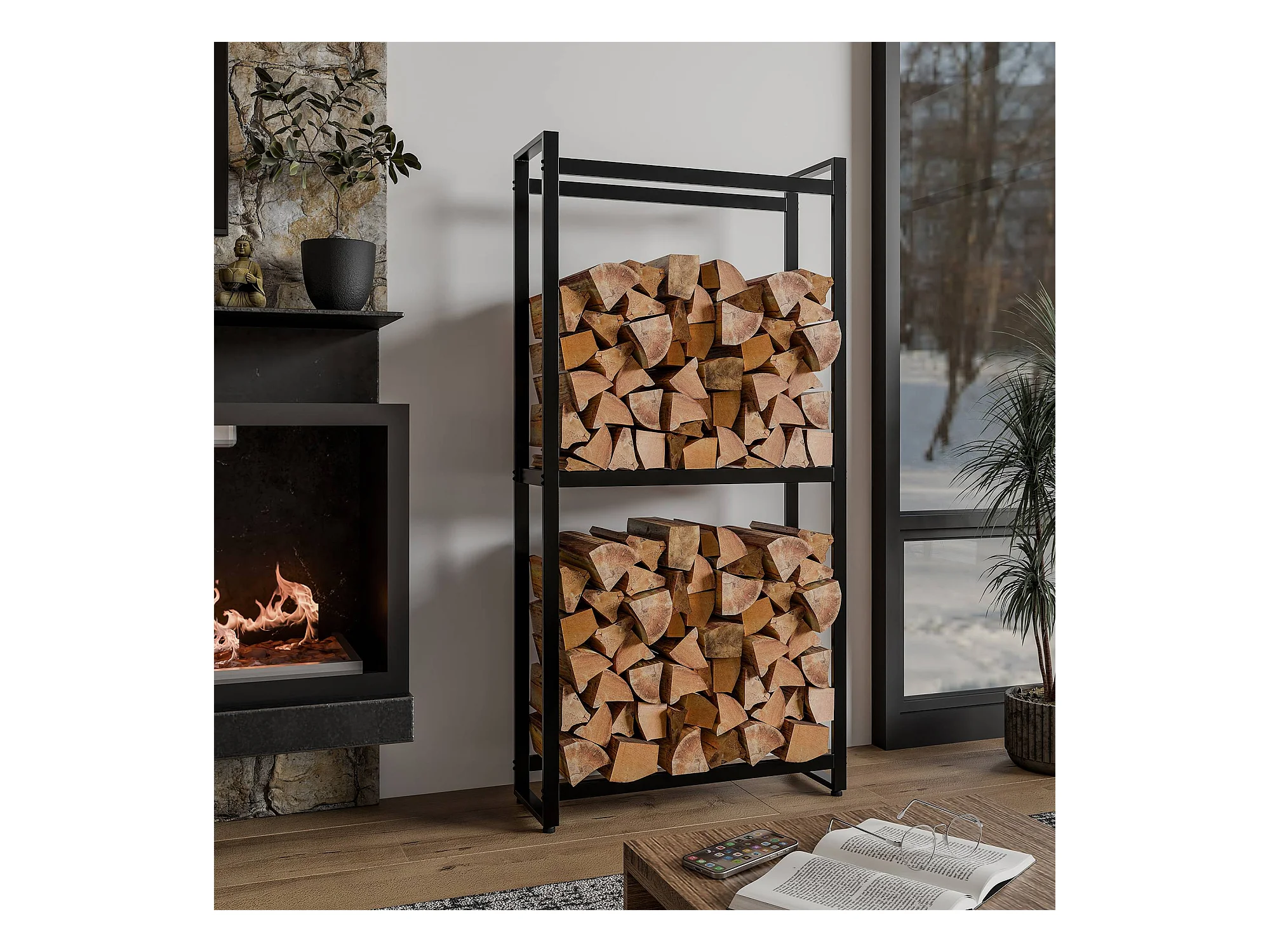 Etagère bois de cheminée - Métal - 60 x 25 x 100cm - Noir-mat - Keri