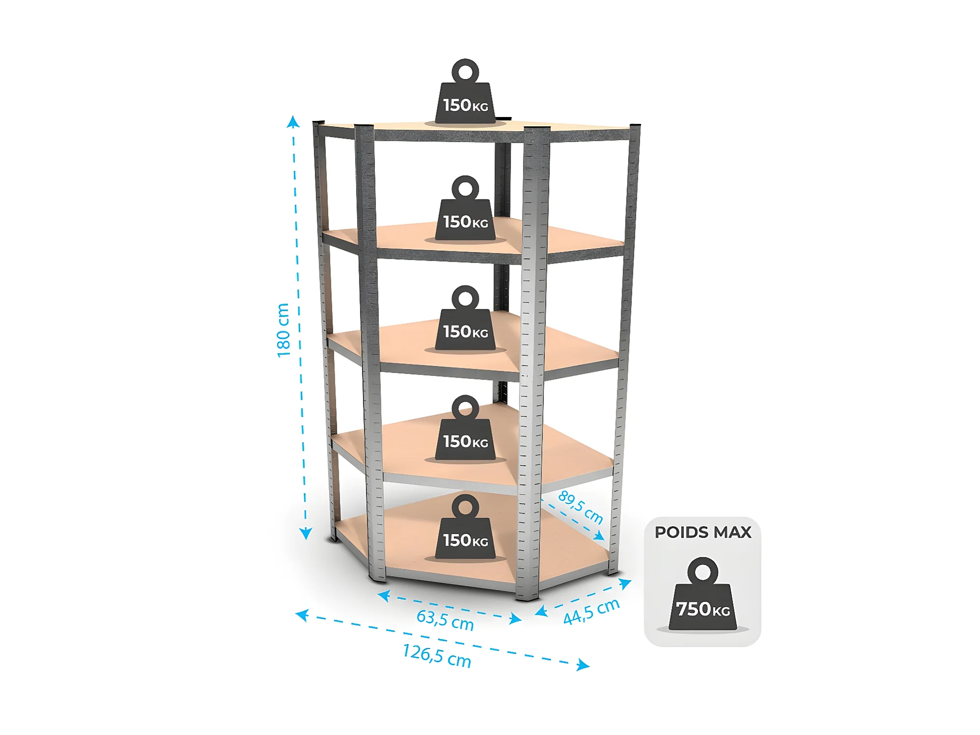 Étagère d'angle polyvalente en métal - Charge lourde Max 750kg - 180 x 90 x 45 cm - Gris