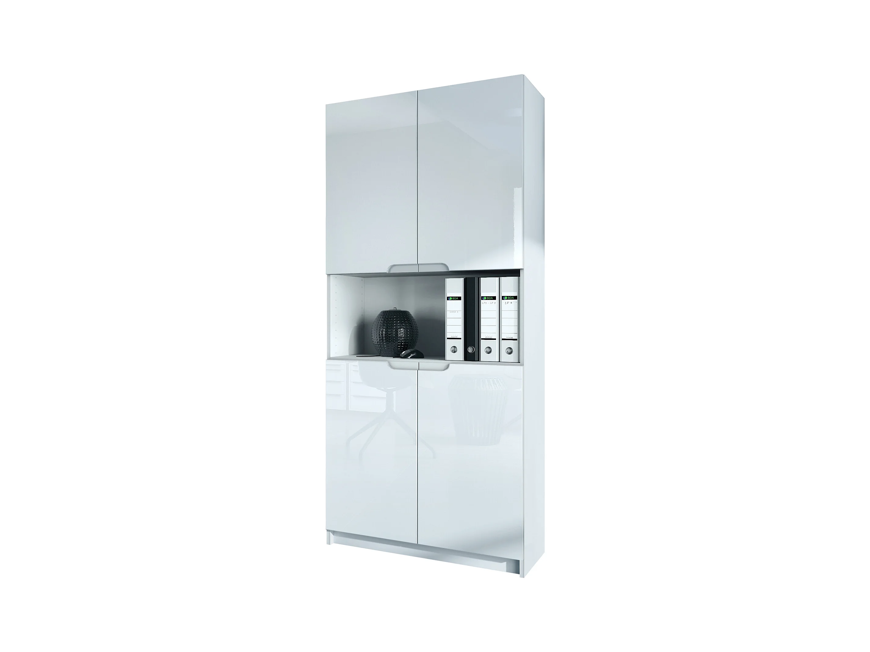 Étagère de bureau Logan V2, Armoire de rangement avec 5 compartiments et 4 portes, blanc mat/blanc haute brillance (82 x 184 x 37 cm)