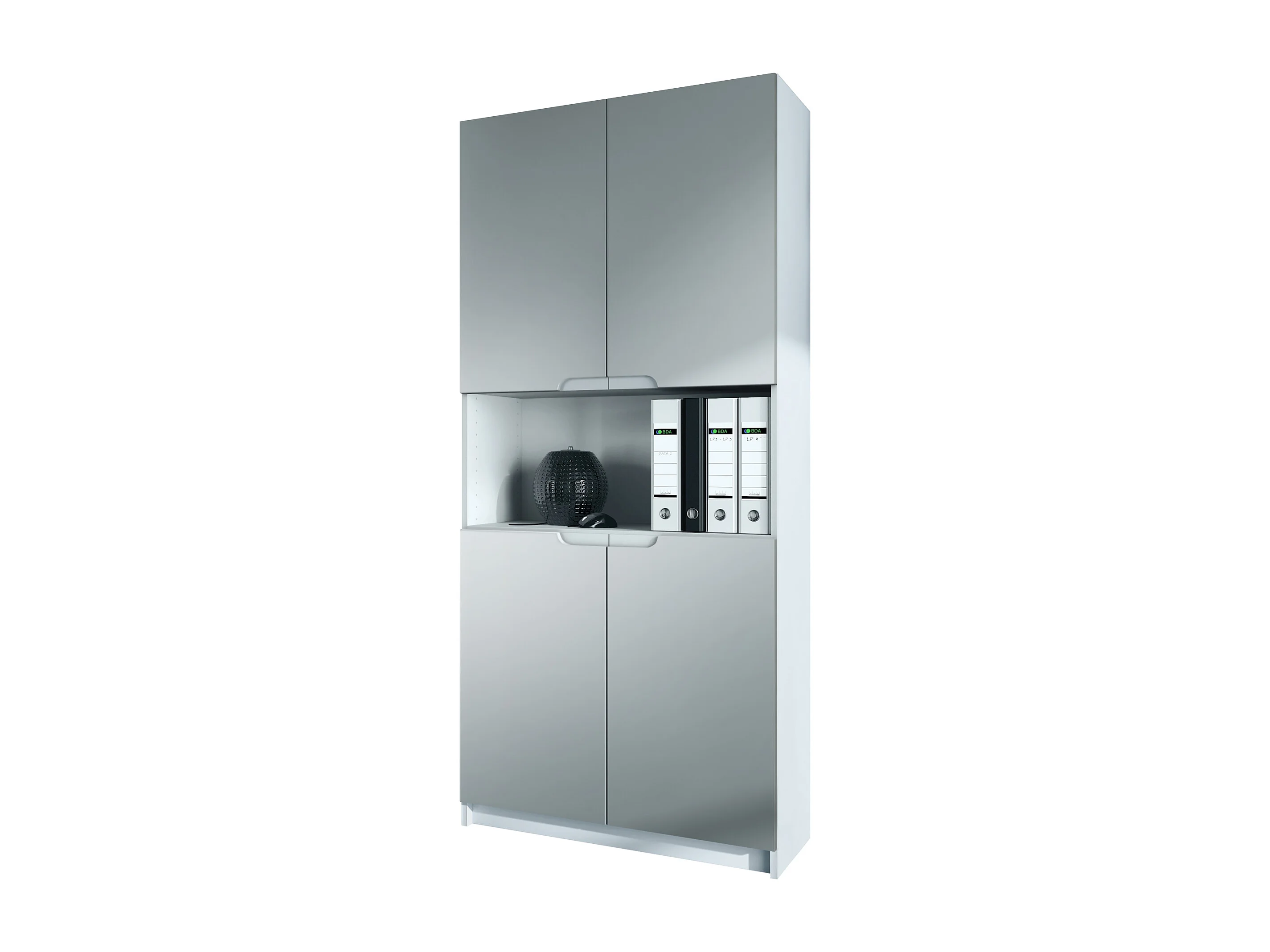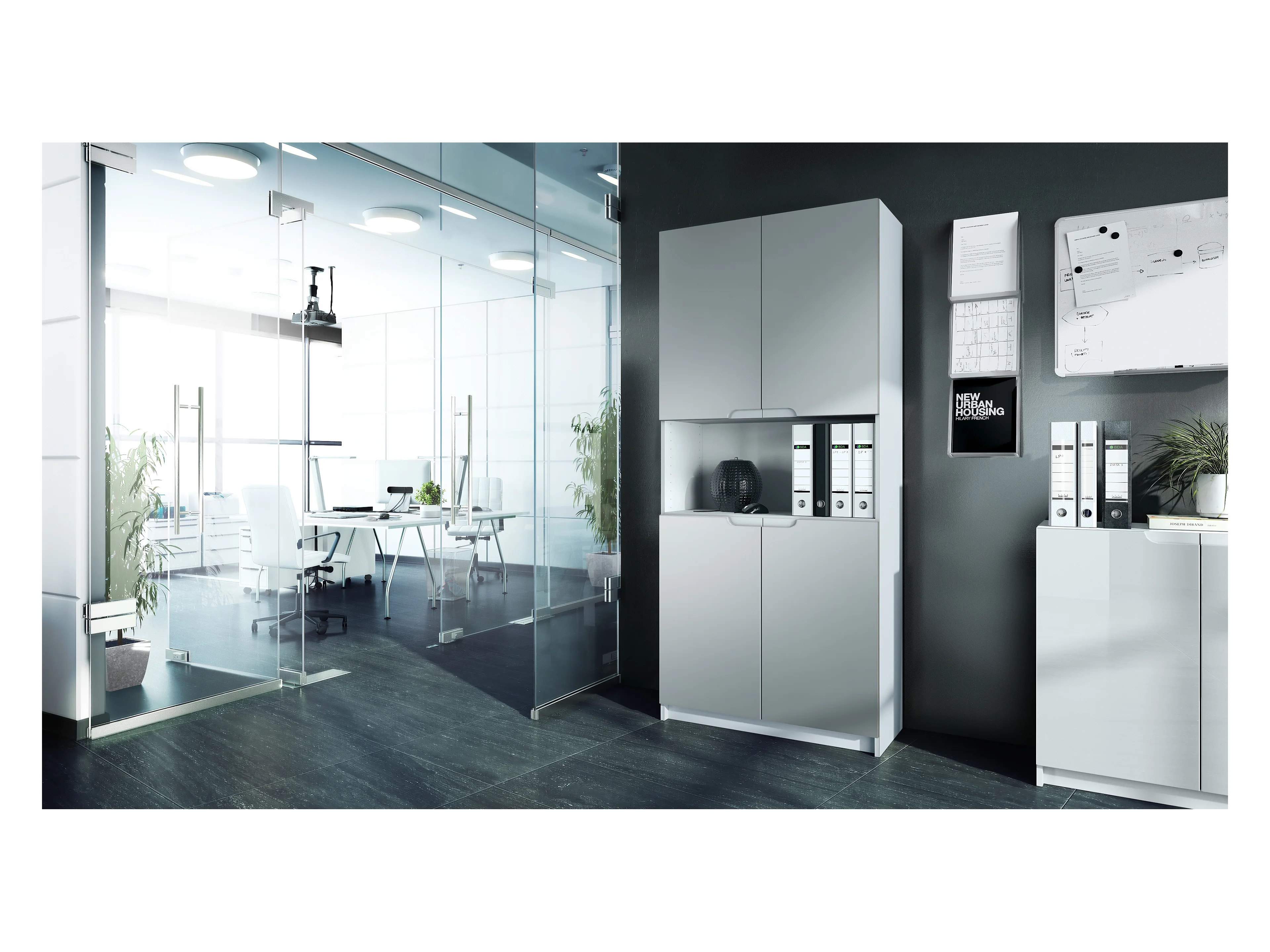Étagère de bureau Logan V2, Armoire de rangement avec 5 compartiments et 4 portes, blanc mat/gris clair satiné mat (82 x 184 x 37 cm)