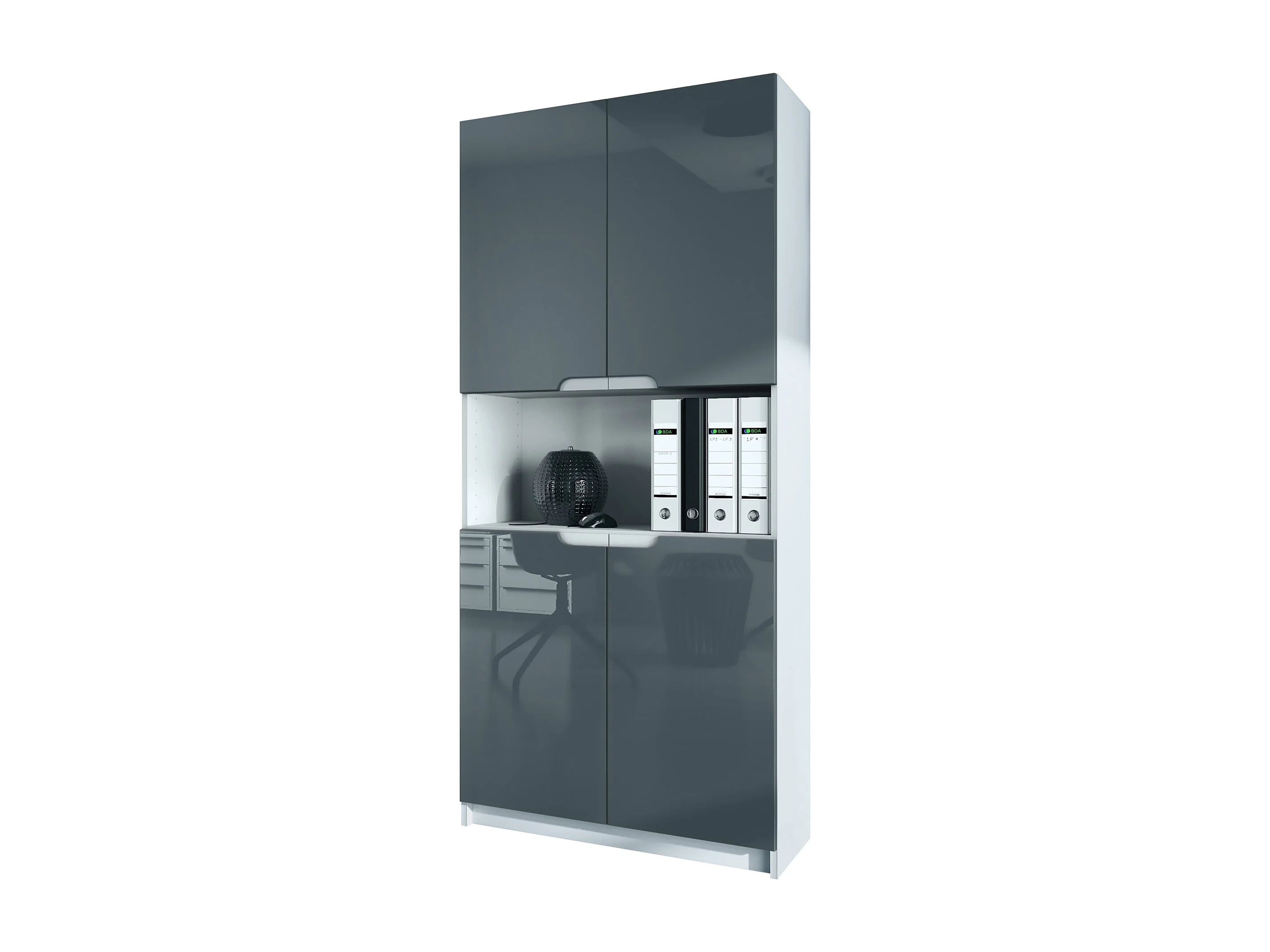 Étagère de bureau Logan V2, Armoire de rangement avec 5 compartiments et 4 portes, blanc mat/gris haute brillance (82 x 184 x 37 cm)