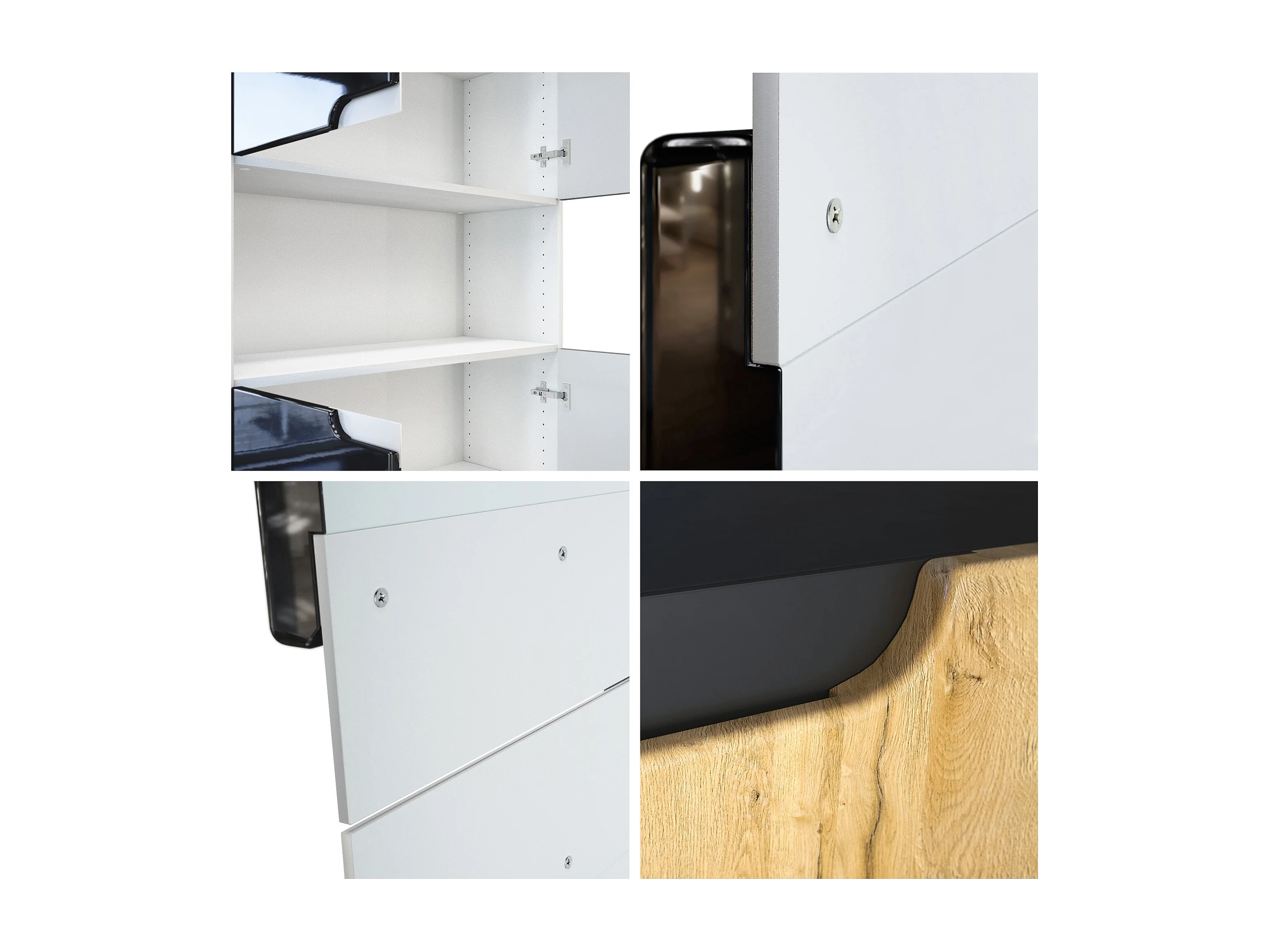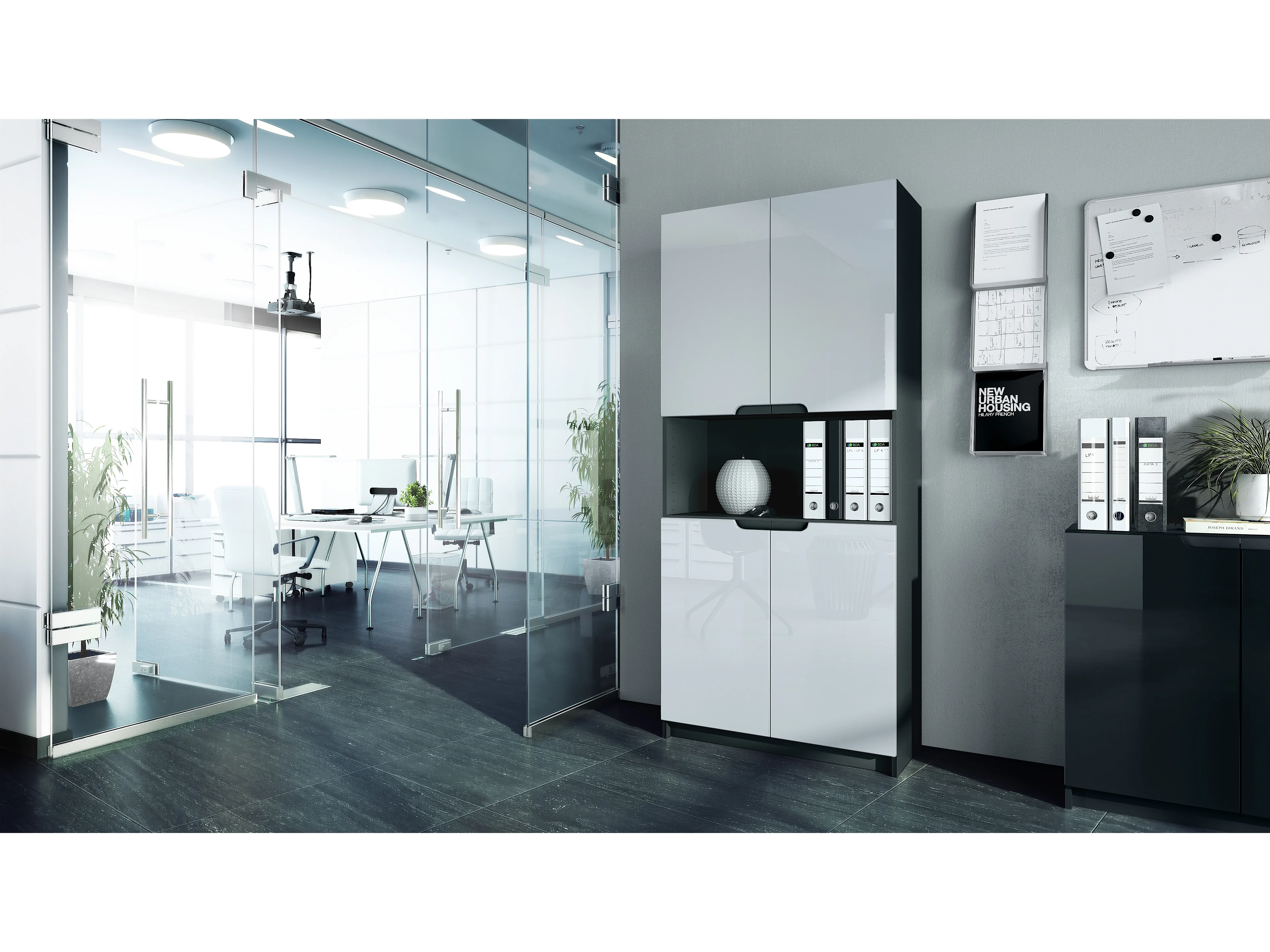 Étagère de bureau Logan V2, Armoire de rangement avec 5 compartiments et 4 portes, noir mat/blanc haute brillance (82 x 184 x 37 cm)