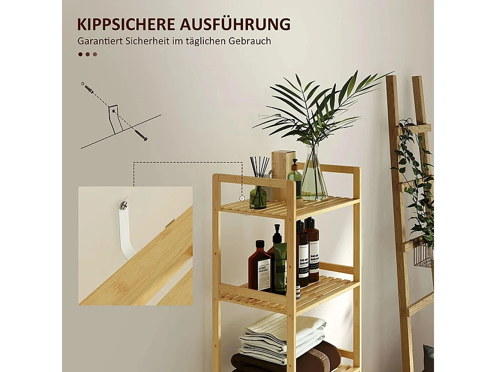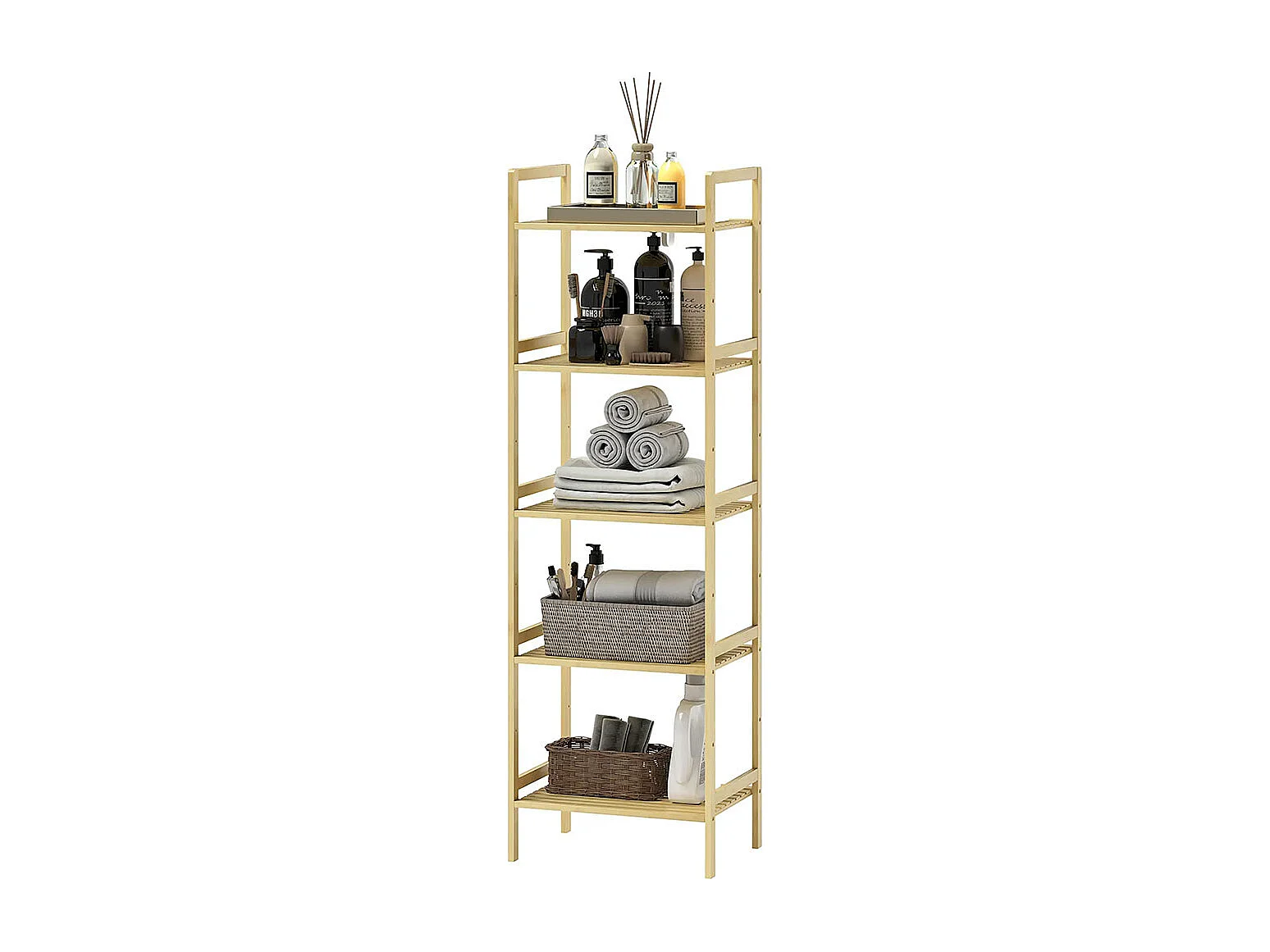 Étagère de salle de bain en bambou, conception à 5 niveaux, avec tablettes réglables, dimensions : 43,5 x 31,5 x 142 cm, bois naturel.