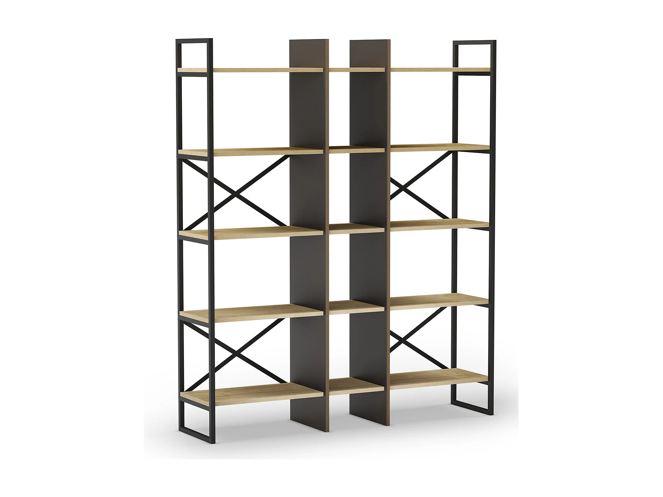 Etagère haute, meuble étagère aspect bois coloris chêne et métal noir - Longueur 143,50 x Profondeur 35 x Hauteur 175 cm
