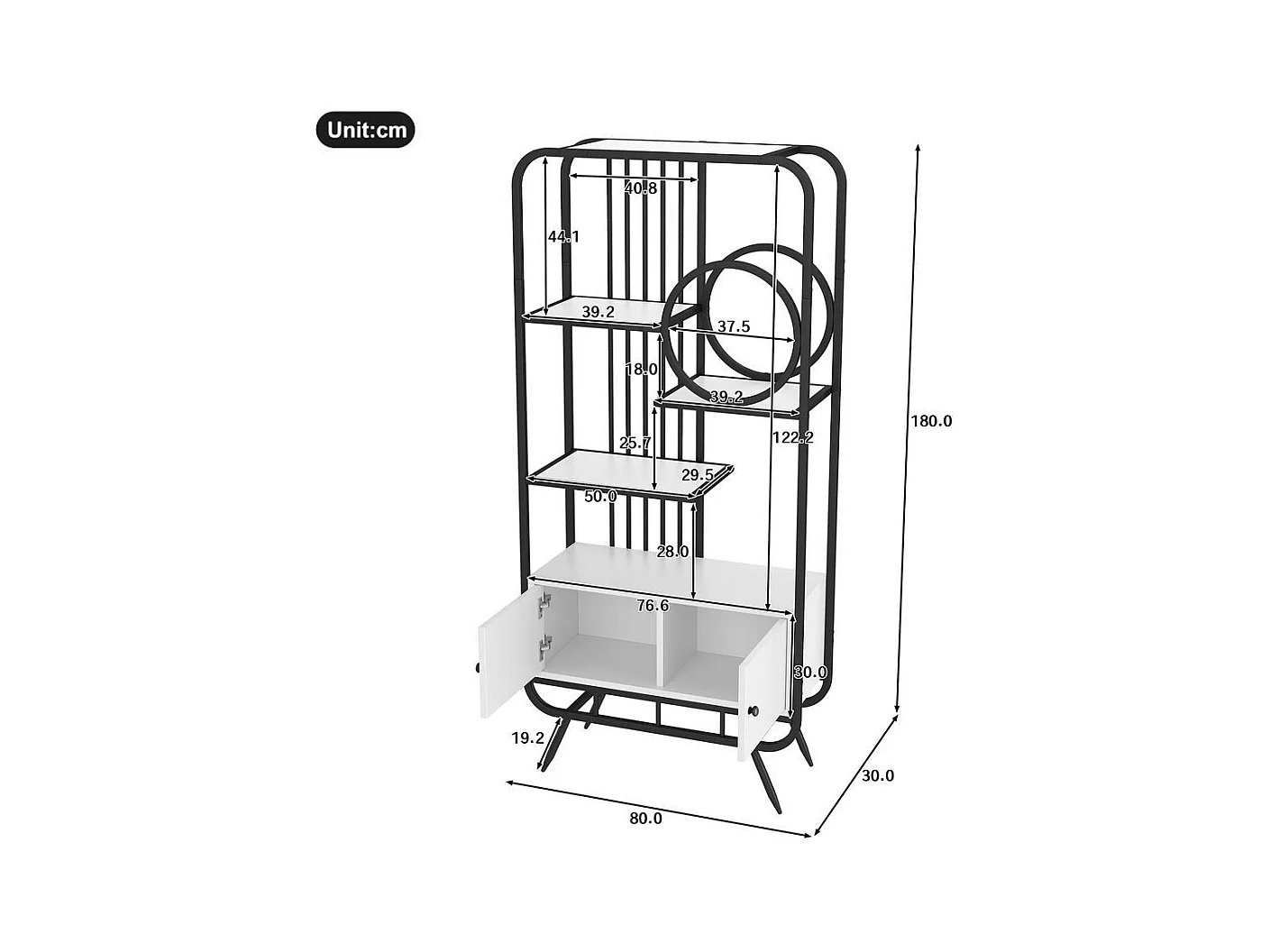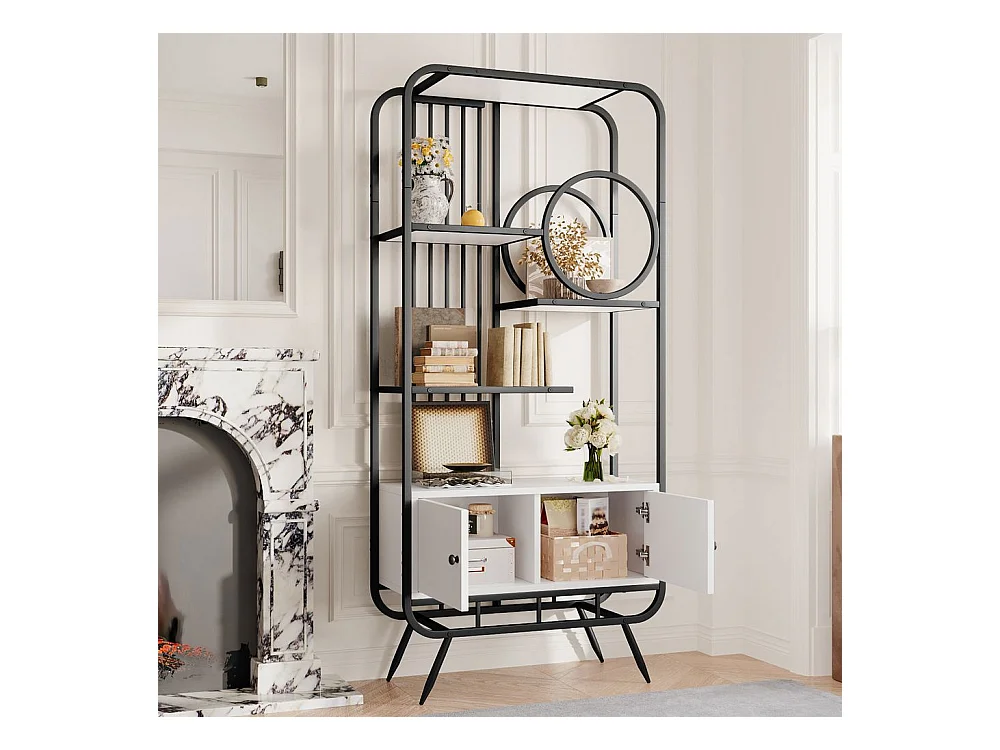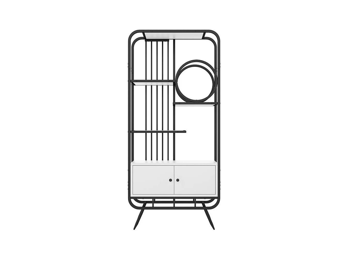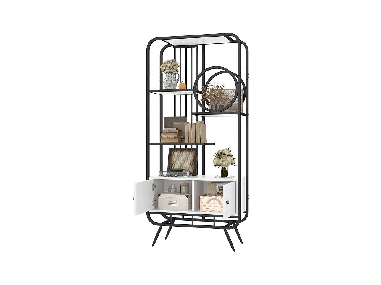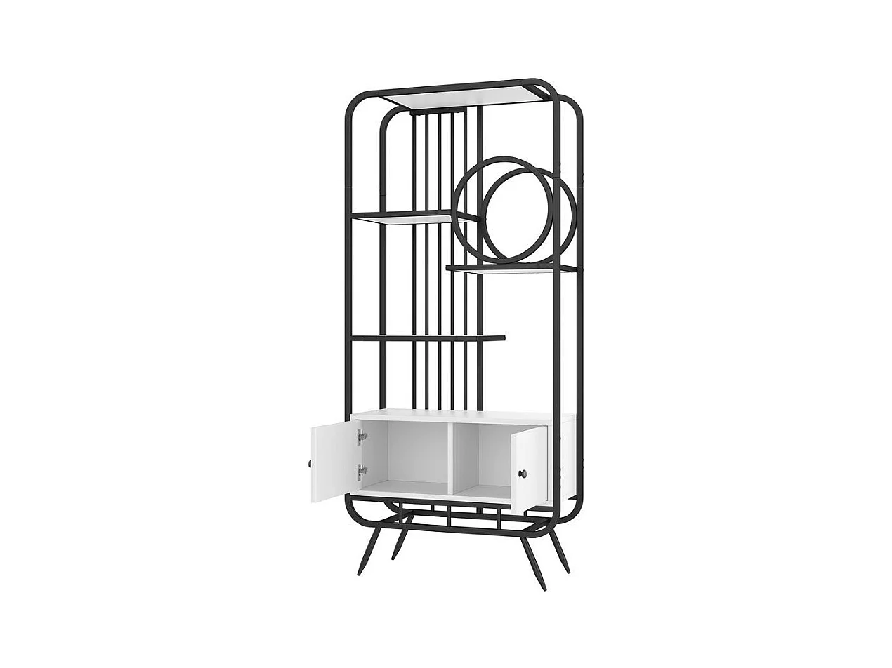 Étagère métallique à double porte trois étagères étagère métallique pieds métalliques hauts décoration ronde blanc + noir