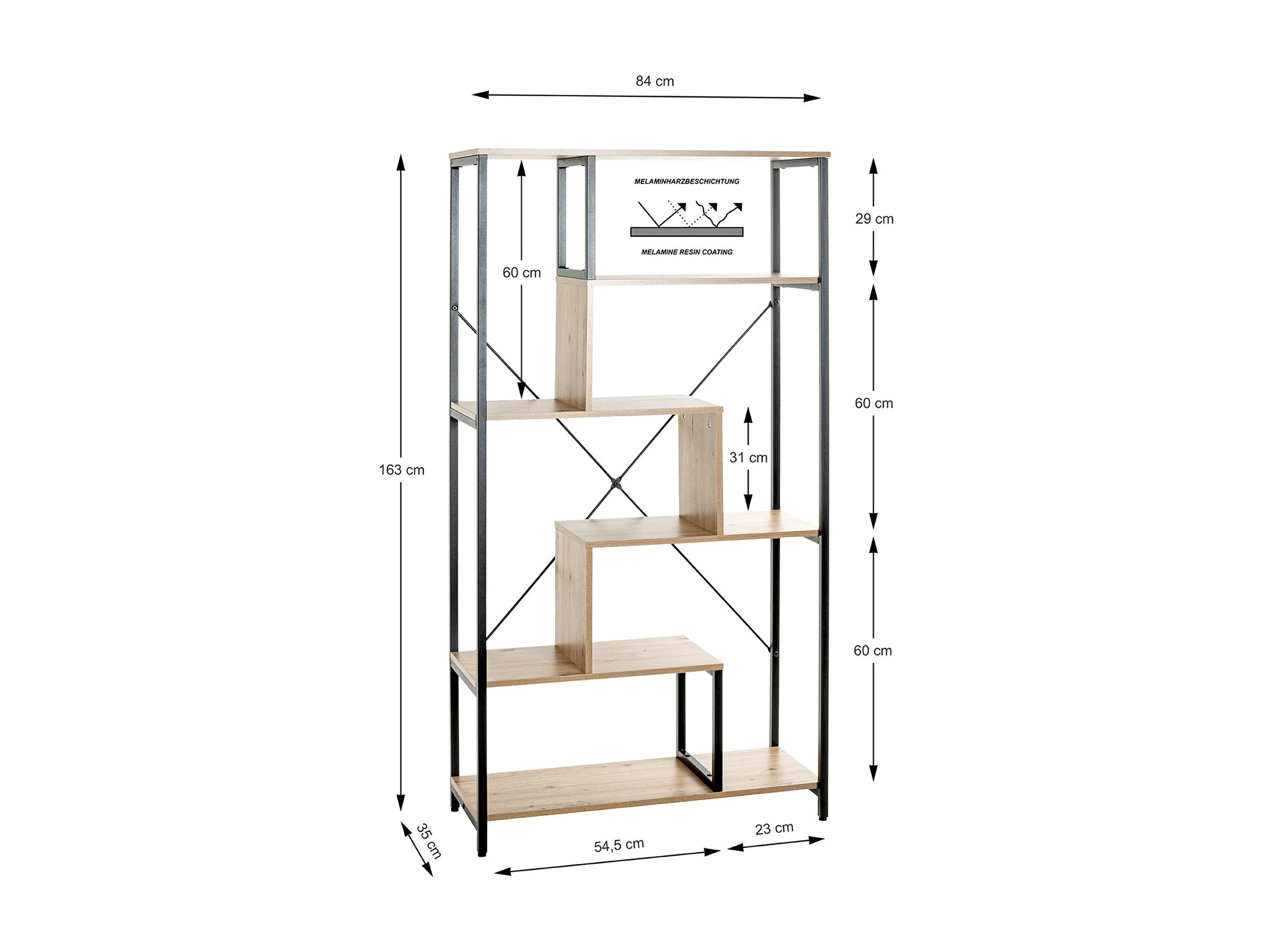 Etagère, meuble étagère en bois coloris chêne et métal noir -longueur 84 x profondeur 35 x hauteur 163 cm