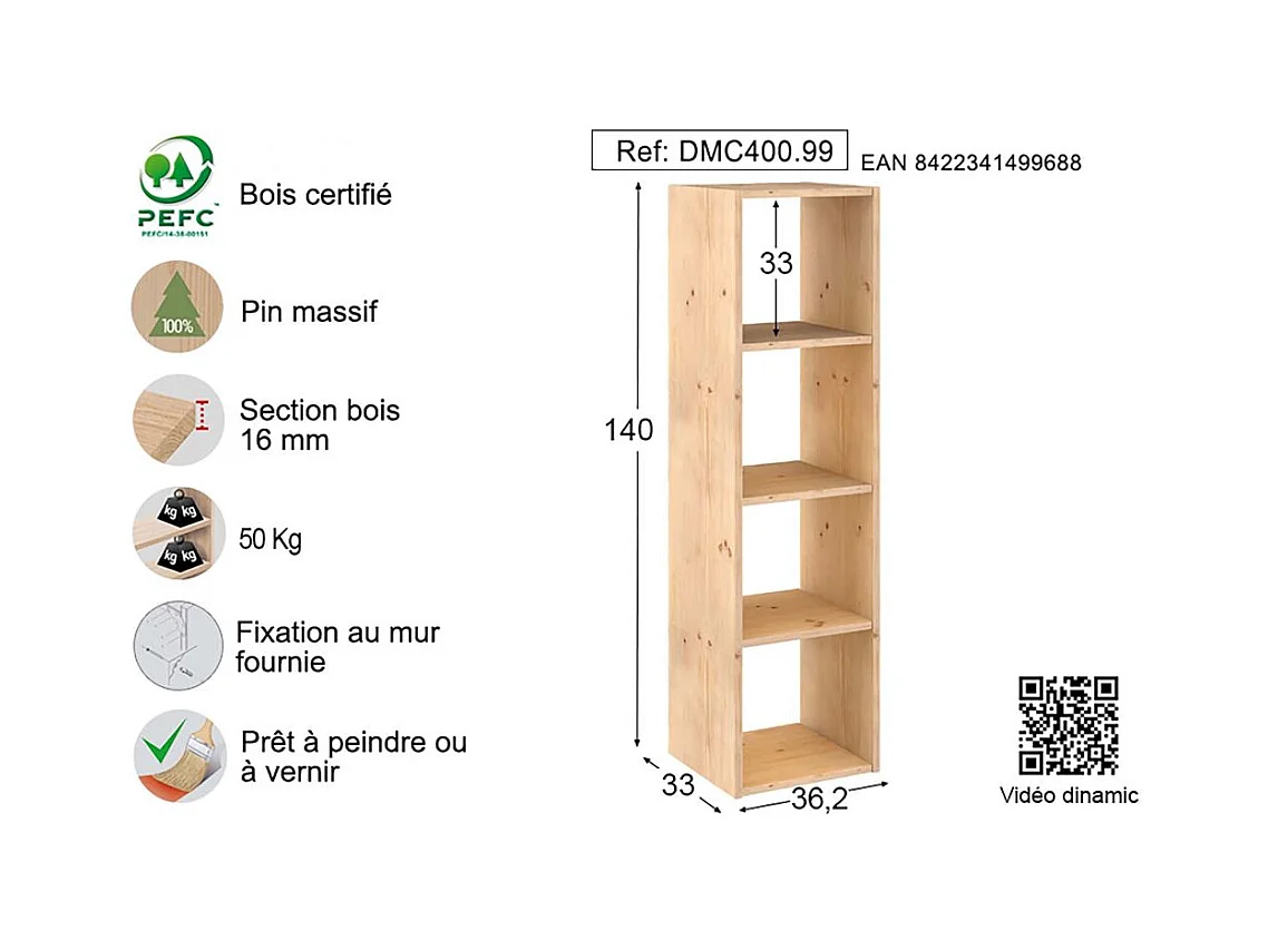 Étagère modulaire en pin massif Dinamic 4 tablettes