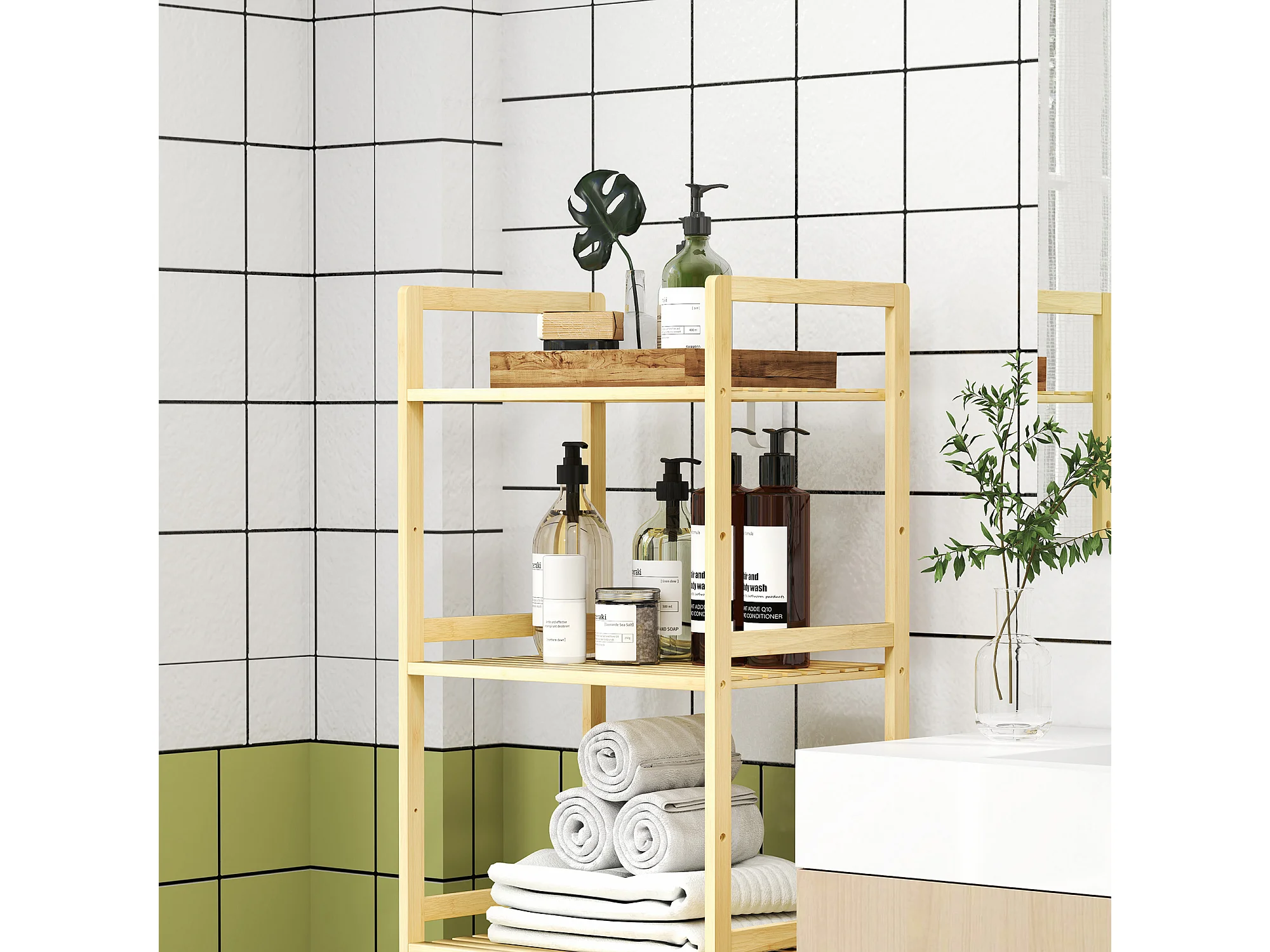 Étagère de toilette 3 niveaux avec protection anti-basculement, bambou naturel, noir (69x25.5x181 cm)