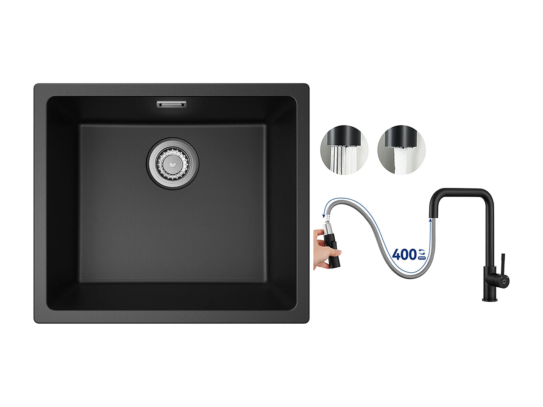 Evier 1 Bac en Quartz et Résine, 3 Options de Montage, 50*44*20cm + Mitigeur avec Douchette Extractible, Noir