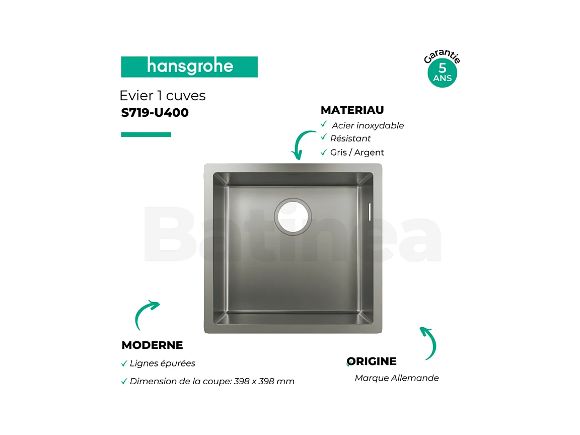 Evier à encastrer sous plan 1 bac HANSGROHE S71 400 avec vidage manuel inox