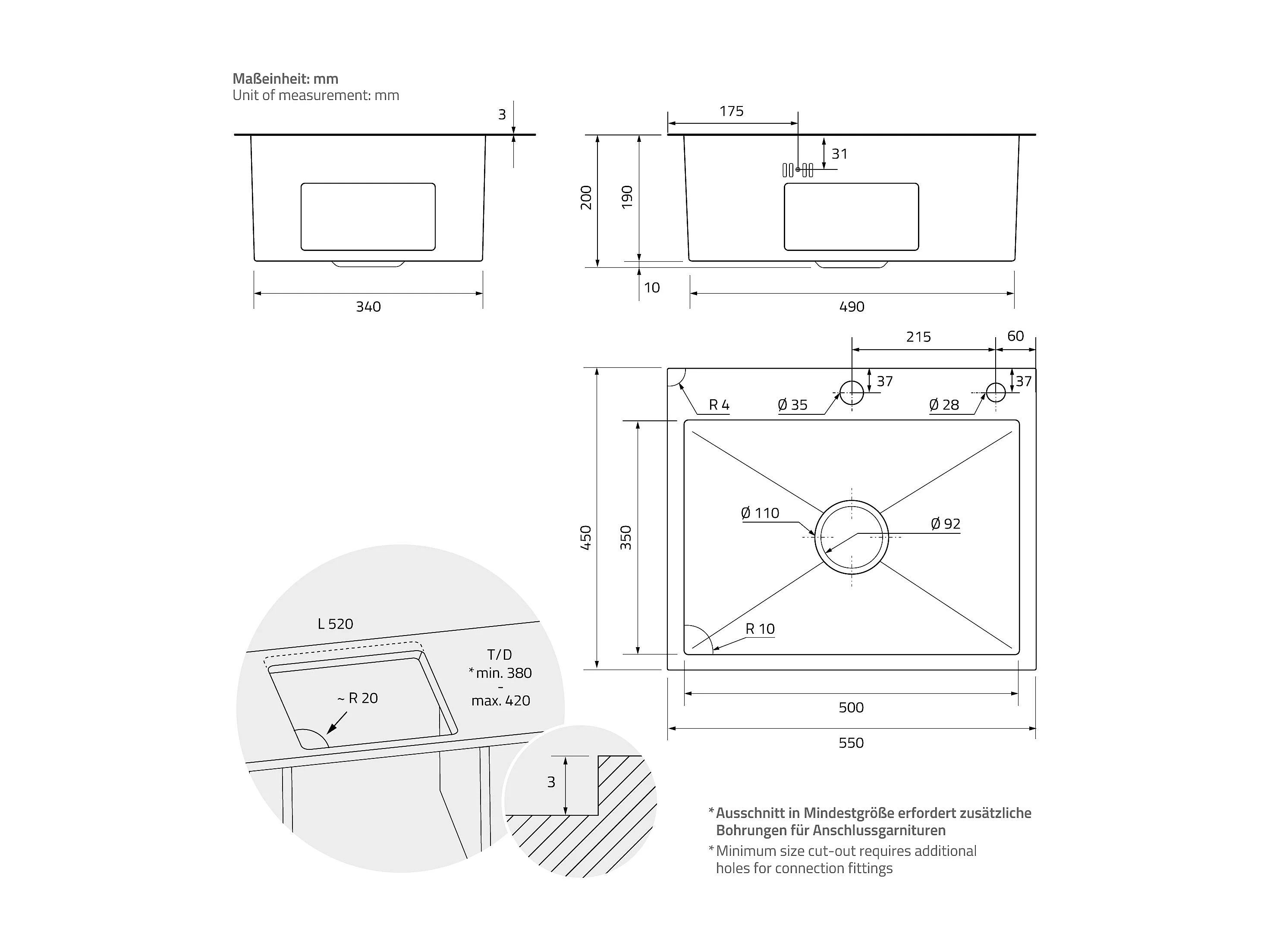 Évier de cuisine à encastrer anthracite 45x45 cm avec 2 trous vidage+trop plein