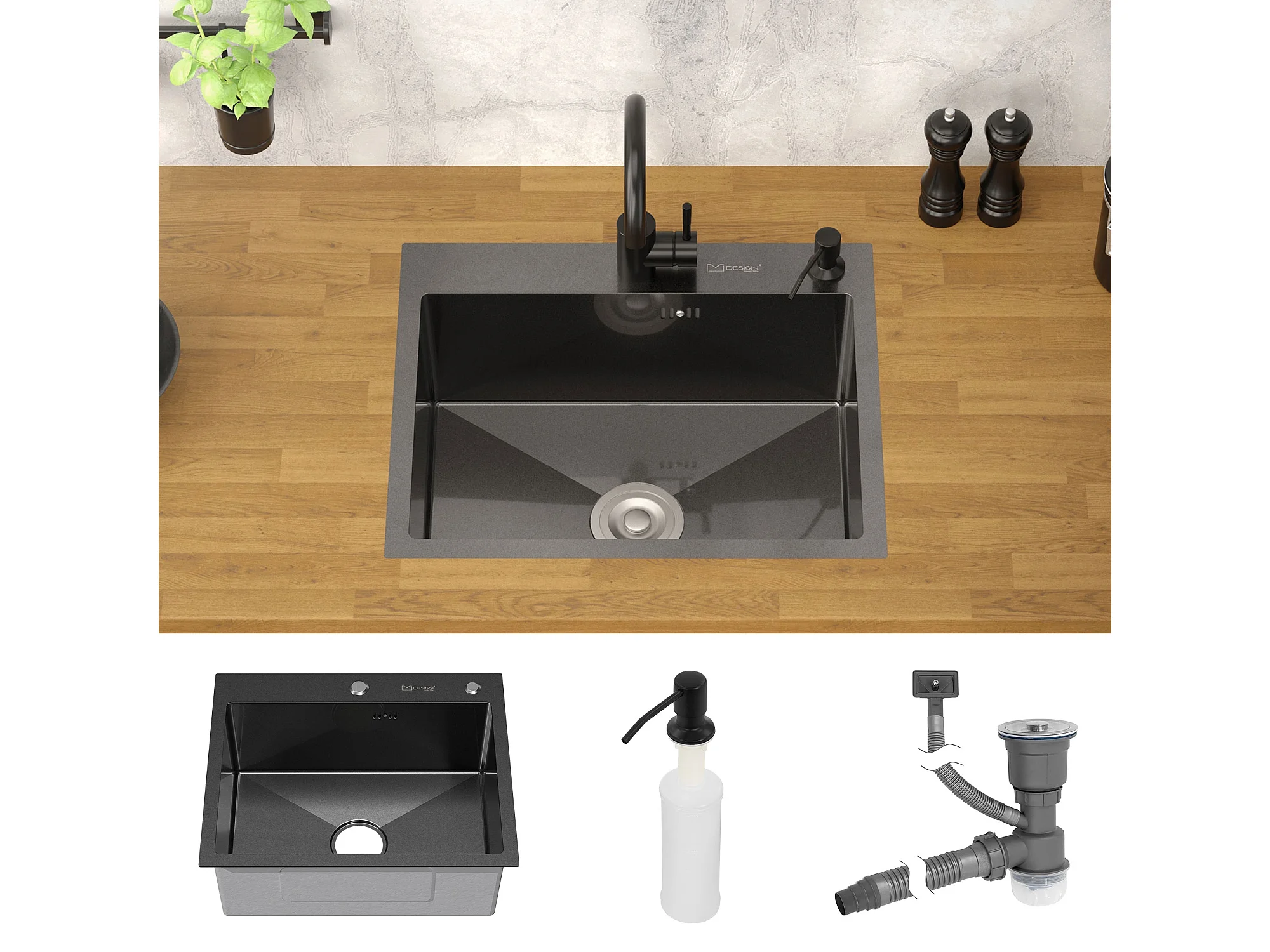 Évier à encastrer anthracite 68x45cm vidage distributeur savon+ panier-égouttoir