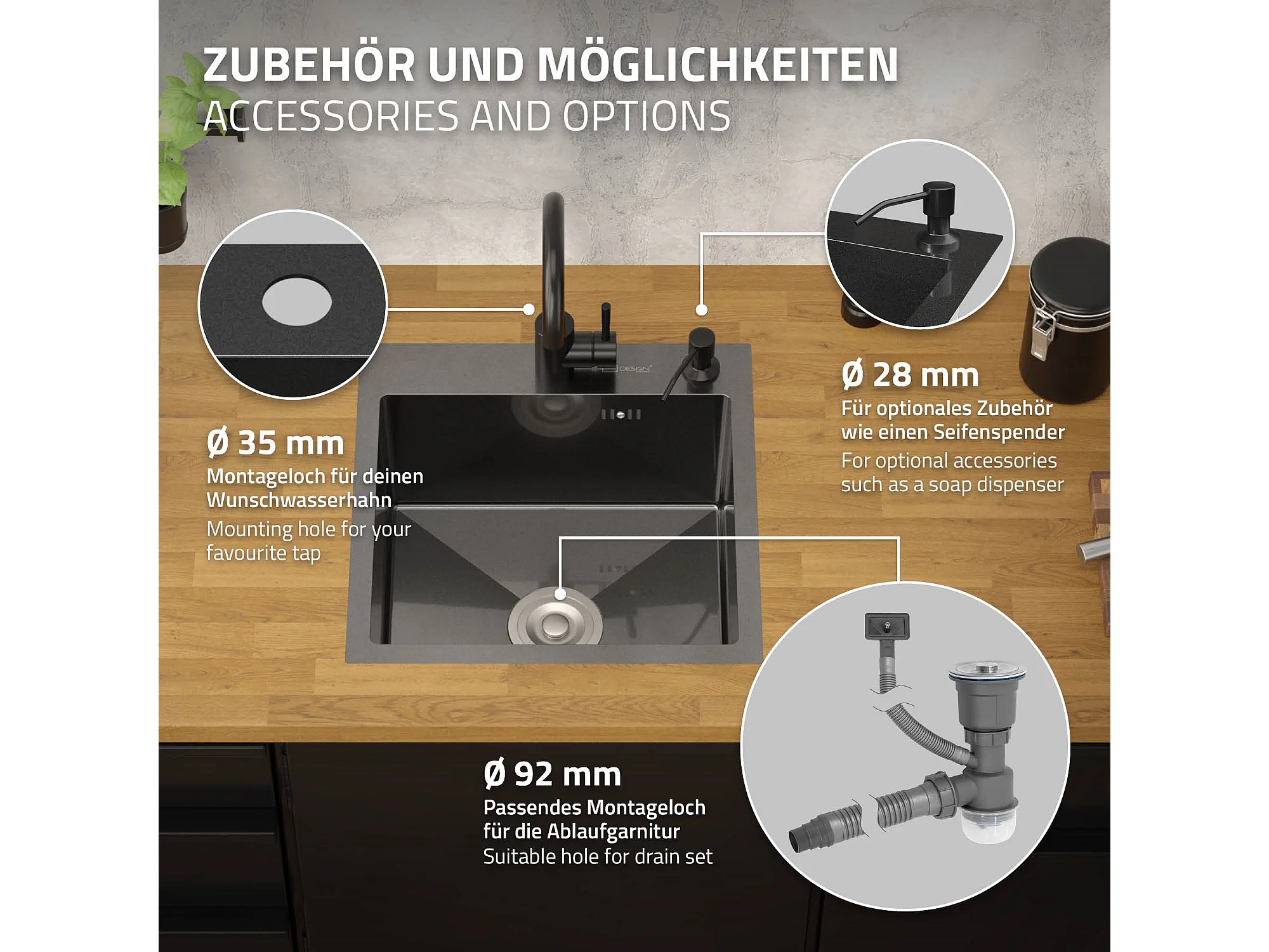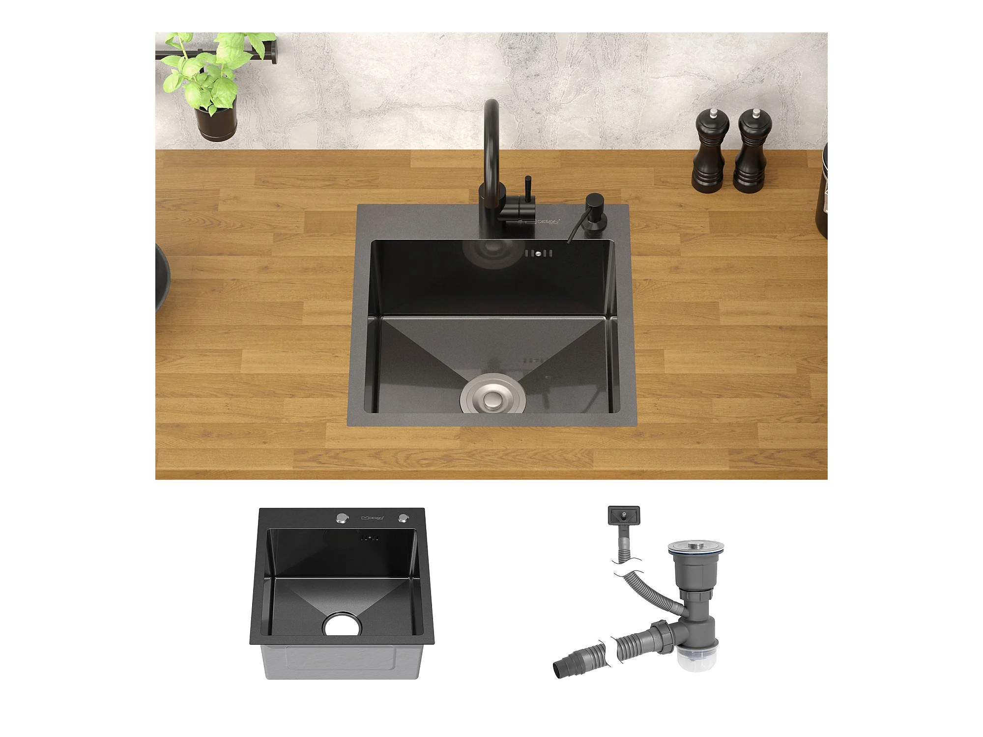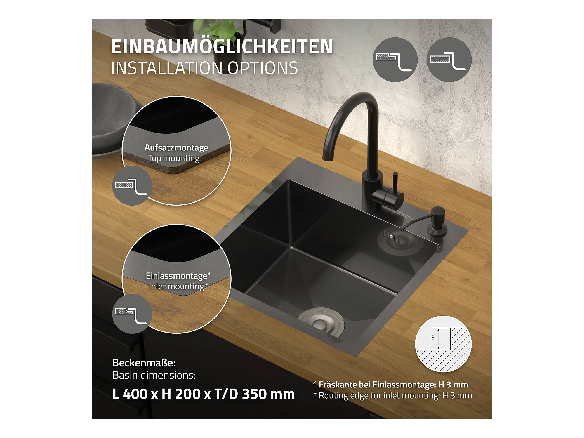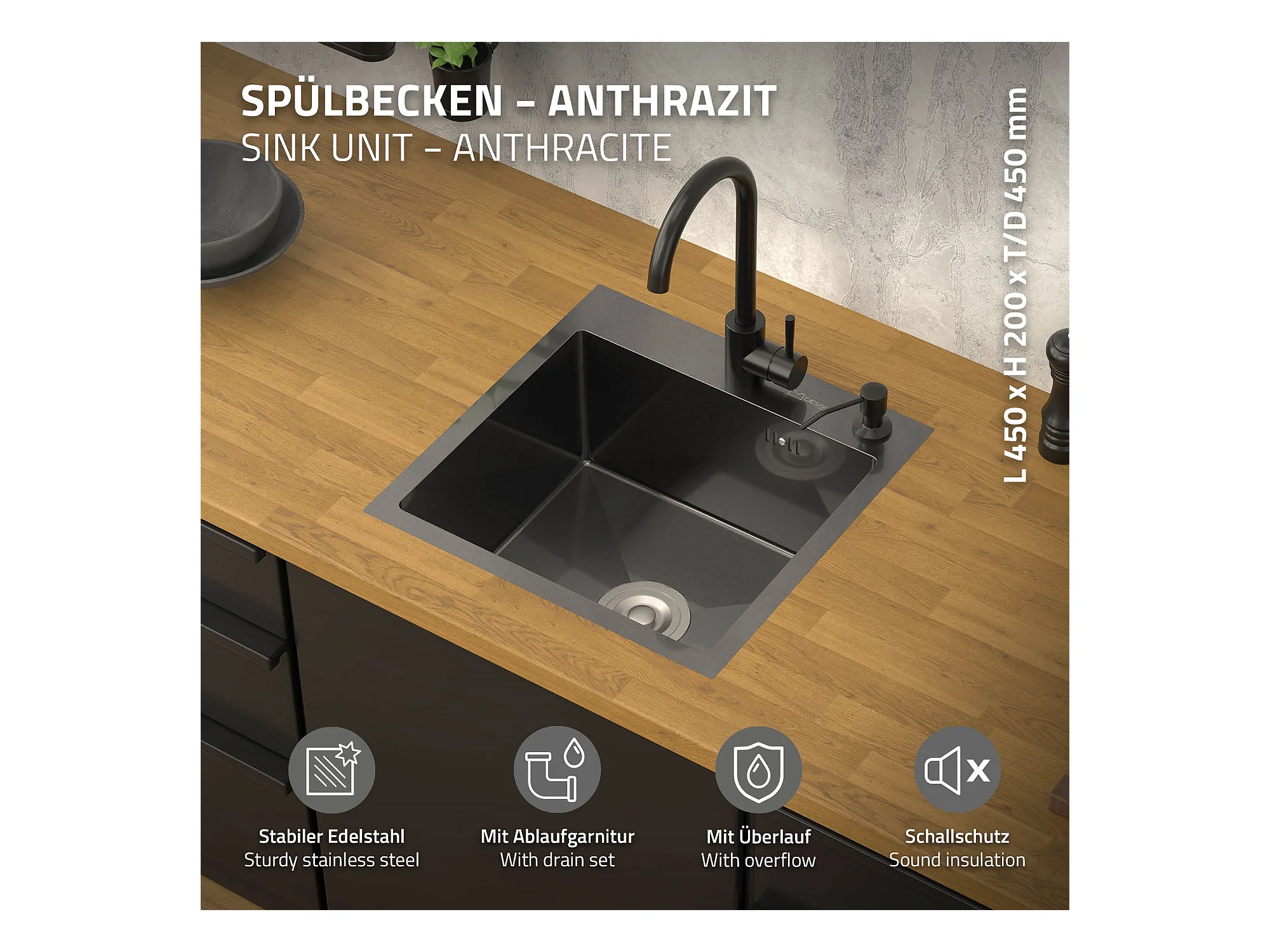 Évier de cuisine à encastrer acier anthracite 55x45 cm vidage+distributeur savon