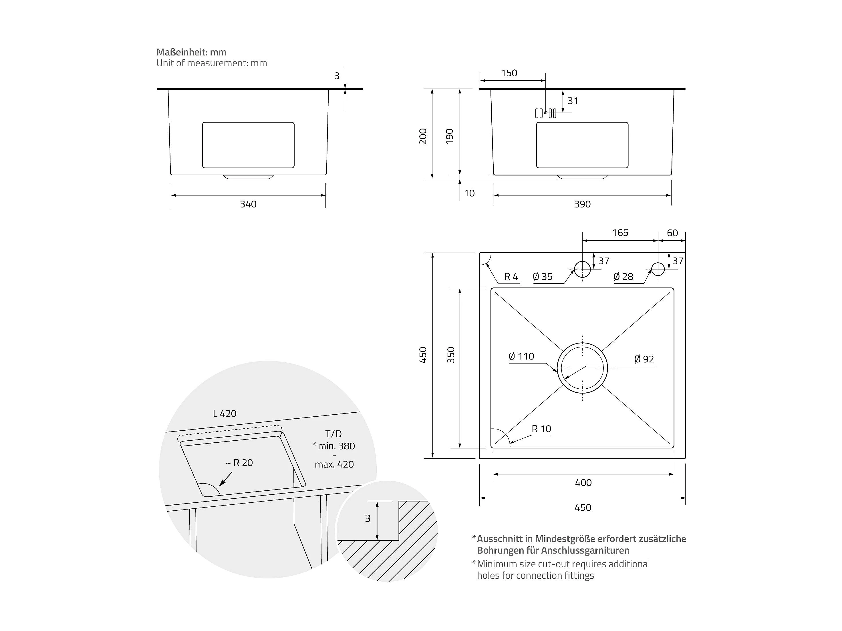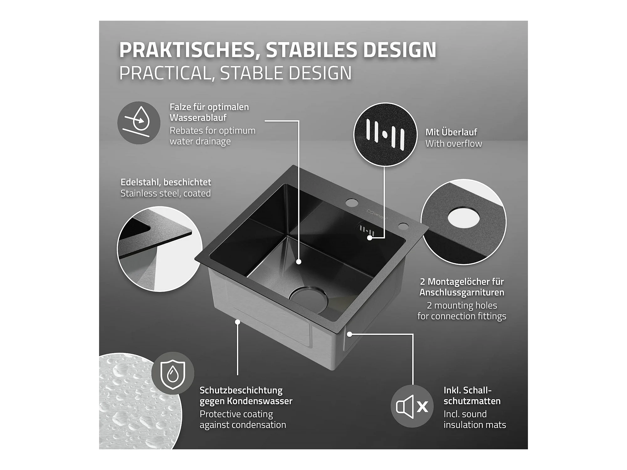 Évier de cuisine à encastrer anthracite 45x45 cm avec 2 trous vidage+trop plein
