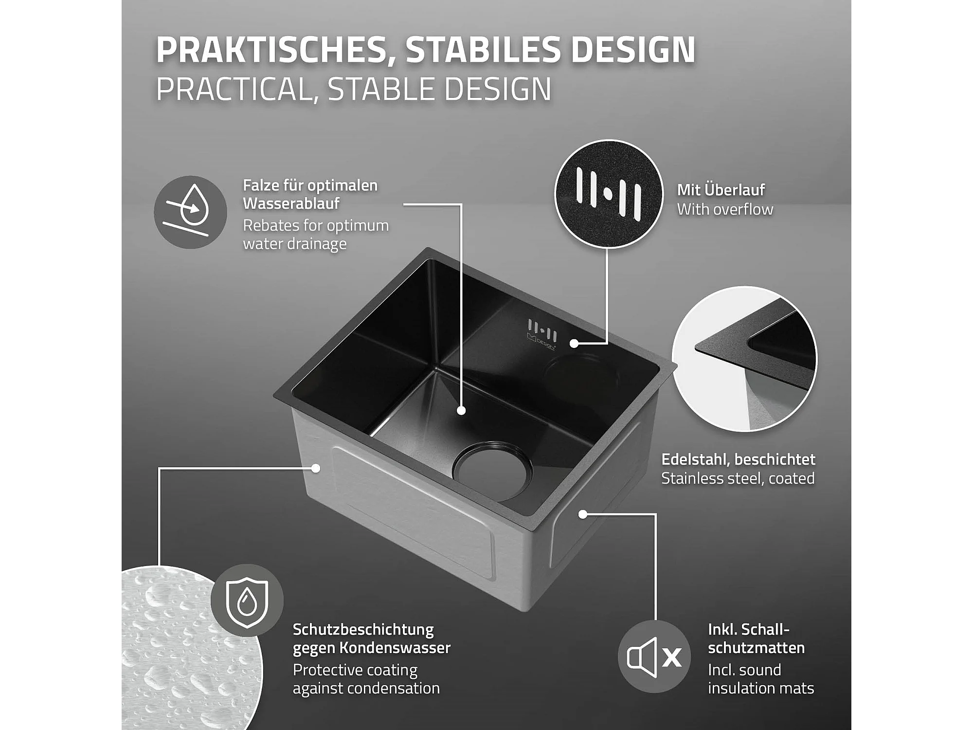 Évier de cuisine en acier inoxydable à encastrer anthracite avec vidage 40x34 cm