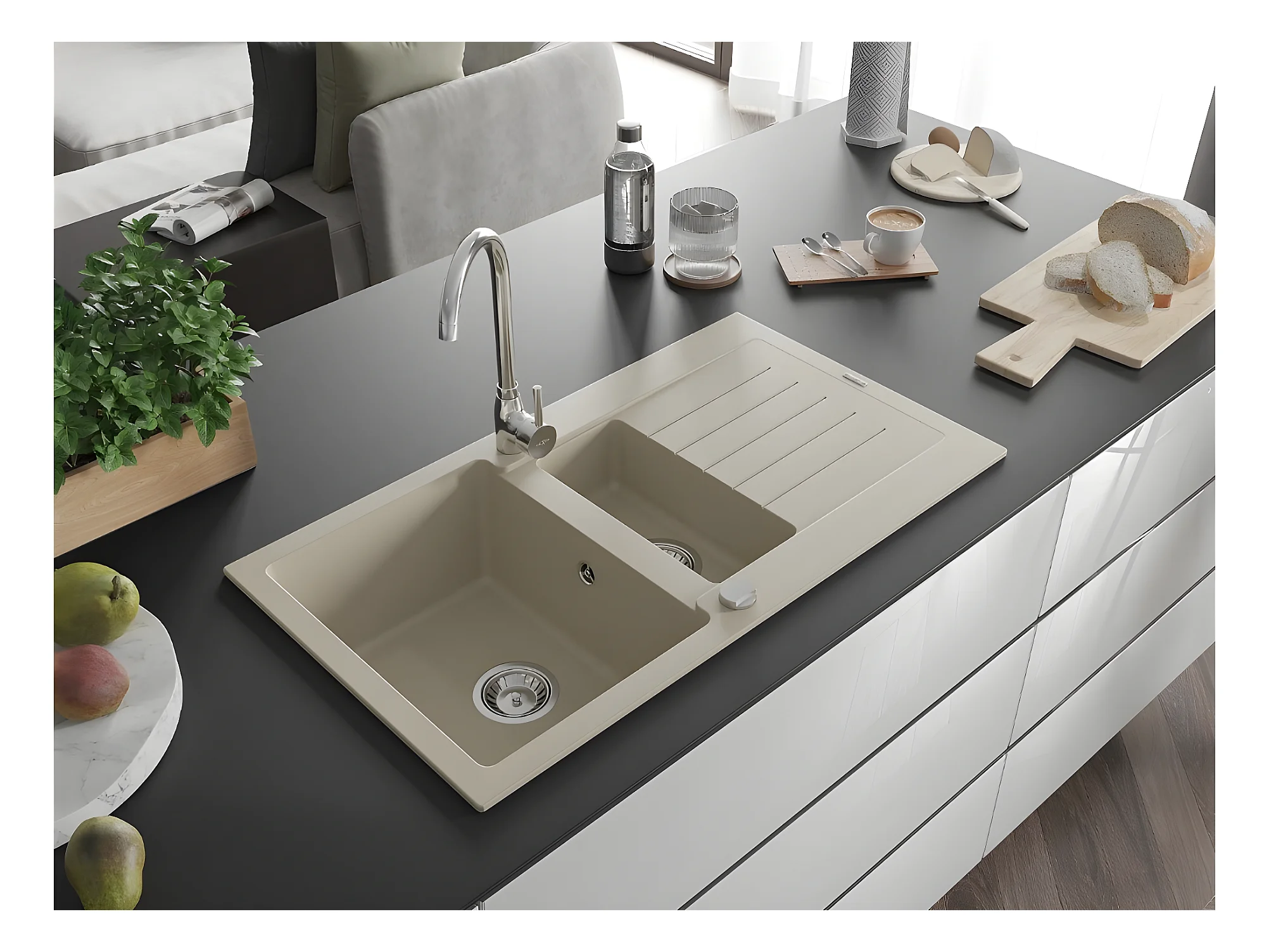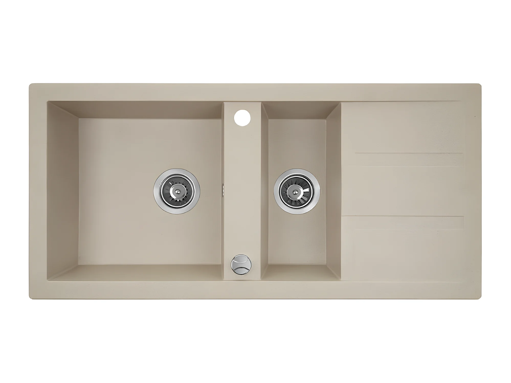 Evier de cuisine en granit beige - BARBADOS - 48 x 100 cm, 1.5 bac avec égouttoire