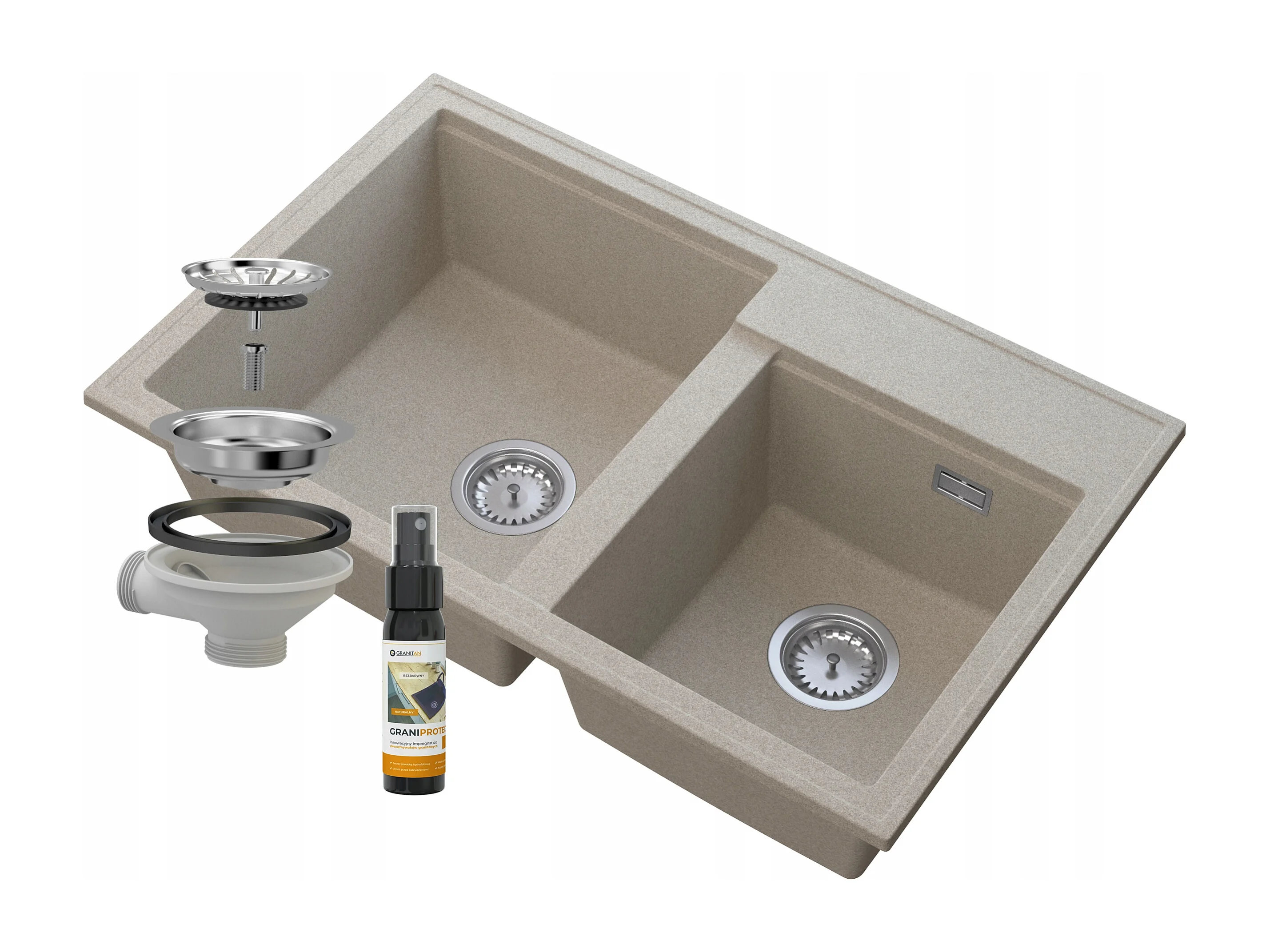 ÉVIER DOUBLE BAC GRANITE BEIGE SIPHON CHROME HECTOR
