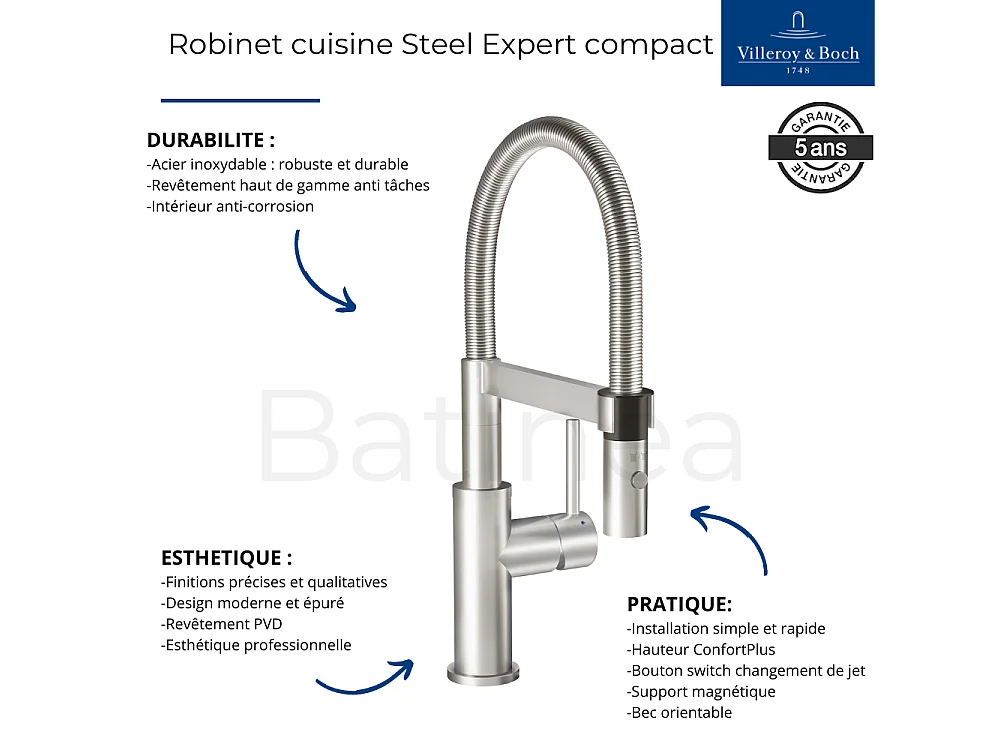 Evier VILLEROY ET BOCH Subway Pure 60 1 bac et demi égouttoir à droite vidage auto + Robinet Steel Expert Compact Anthracite