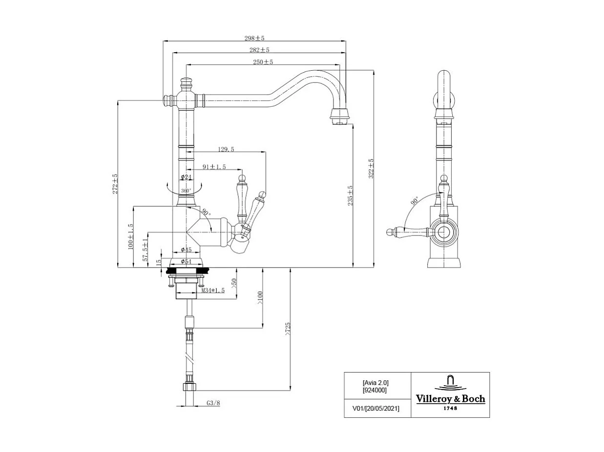 Evier VILLEROY ET BOCH Timbre d'office Tradition 1 bac vidage auto + Robinet de cuisine Avia 2.0 Bronze