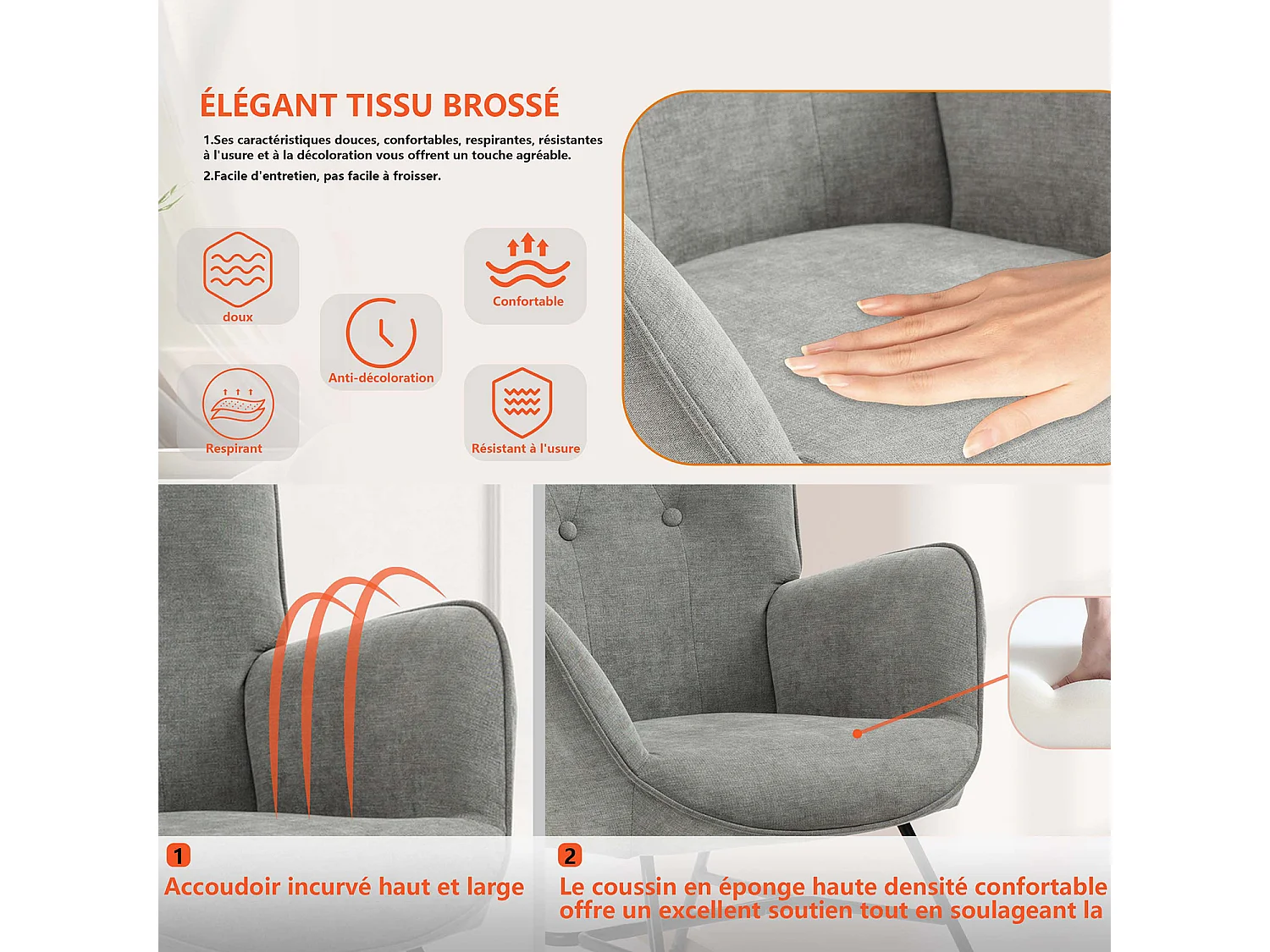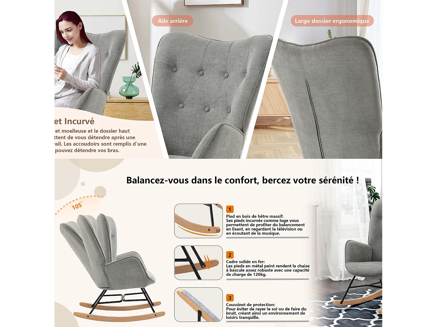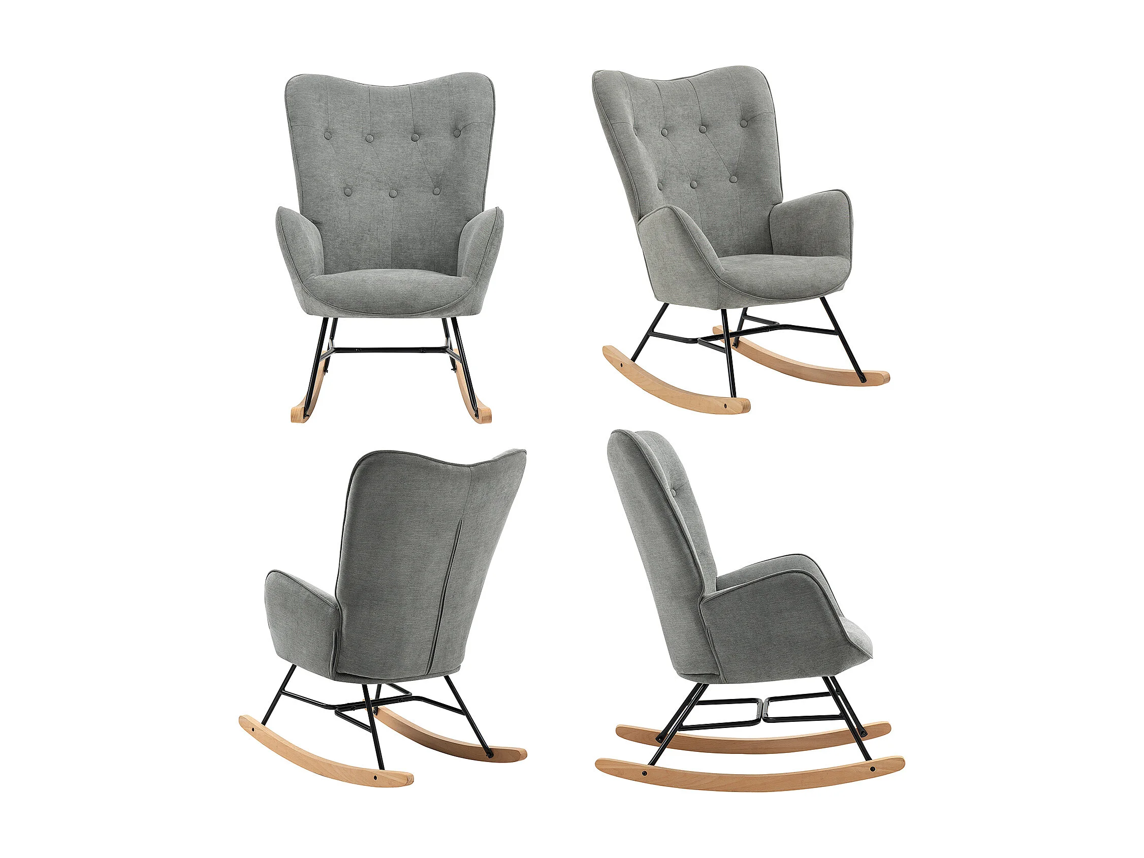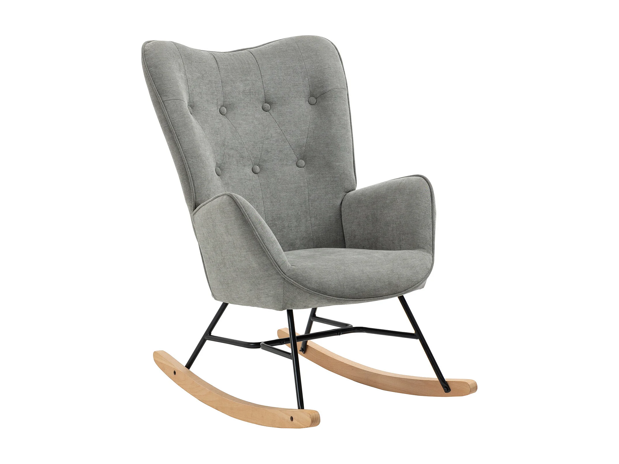 Fauteuil à Bascule Allaitement Scandinave Chaise Loisir et Repos en Tissu avec Pieds en E' Bois Métal pour Salon, Chambre, Massif, Gris Clair
