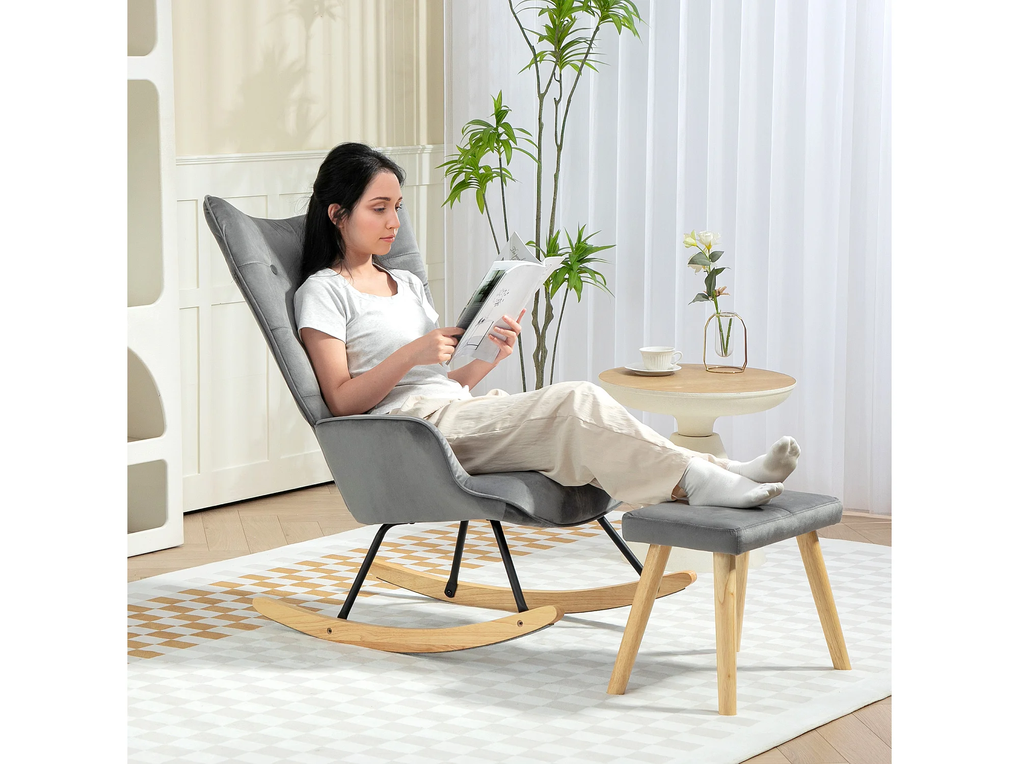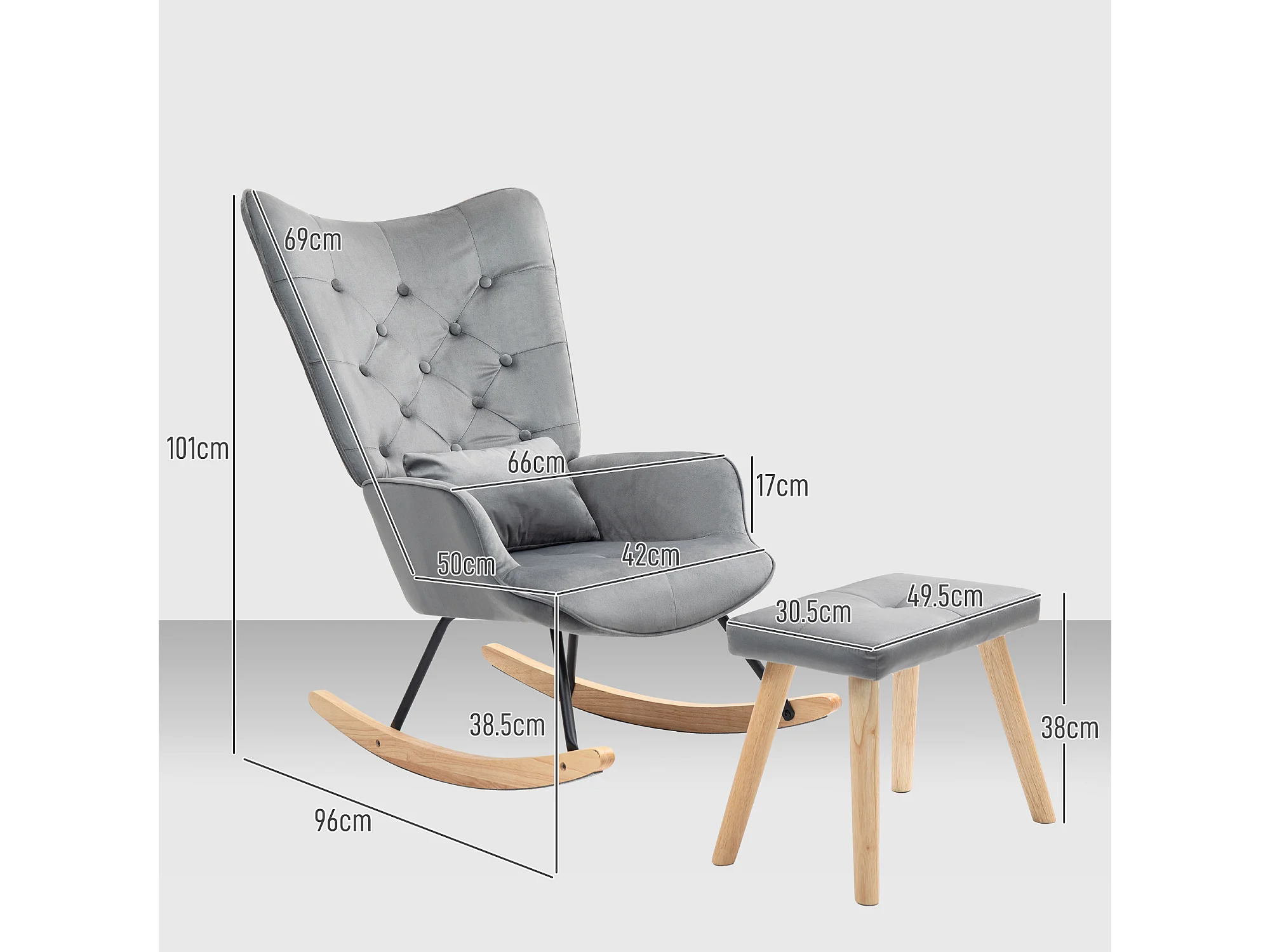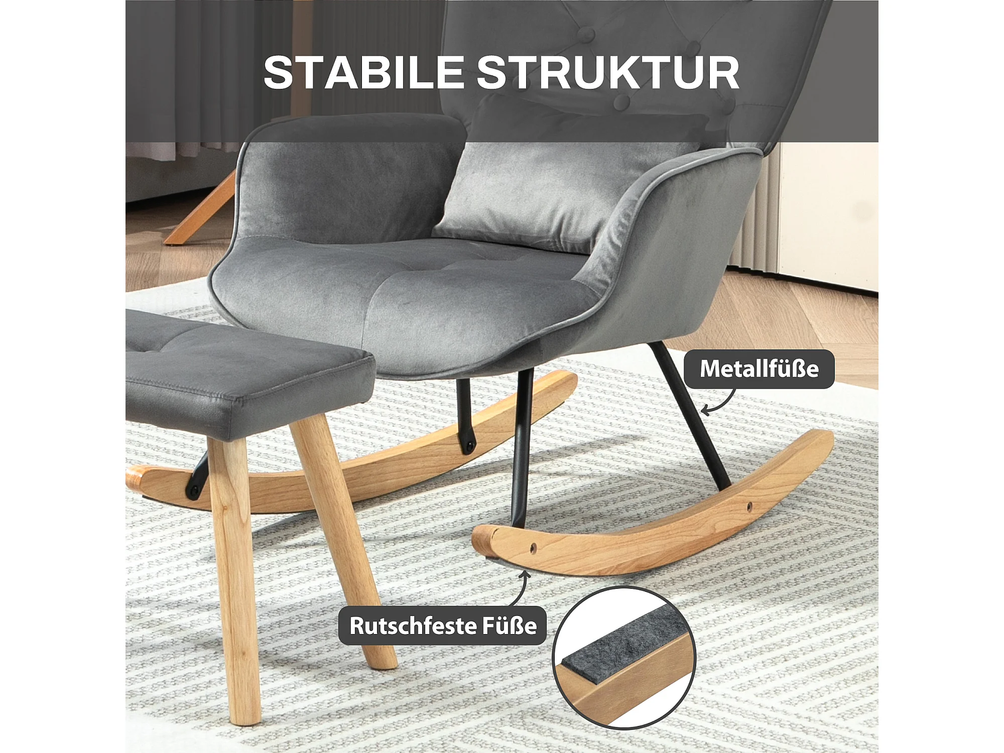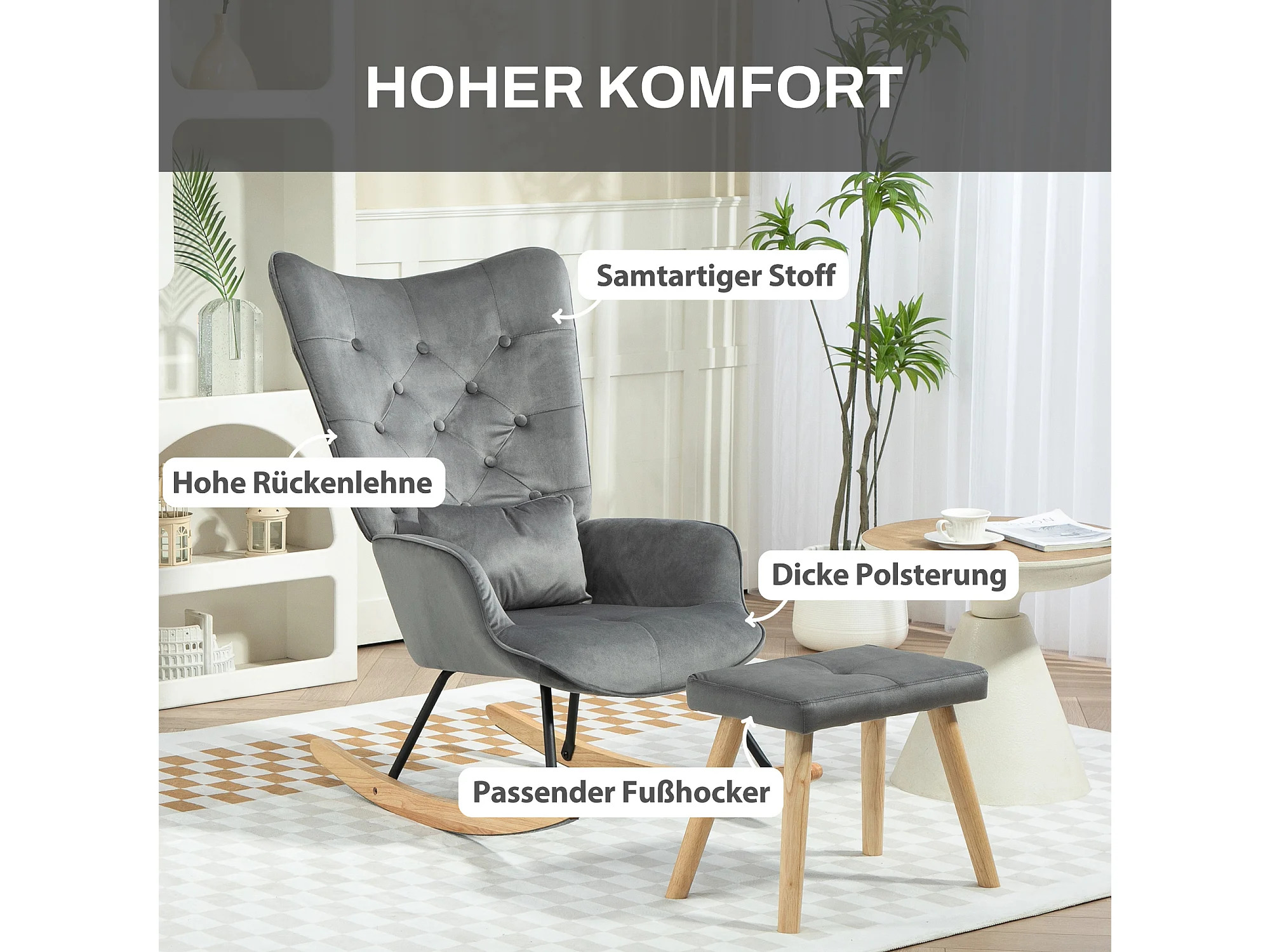 Fauteuil à bascule avec pouf, tissu velours, pieds en bois, gris foncé (66x96x101 cm)