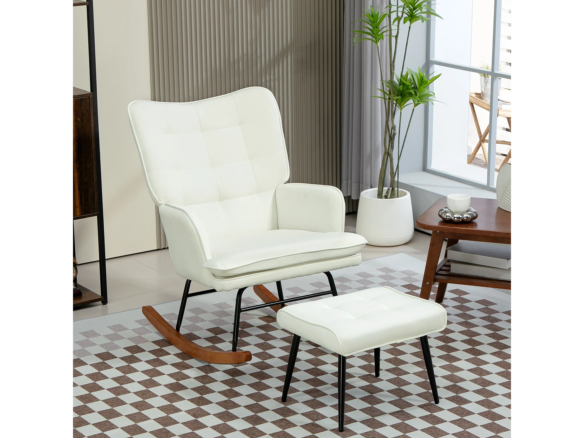 Fauteuil à bascule avec repose-pieds, structure en bois et acier, tissu polyester crème (64x89x90 cm)
