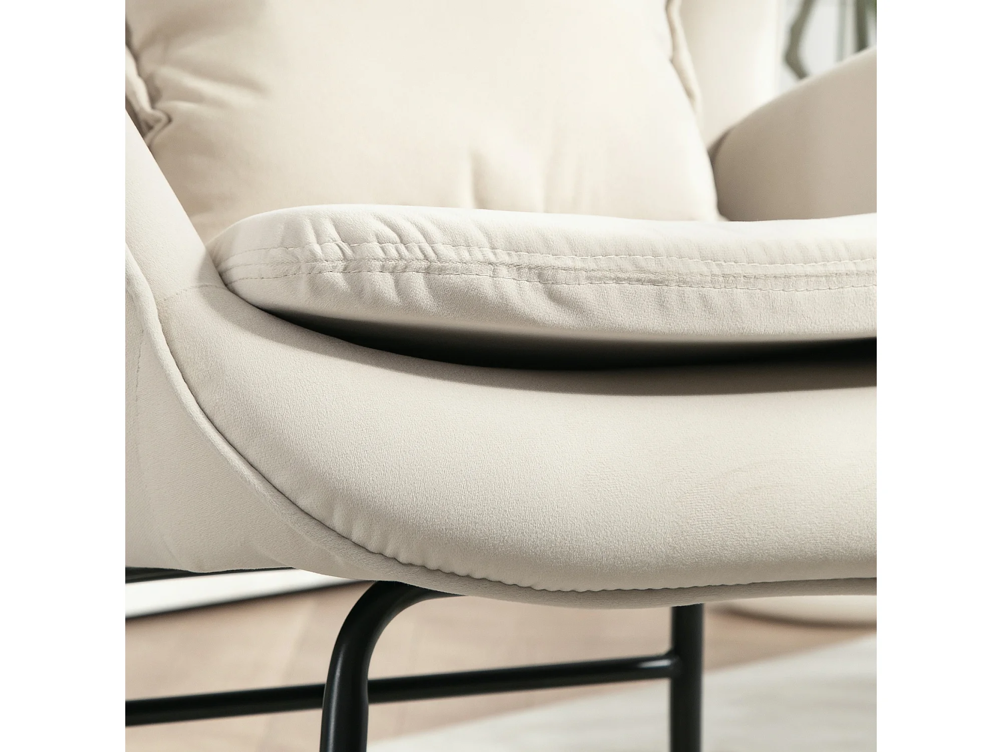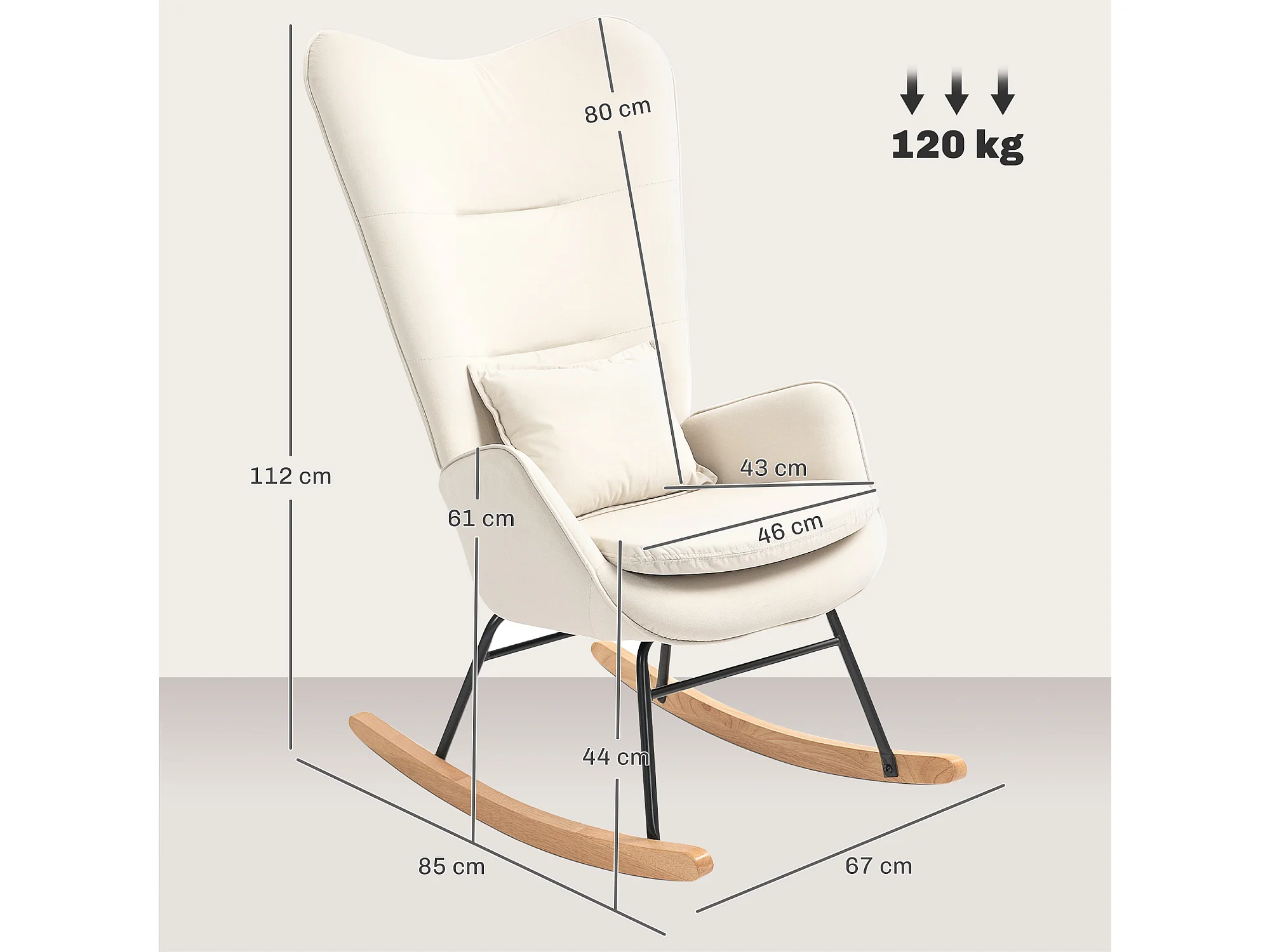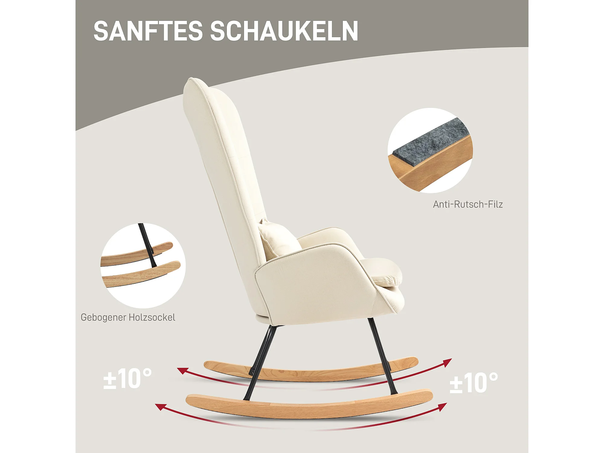 Fauteuil à bascule blanche avec coussin lombaire, accoudoirs et dossier haut, base en bois