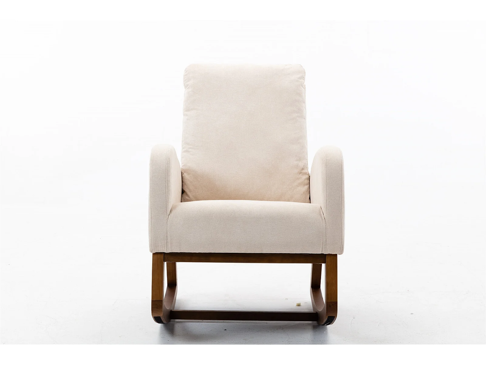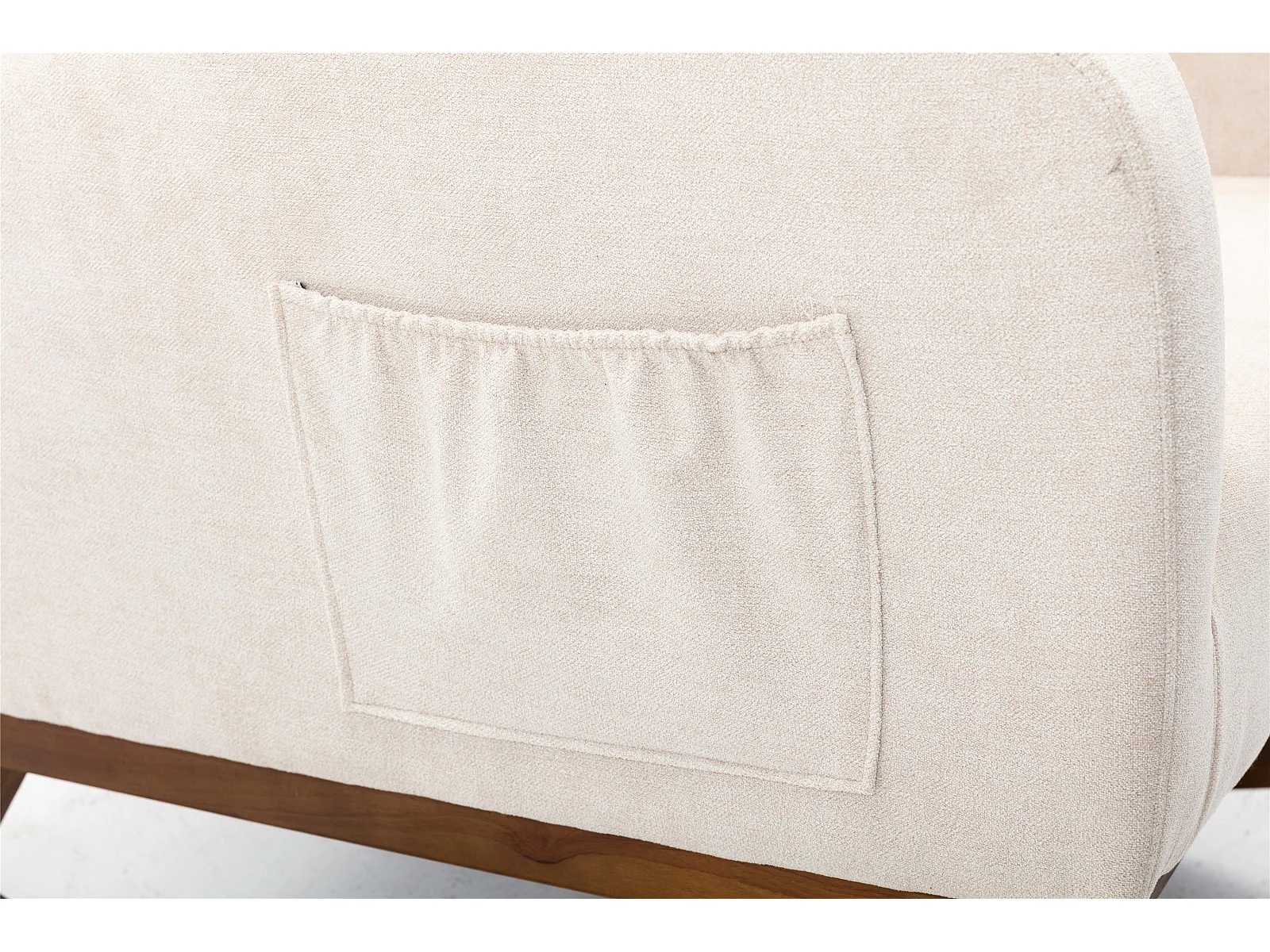 Fauteuil à bascule en tissu avec 1 poche latérale + accoudoirs et dossier rembourré, pieds en bois massif naturel, beige