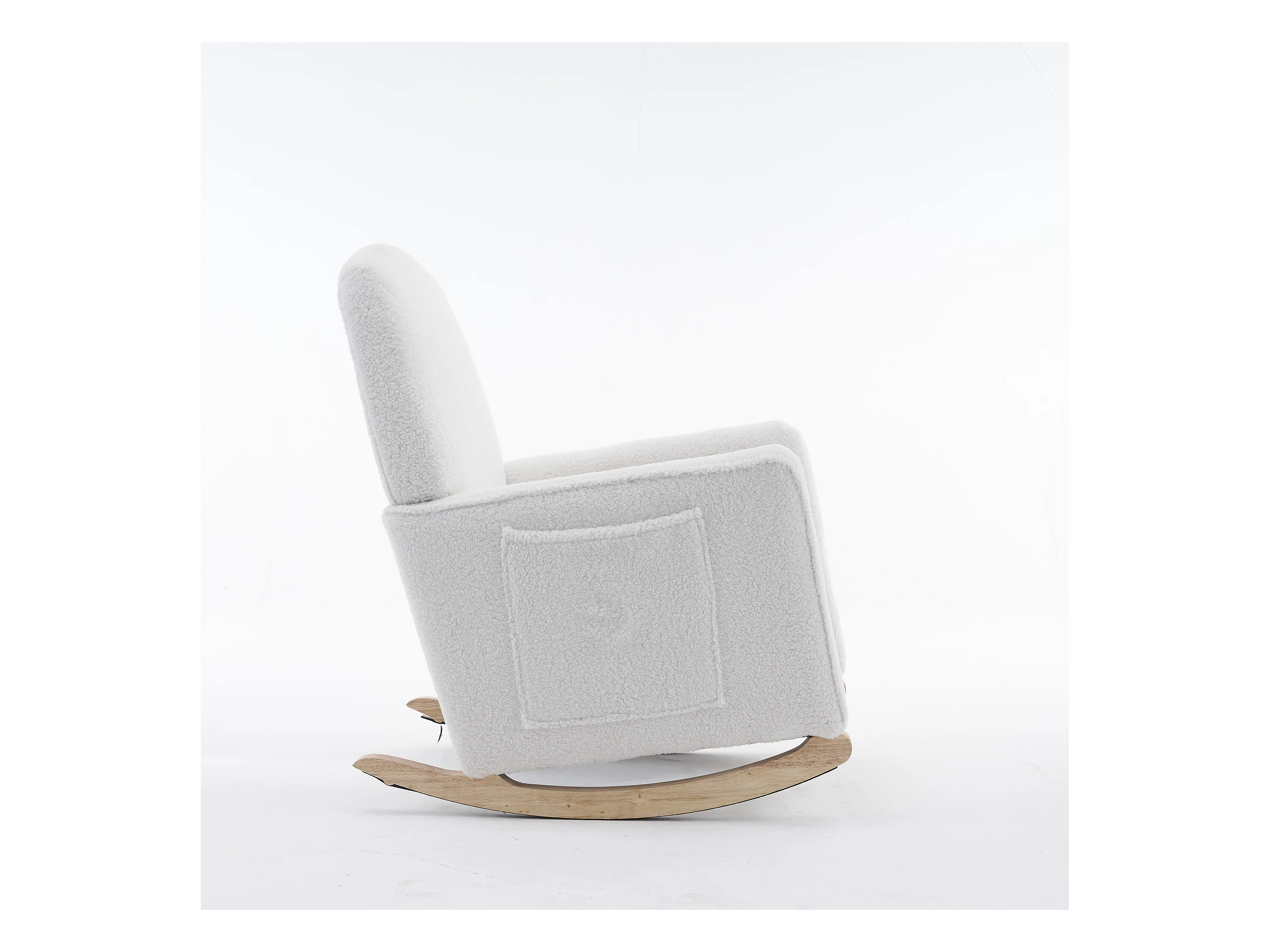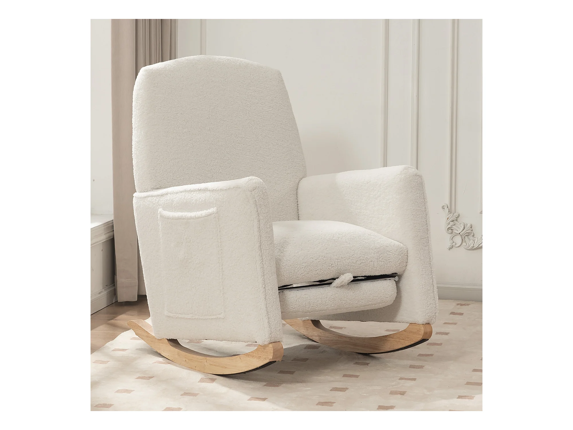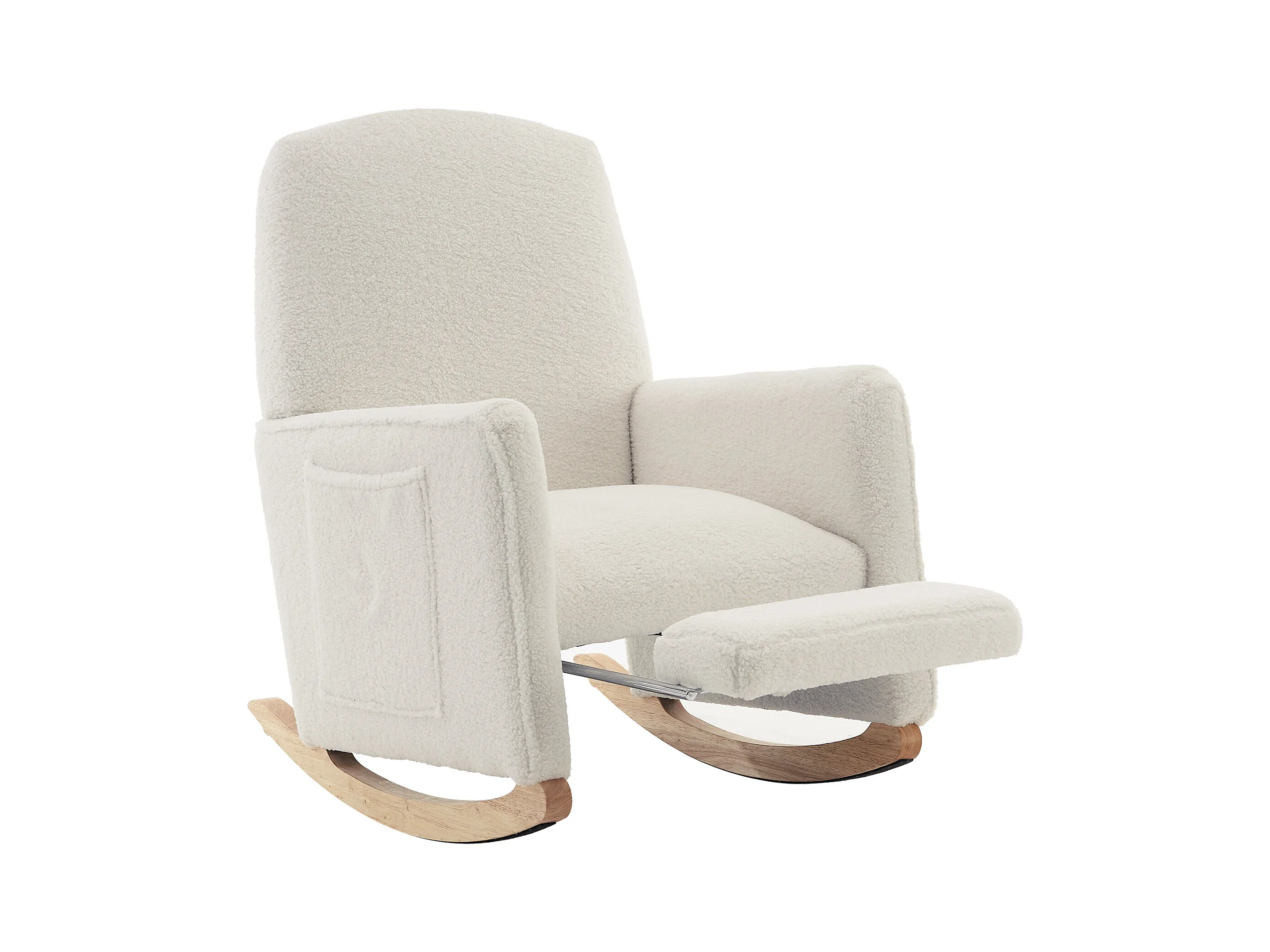 Fauteuil à bascule en Tissu Teddy blanc, rocking chair avec Repose-pieds rétractable, pieds en bois