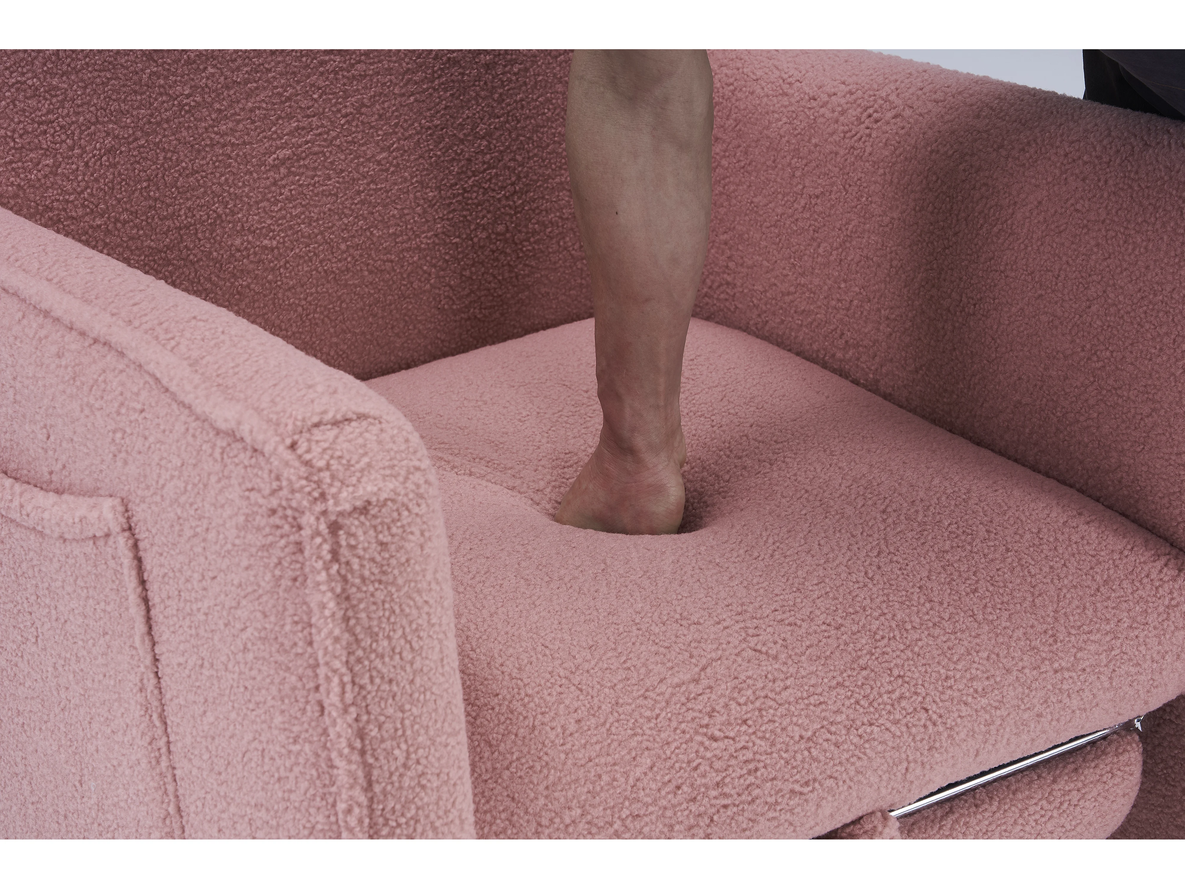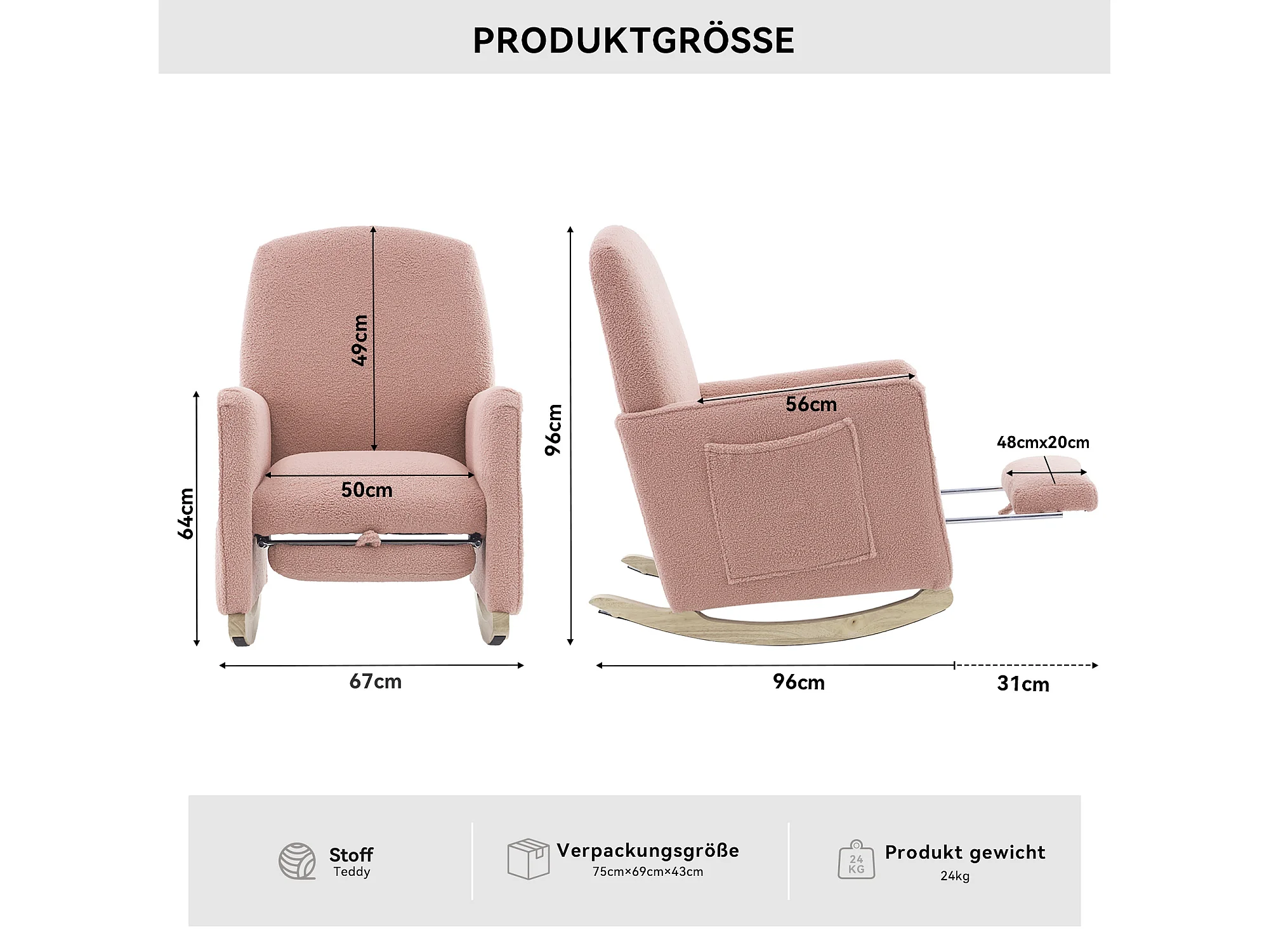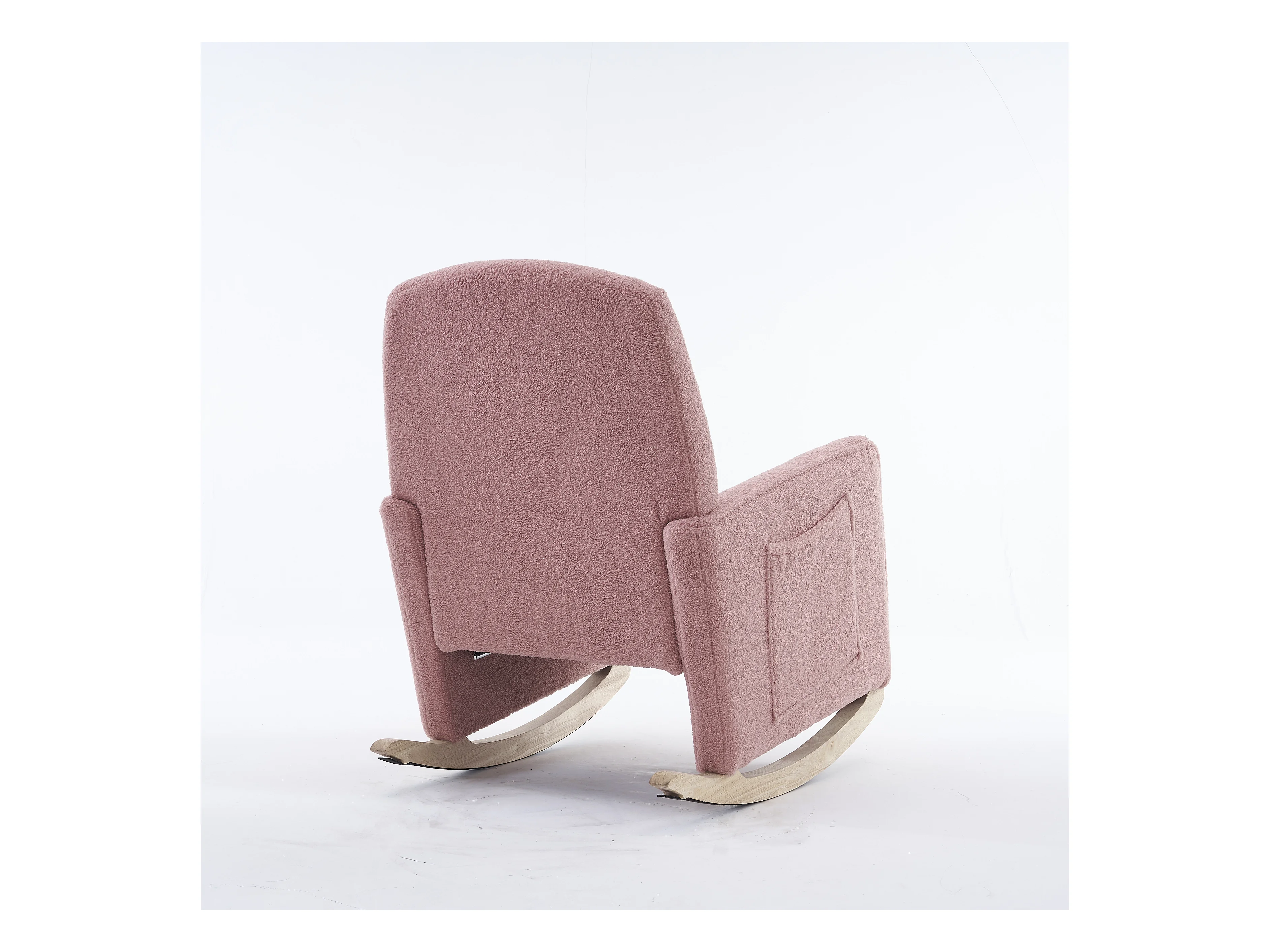Fauteuil à bascule en Tissu Teddy rose, rocking chair avec Repose-pieds rétractable, pieds en bois