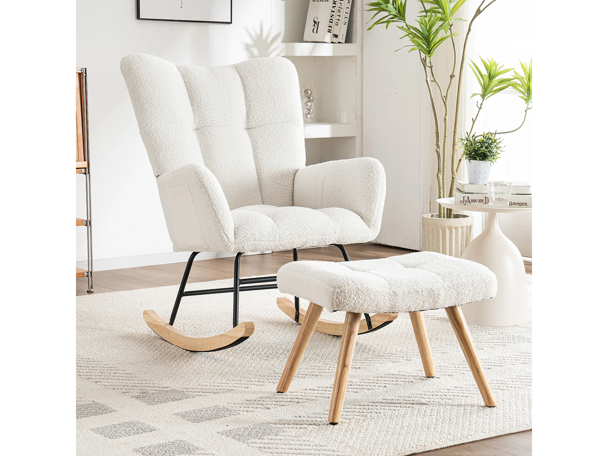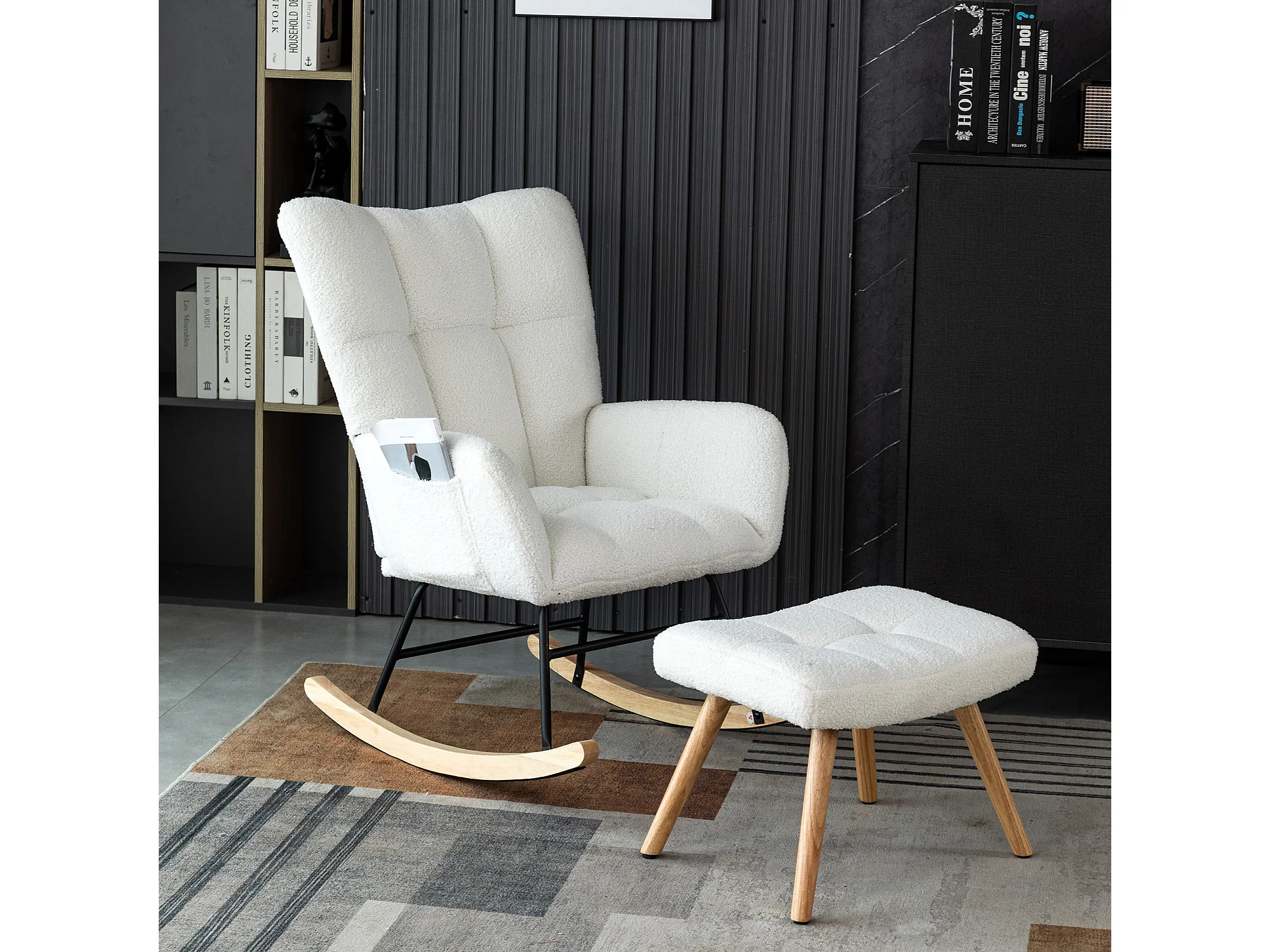 Fauteuil à bascule ergonomique, avec repose-pieds manuel, cadre en bois, tissu Tissu peluche, blanc (92x58x100 cm)