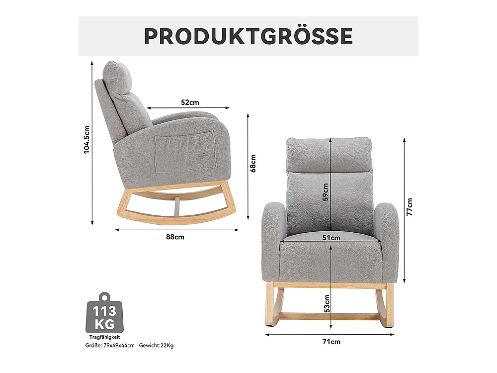 Chaise Berçante Mid-Century Moderne en Tissu Tissu peluche, Accoudoirs Rembourrés, Gris (88x71x104.5 cm)