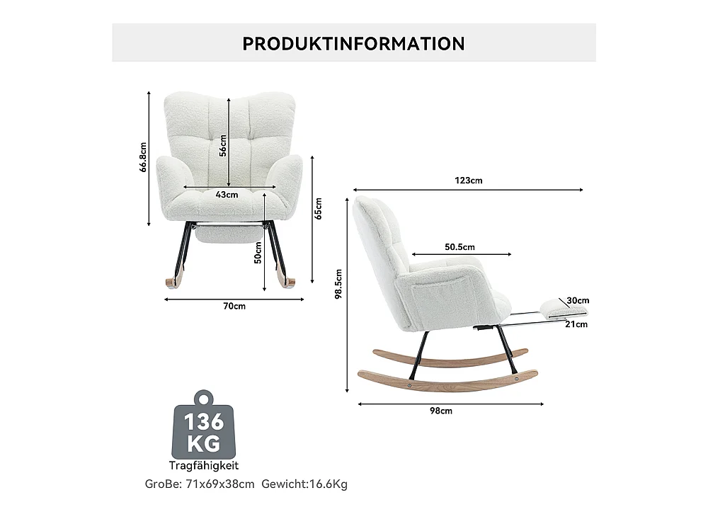 Chaise Berçante Moderne avec Tissu Tissu peluche, Repose-Pieds Escamotable, Rembourré, Blanc (80x98x98.5 cm)