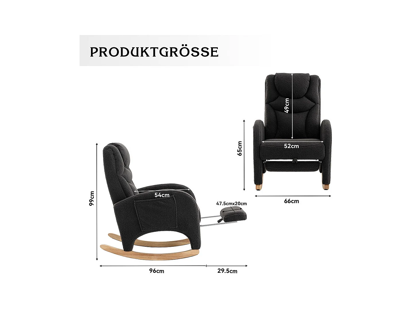 Fauteuil à bascule avec Poufe, Relax fauteuil, haut dossier, en Tissu peluche gris foncé (66x125x101 cm)