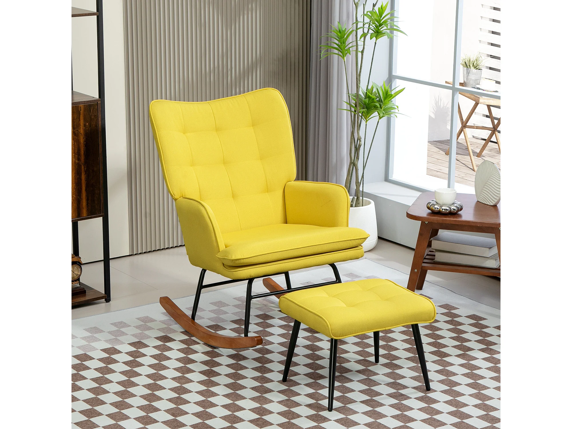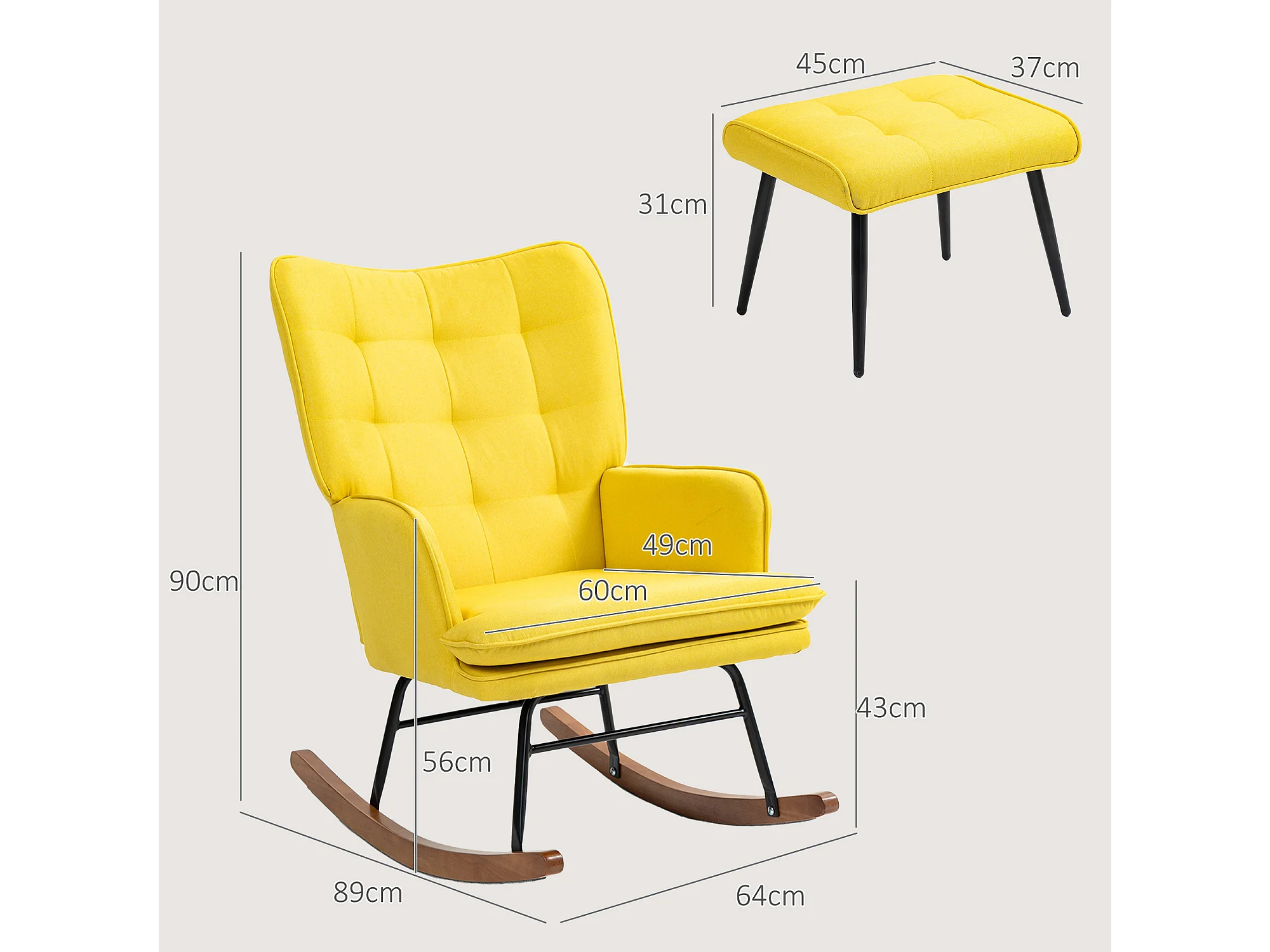 Fauteuil à bascule, rocking chair avec tabouret en lin jaune, cadre en acier et pieds en bois