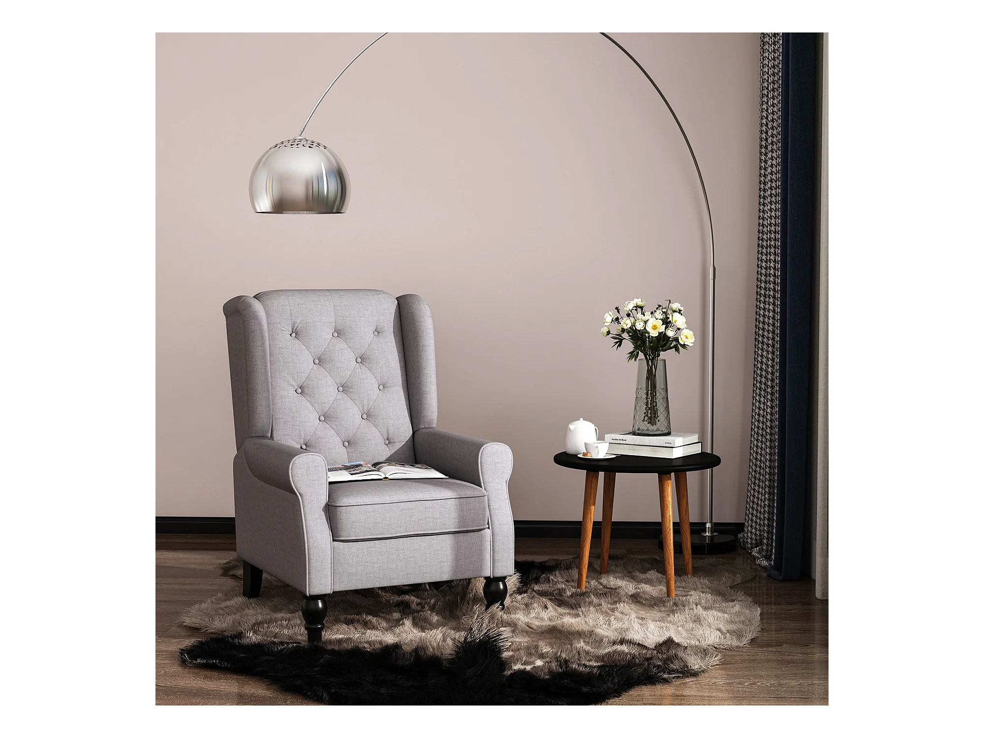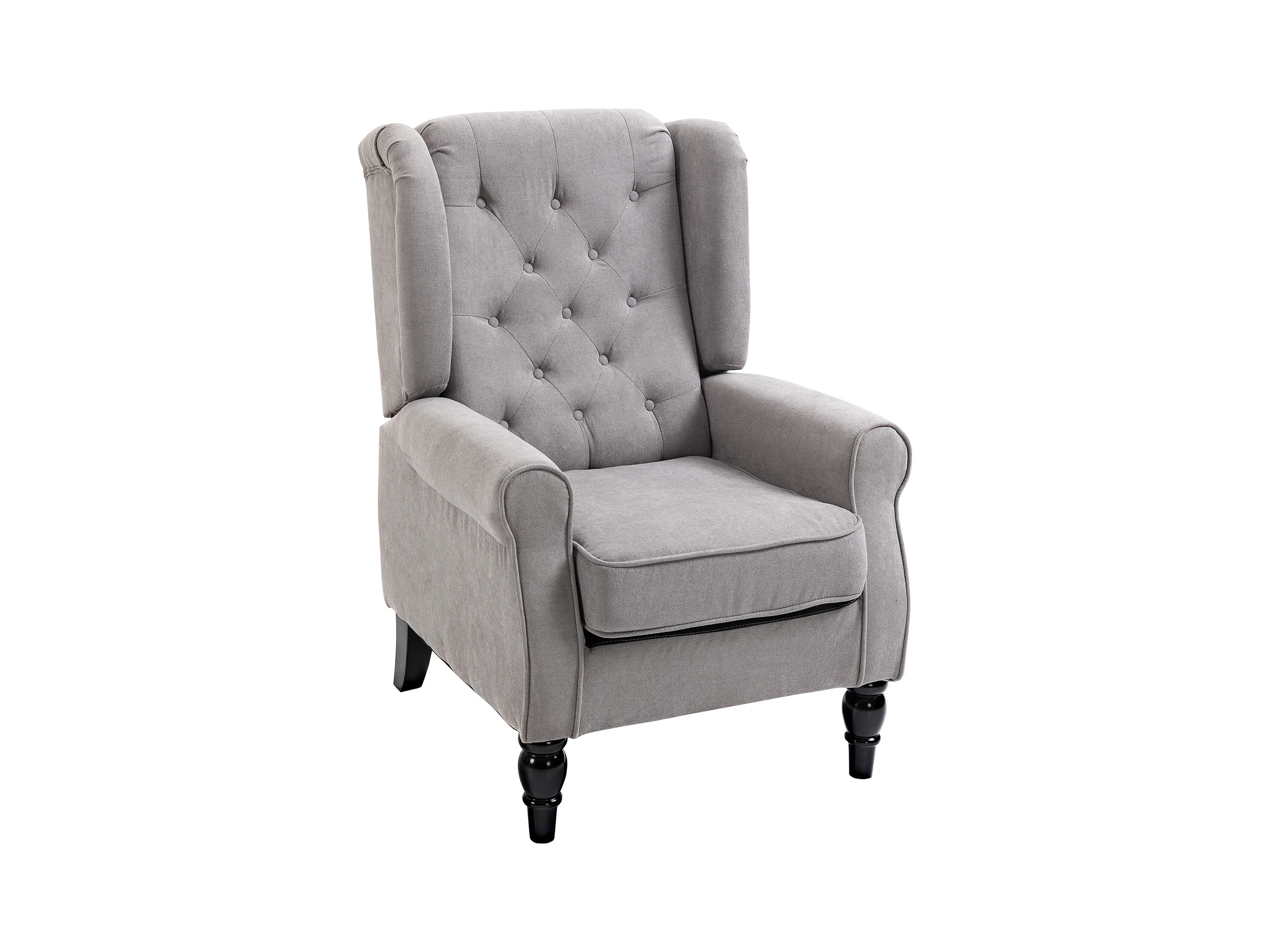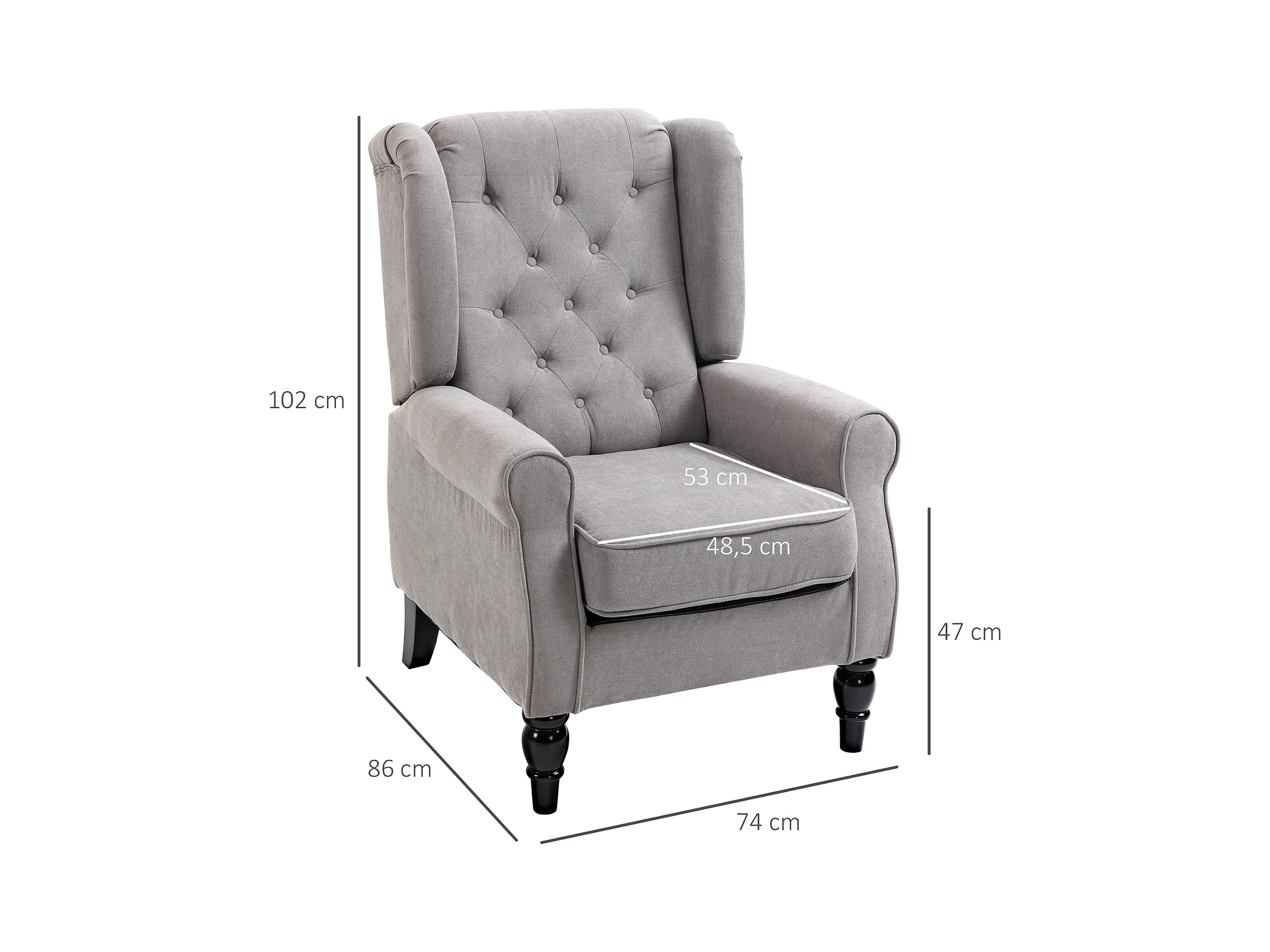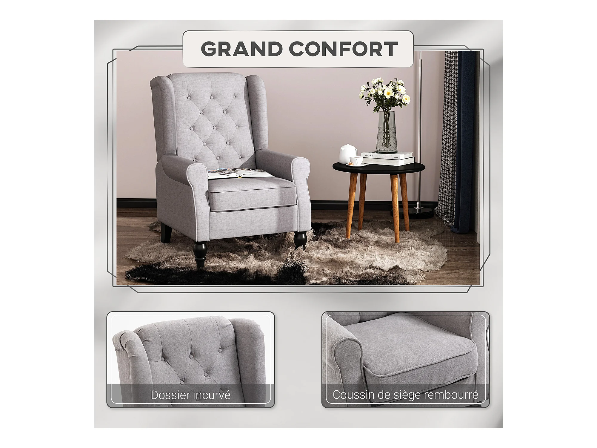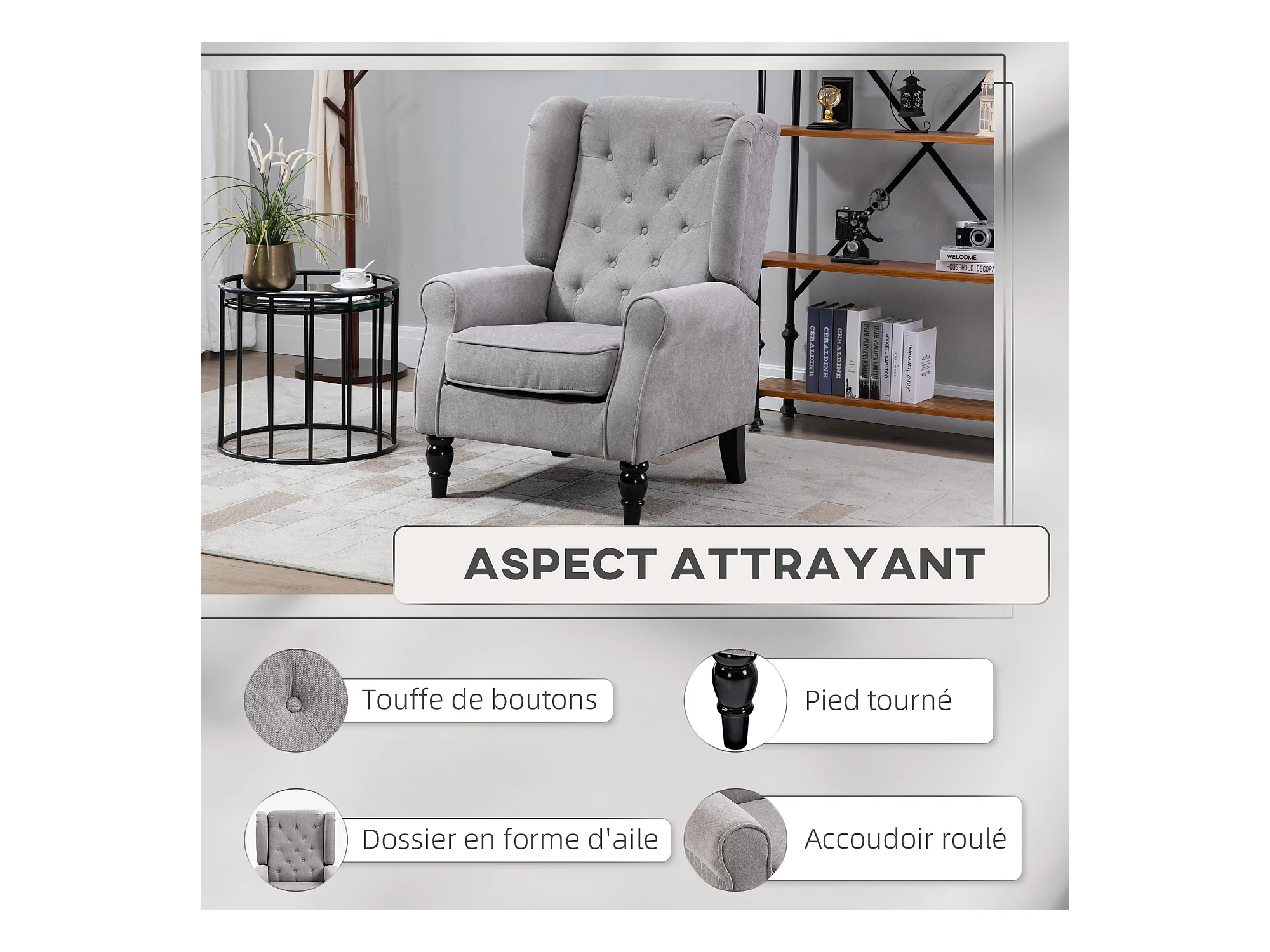 Fauteuil à oreilles style Chesterfield dossier capitonné grand confort bois noir tissu gris clair