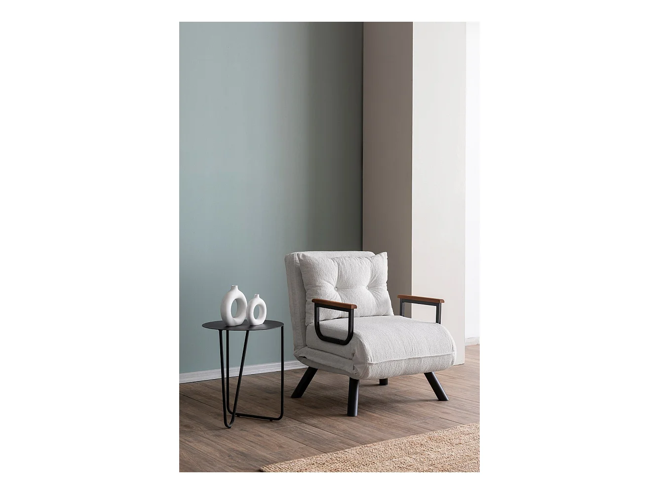 Fauteuil convertible Yolanda Métal Noir et Tissu bouclette Blanc crème
